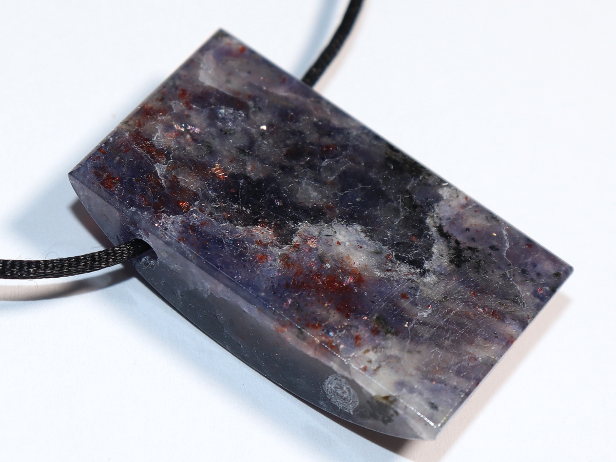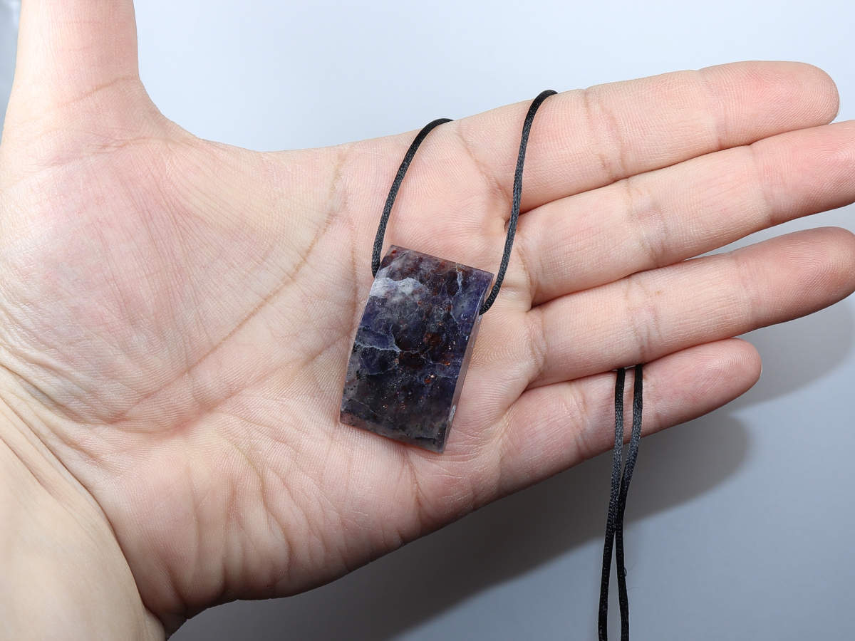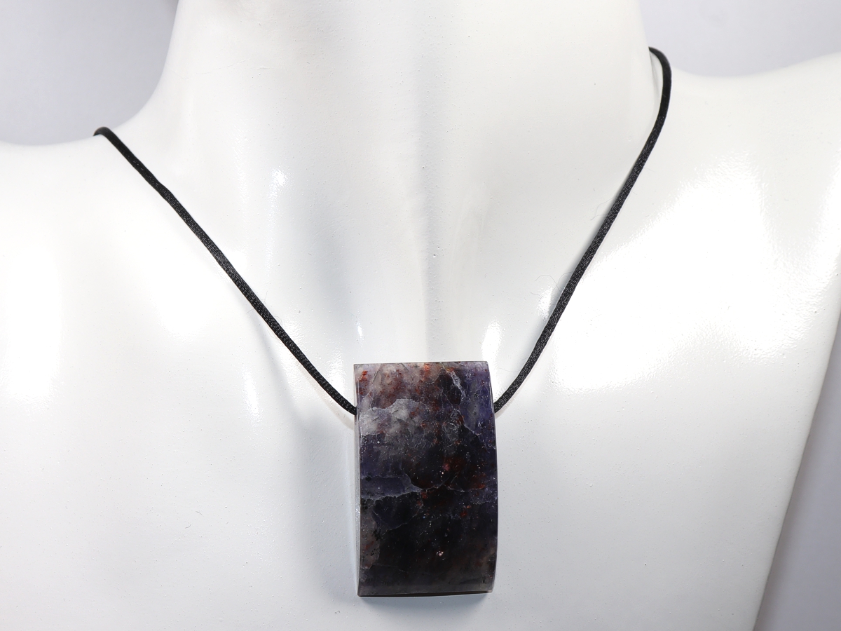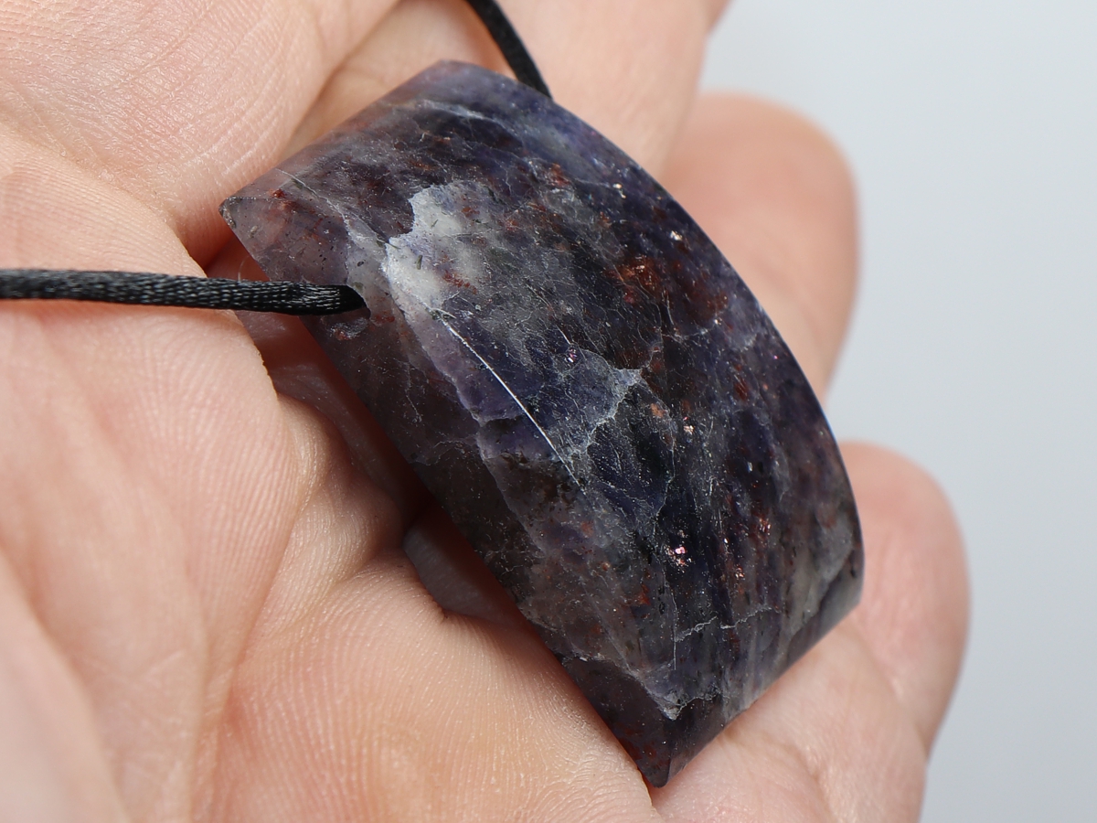 Die Halskette mit Iolith-Sonnenstein wird nach Ihren Angaben individualisiert. Sie haben die Wahl zwischen einem schwarzen Band mit einem Verschluss aus Edelstahl oder einer Kette aus Silber 925.