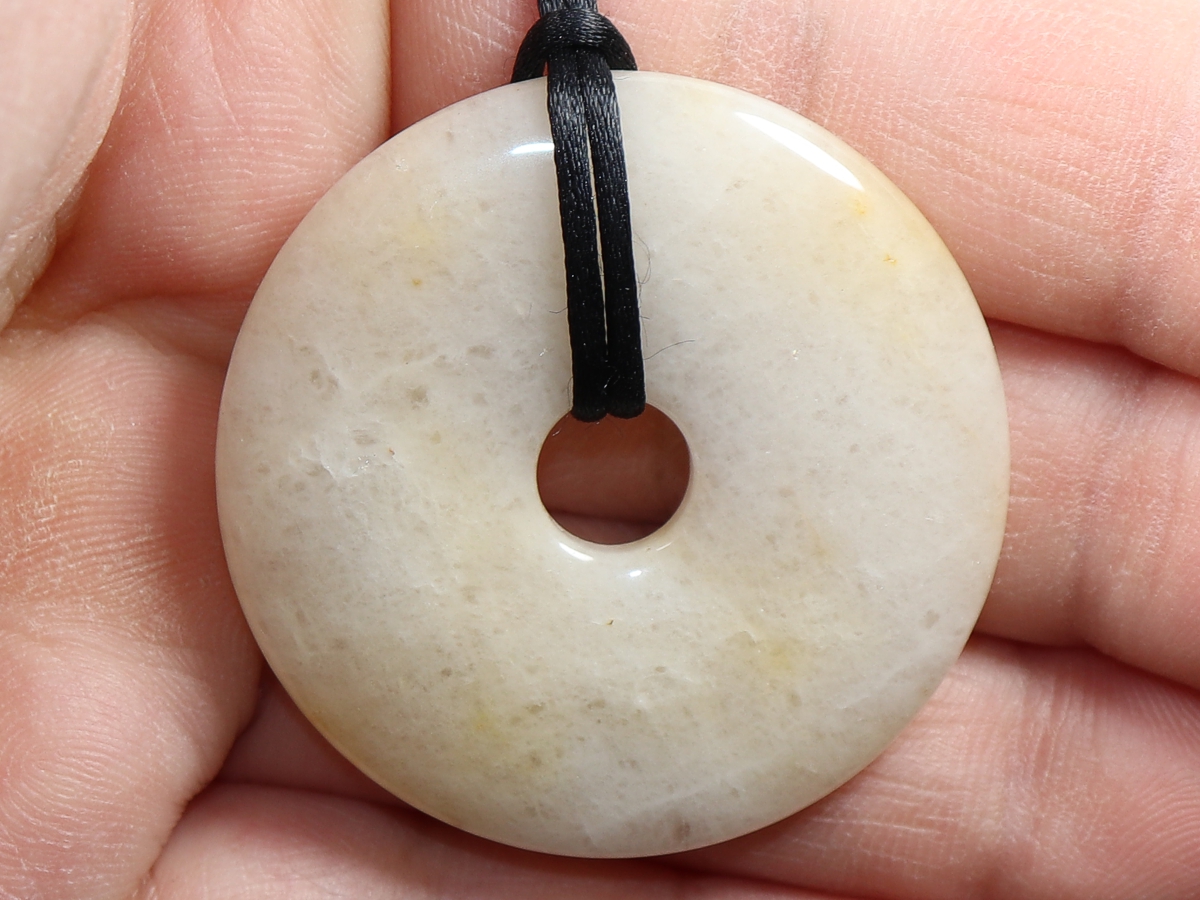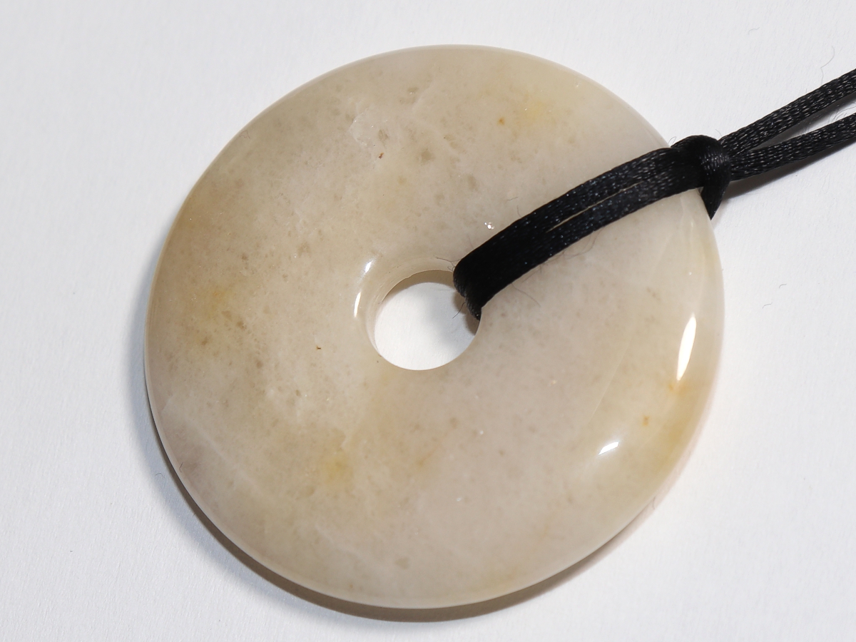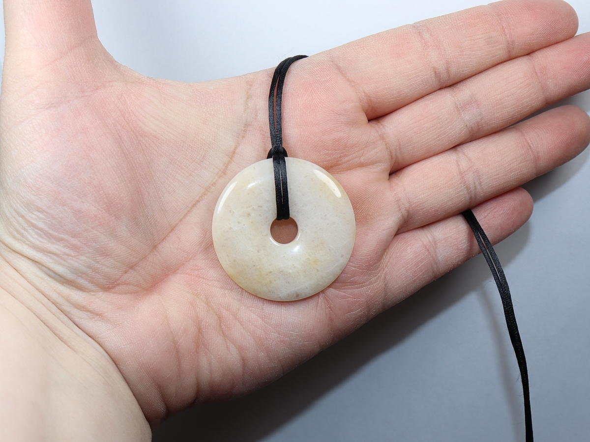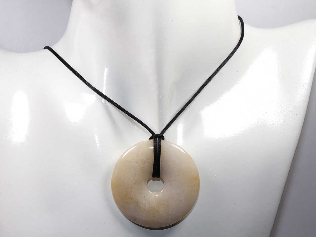 Die Halskette mit dem Donut aus Jade und einem schwarzen Band wird nach Ihren Angaben individualisiert. Der Verschluss ist aus Edelstahl.