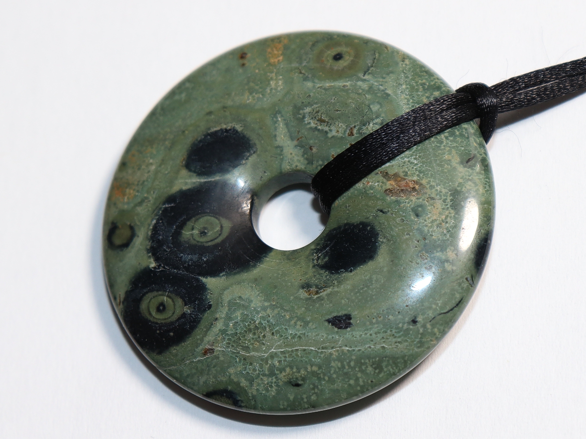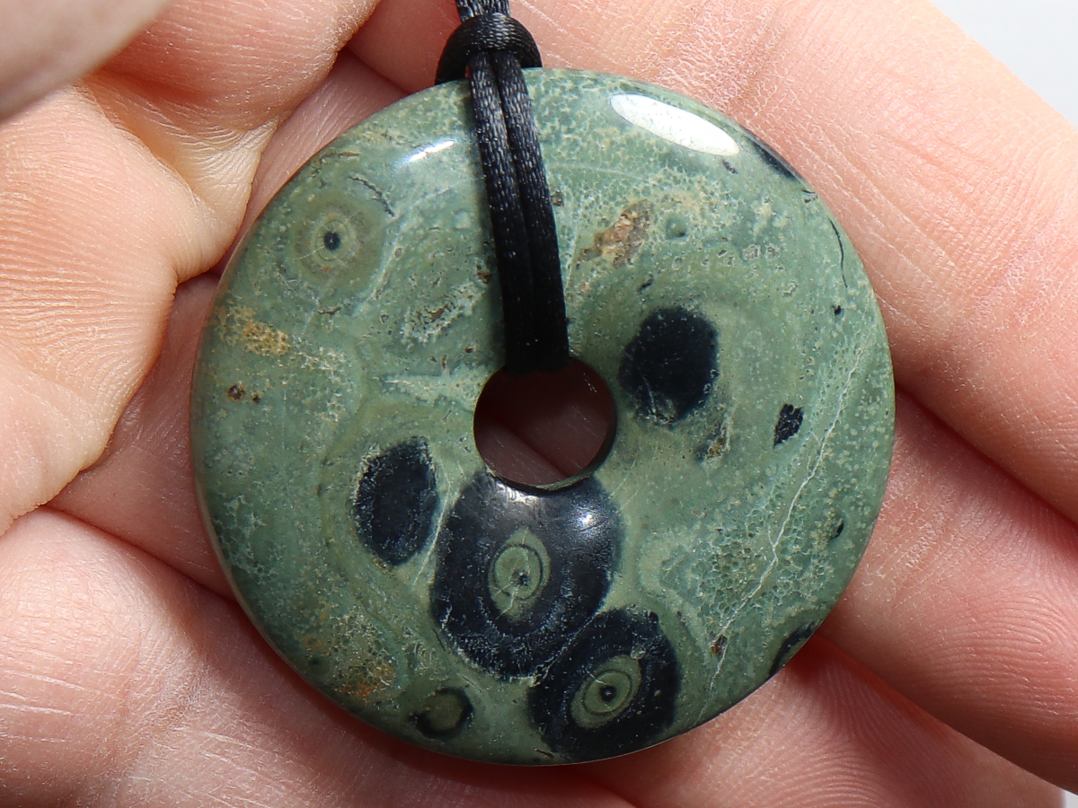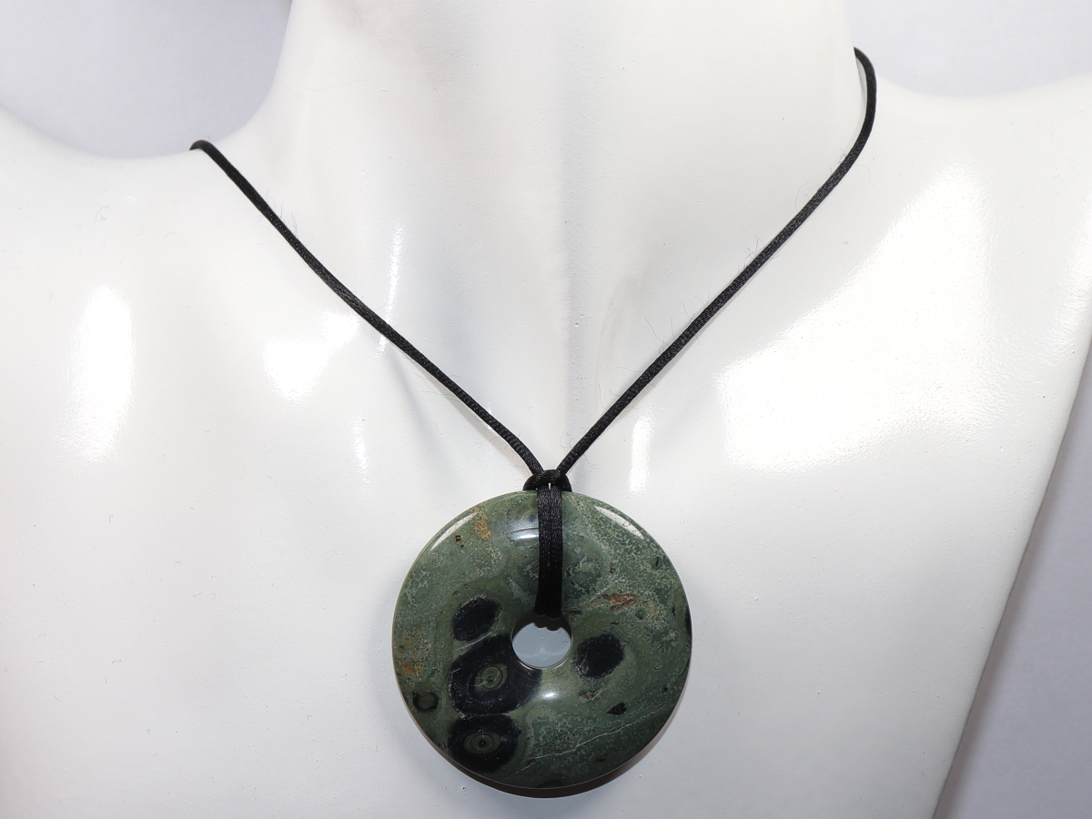 Die Halskette mit dem Donut aus Kambaba-Rhyolith und einem schwarzen Band wird nach Ihren Angaben individualisiert. Der Verschluss ist aus Edelstahl.