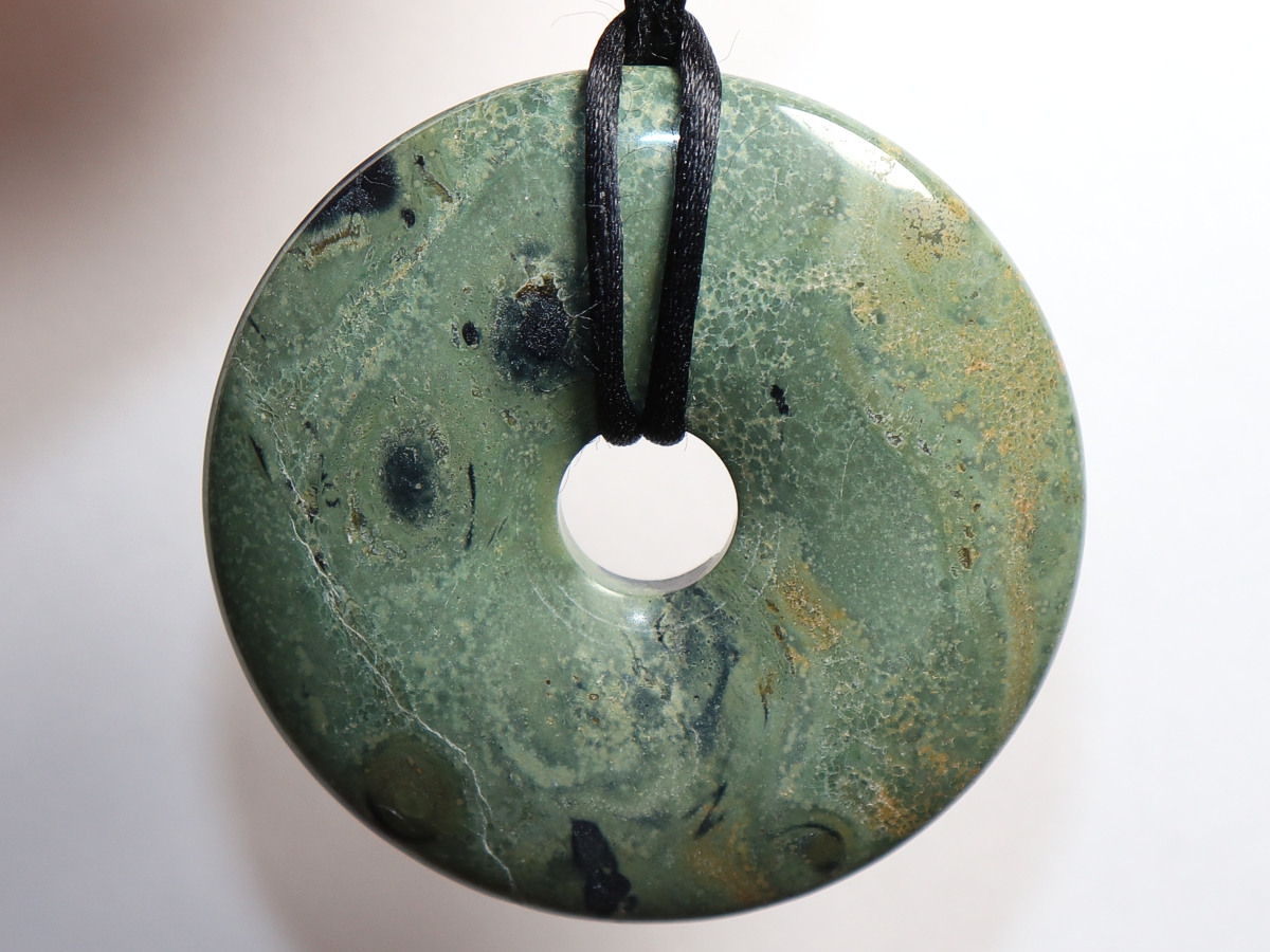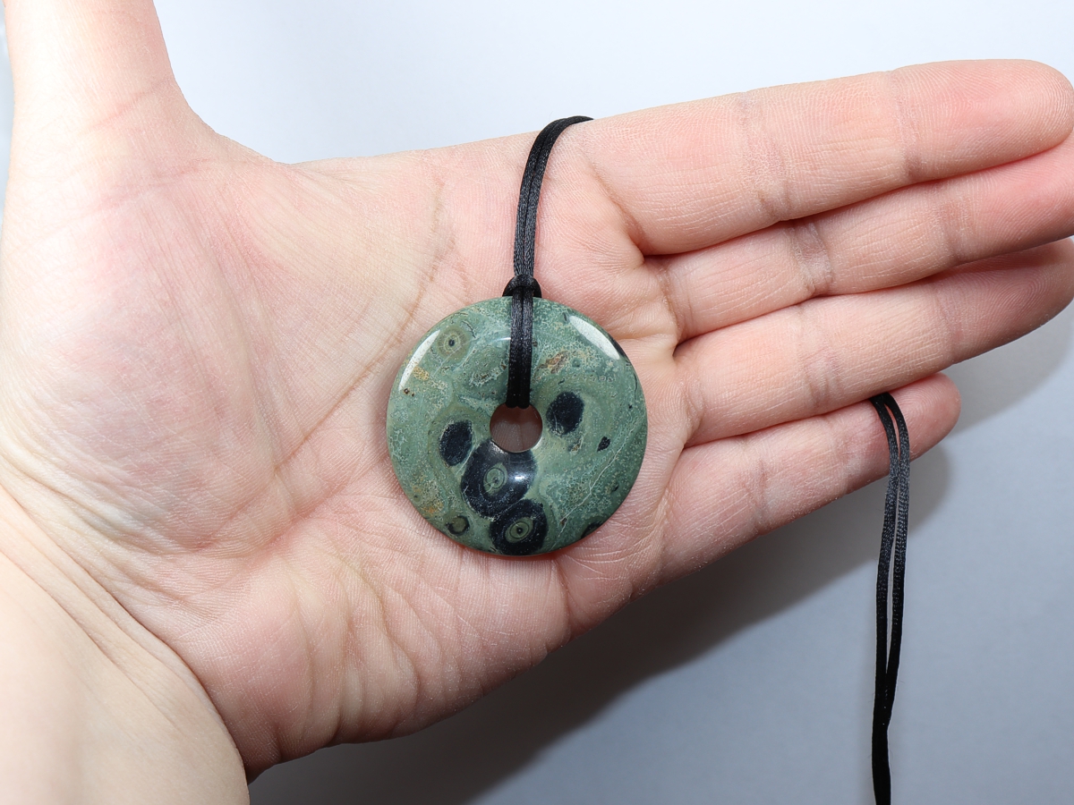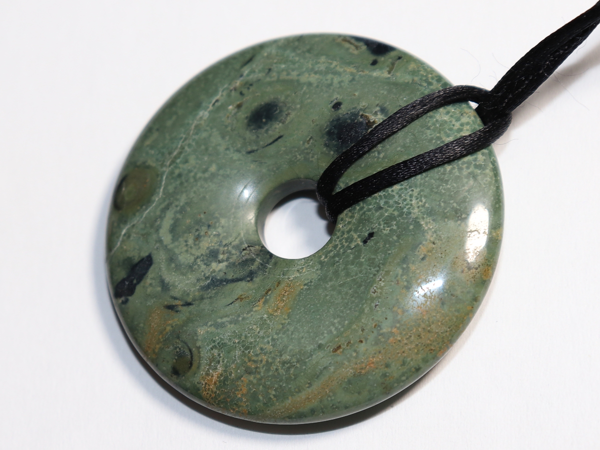 Die Halskette mit dem Donut aus Kambaba-Rhyolith und einem schwarzen Band wird nach Ihren Angaben individualisiert. Der Verschluss ist aus Edelstahl.