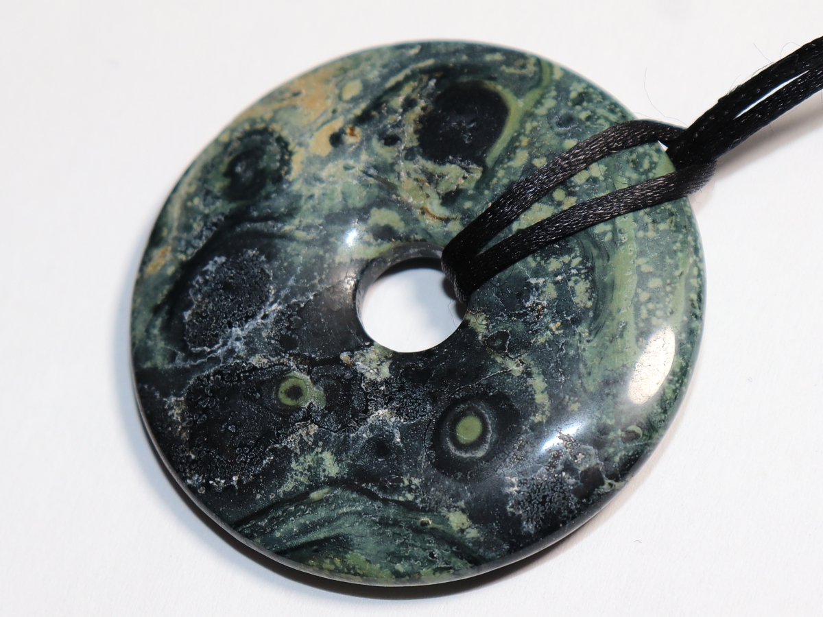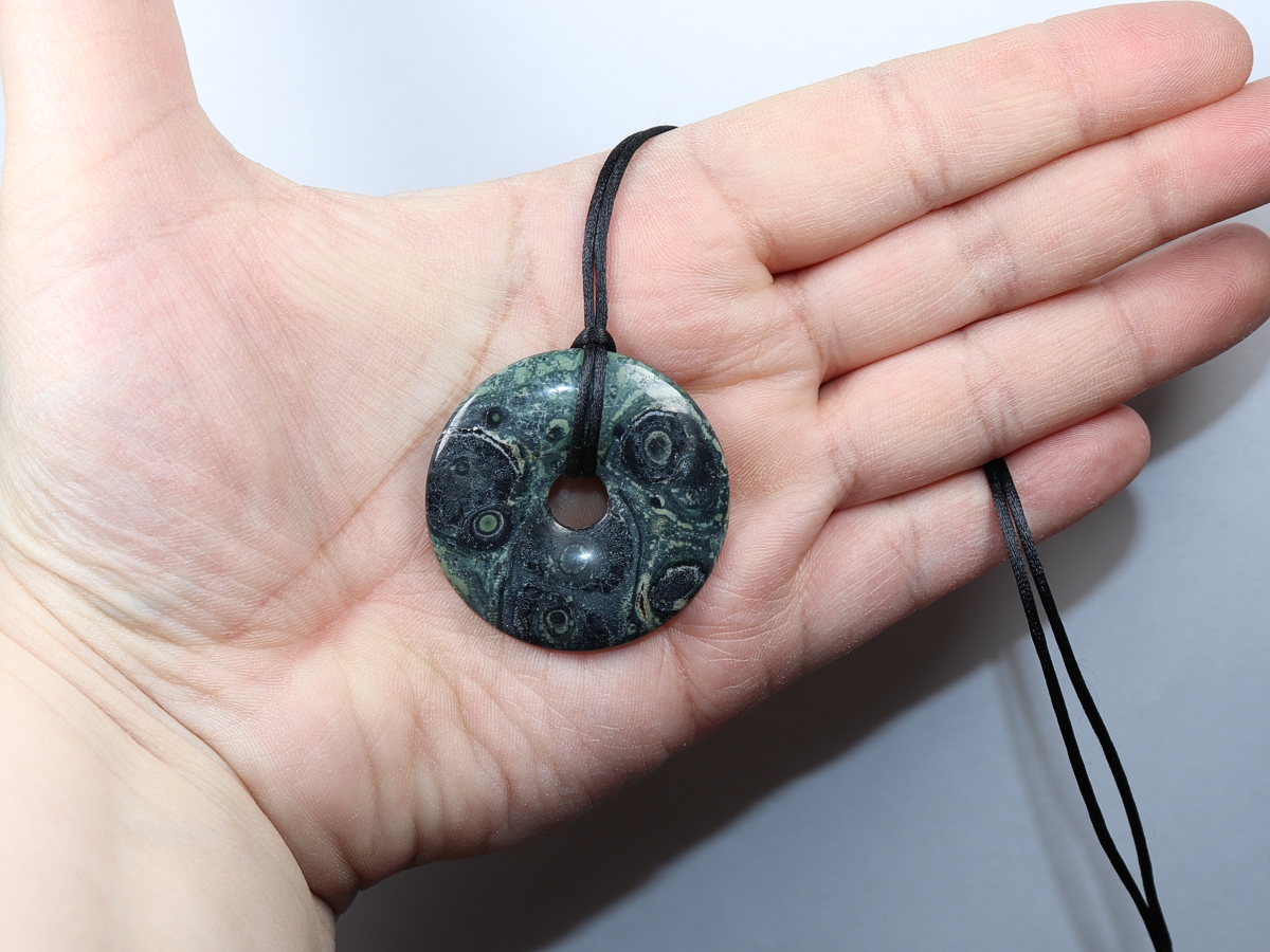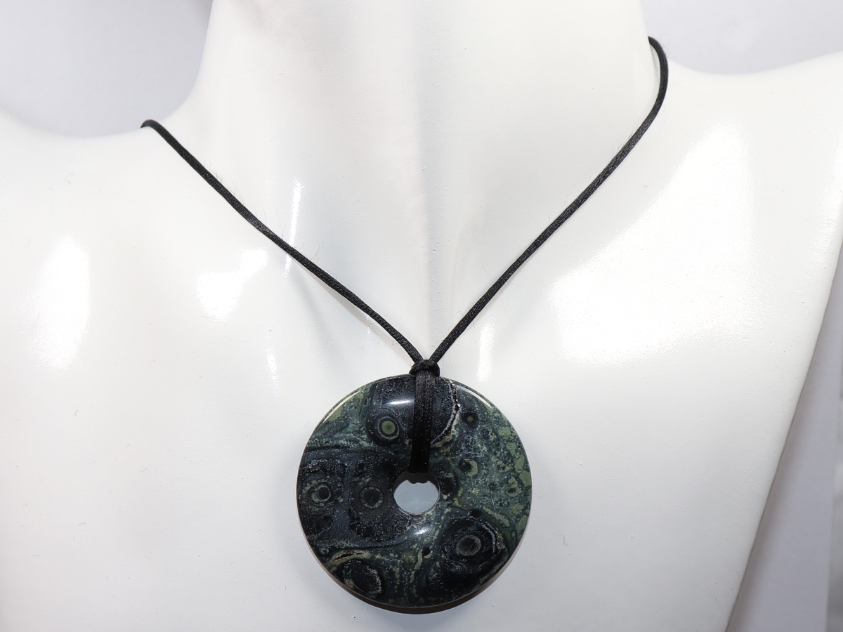 Die Halskette mit dem Donut aus Kambaba-Rhyolith und einem schwarzen Band wird nach Ihren Angaben individualisiert. Der Verschluss ist aus Edelstahl.