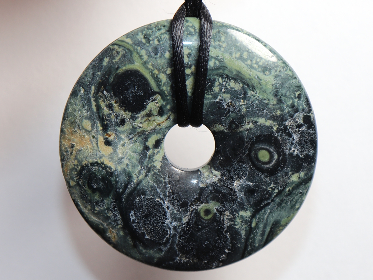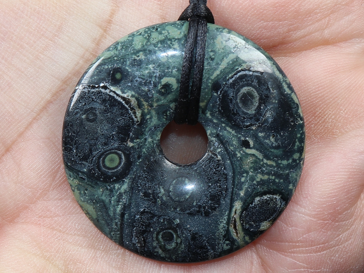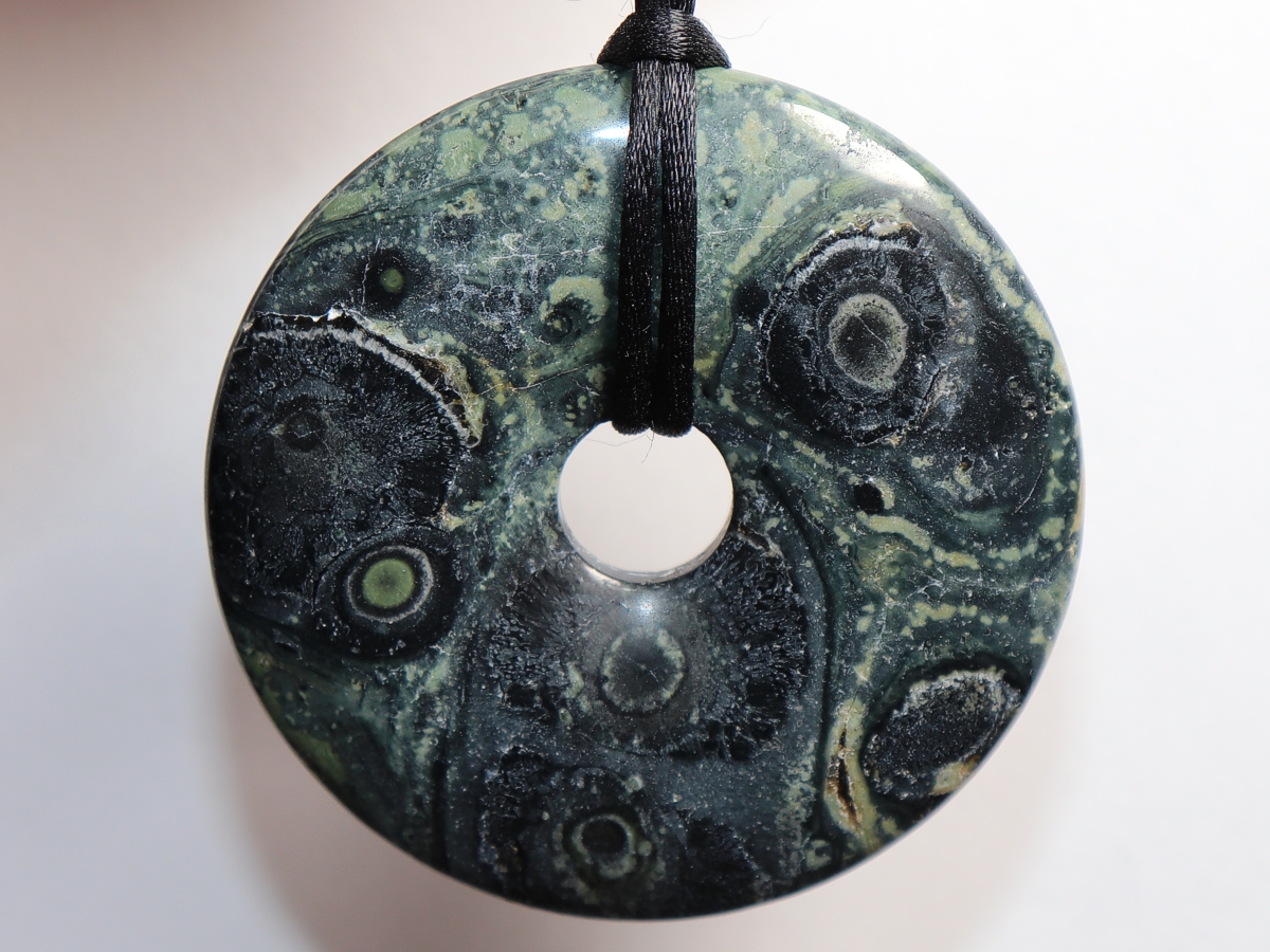 Die Halskette mit dem Donut aus Kambaba-Rhyolith und einem schwarzen Band wird nach Ihren Angaben individualisiert. Der Verschluss ist aus Edelstahl.