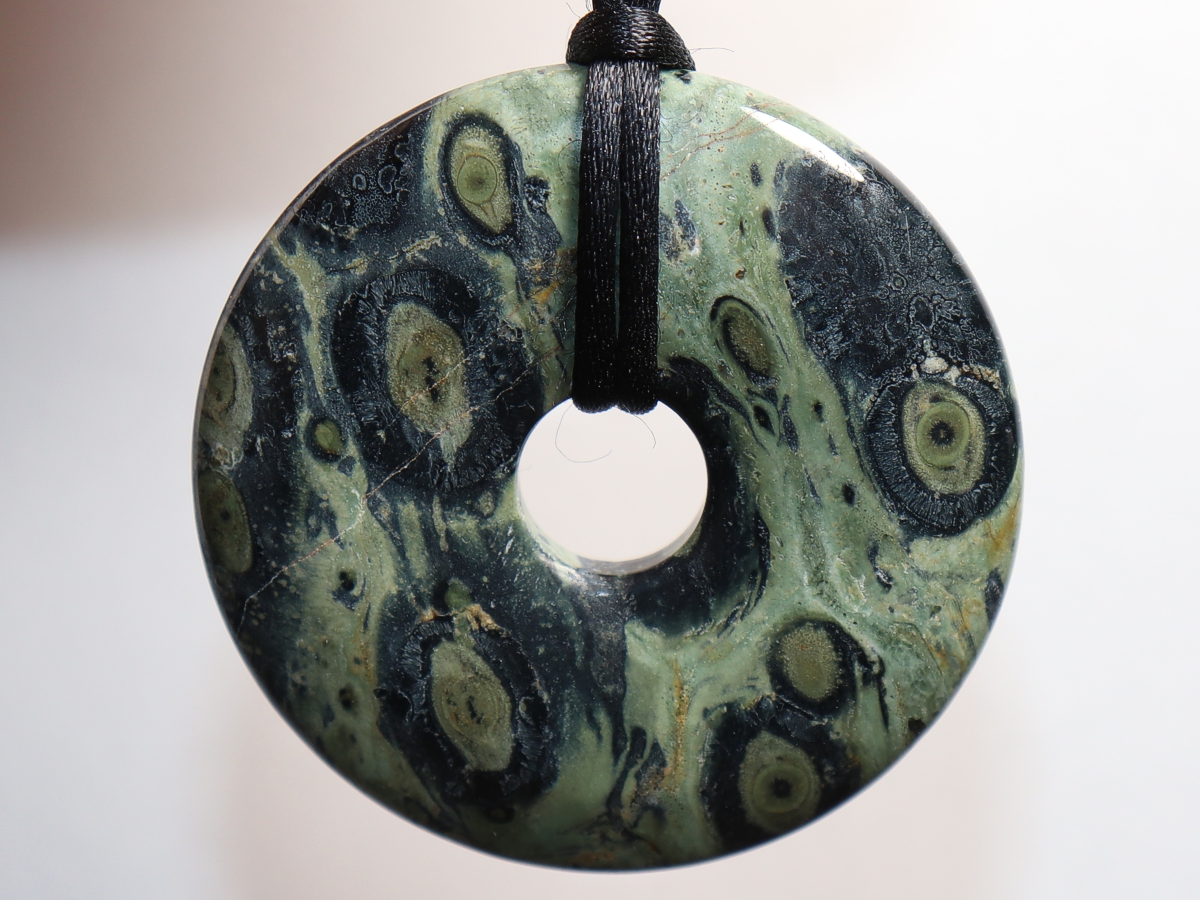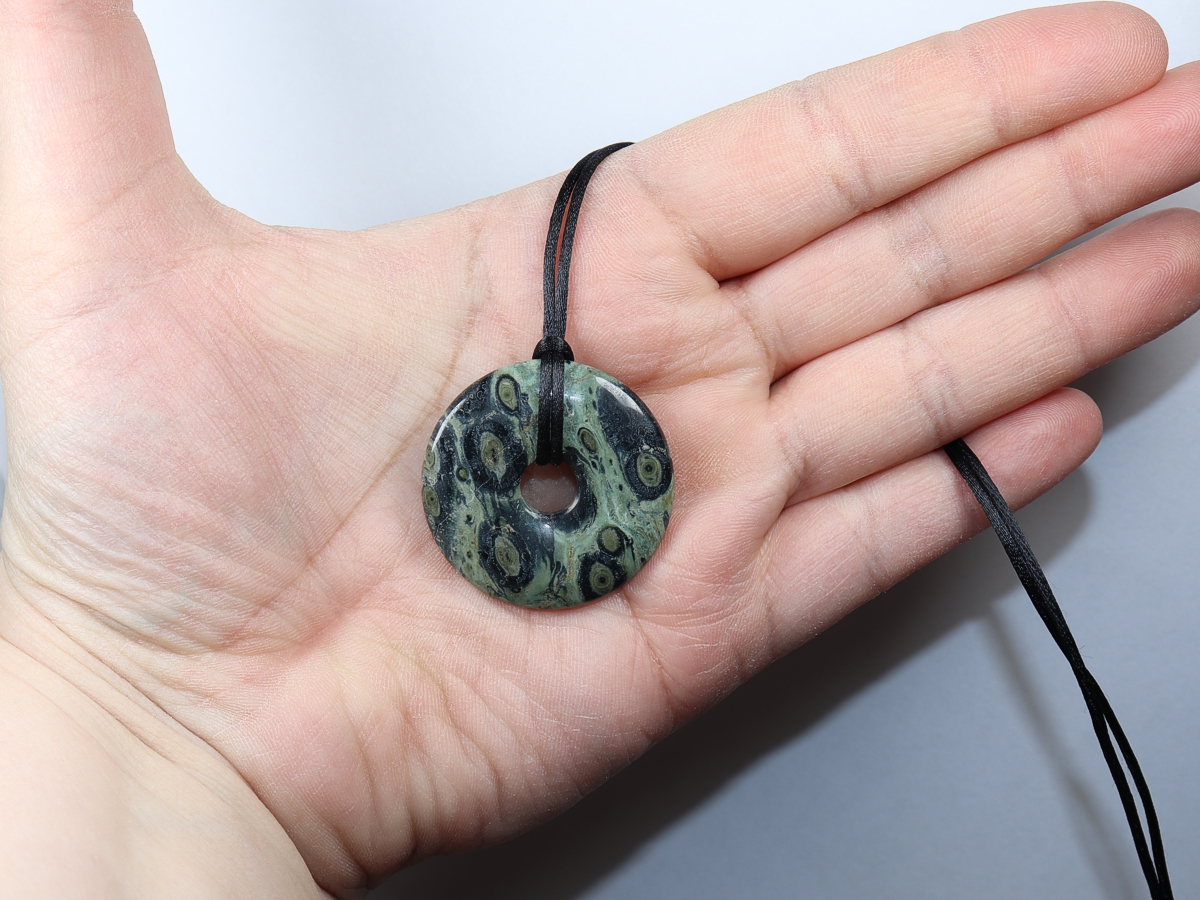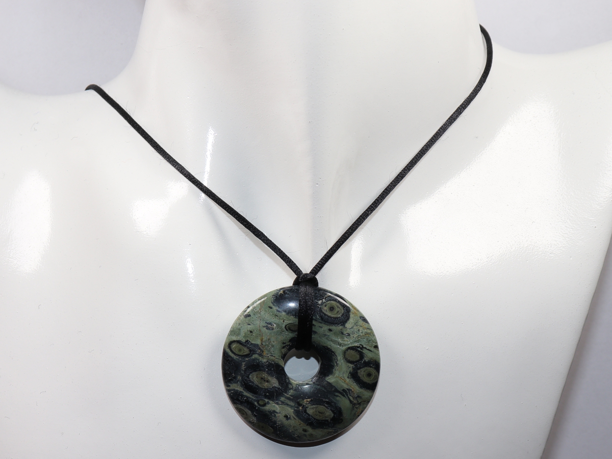 Die Halskette mit dem Donut aus Kambaba-Rhyolith und einem schwarzen Band wird nach Ihren Angaben individualisiert. Der Verschluss ist aus Edelstahl.