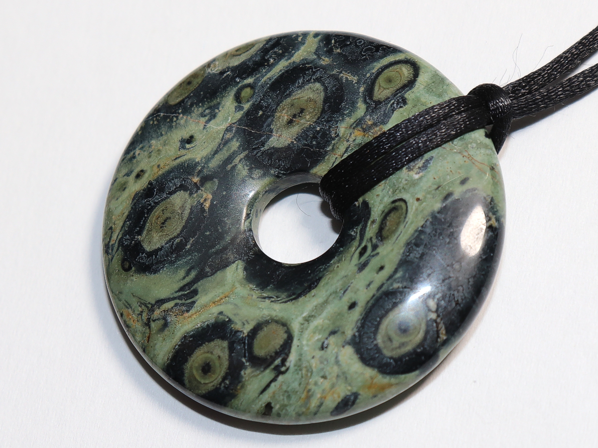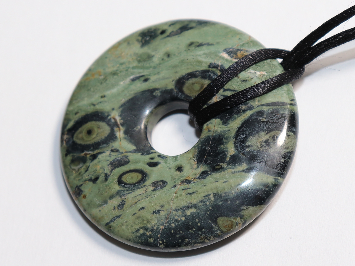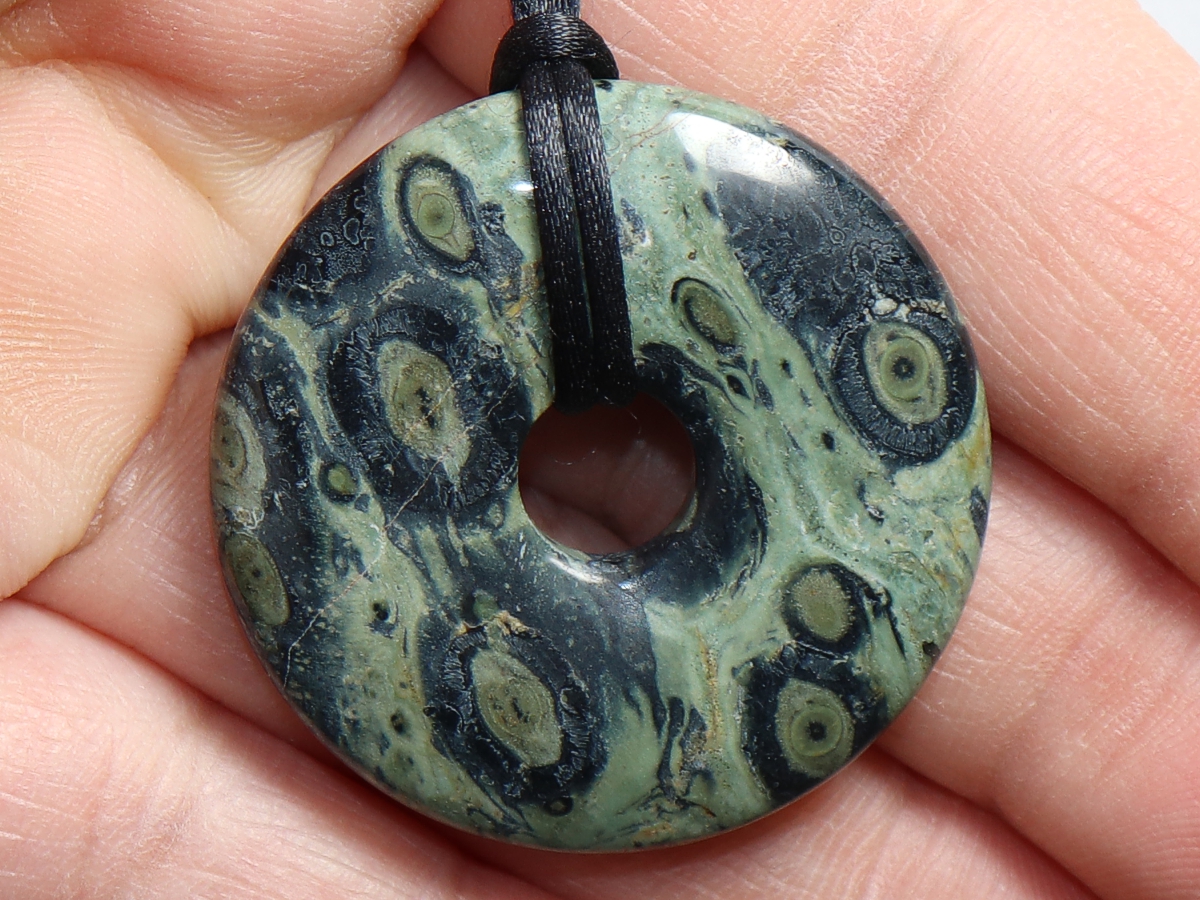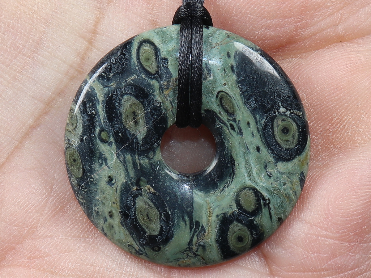 Die Halskette mit dem Donut aus Kambaba-Rhyolith und einem schwarzen Band wird nach Ihren Angaben individualisiert. Der Verschluss ist aus Edelstahl.
