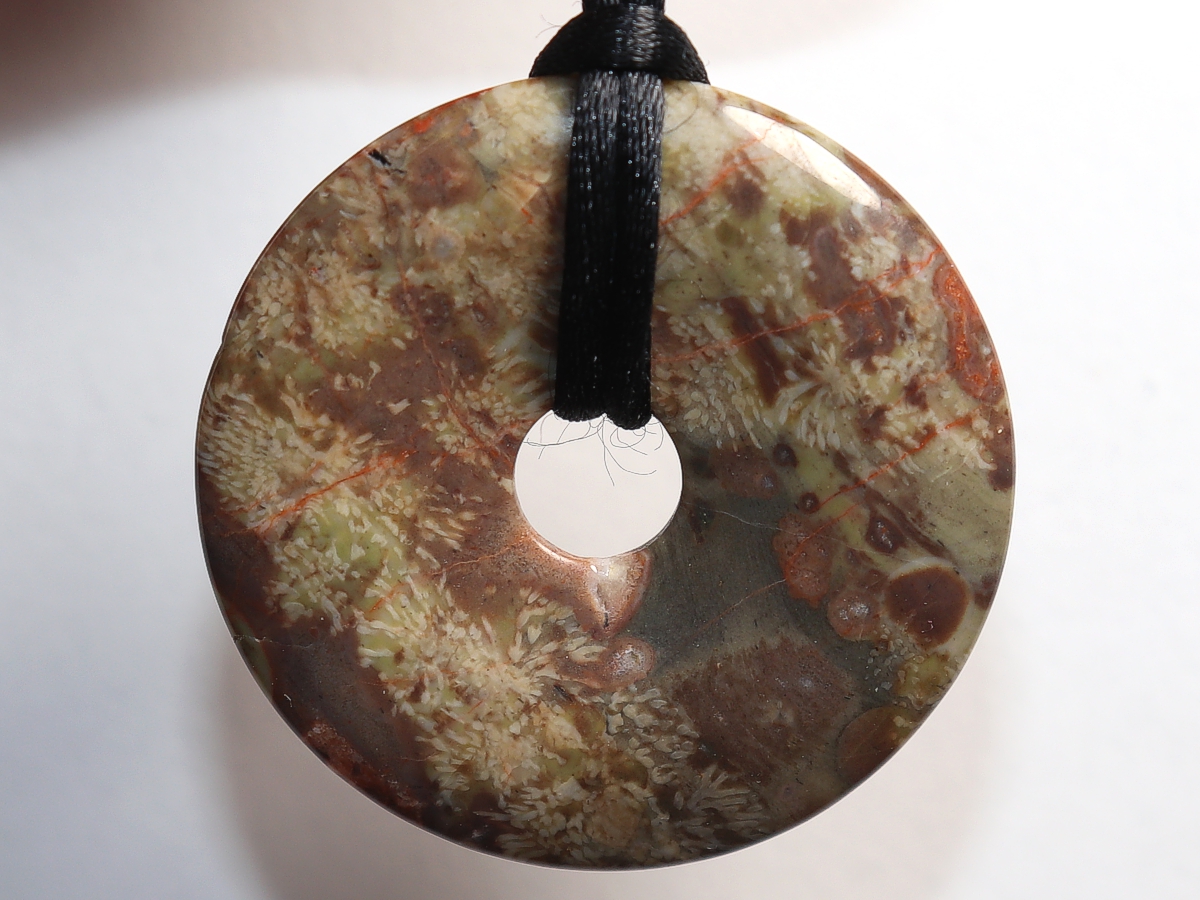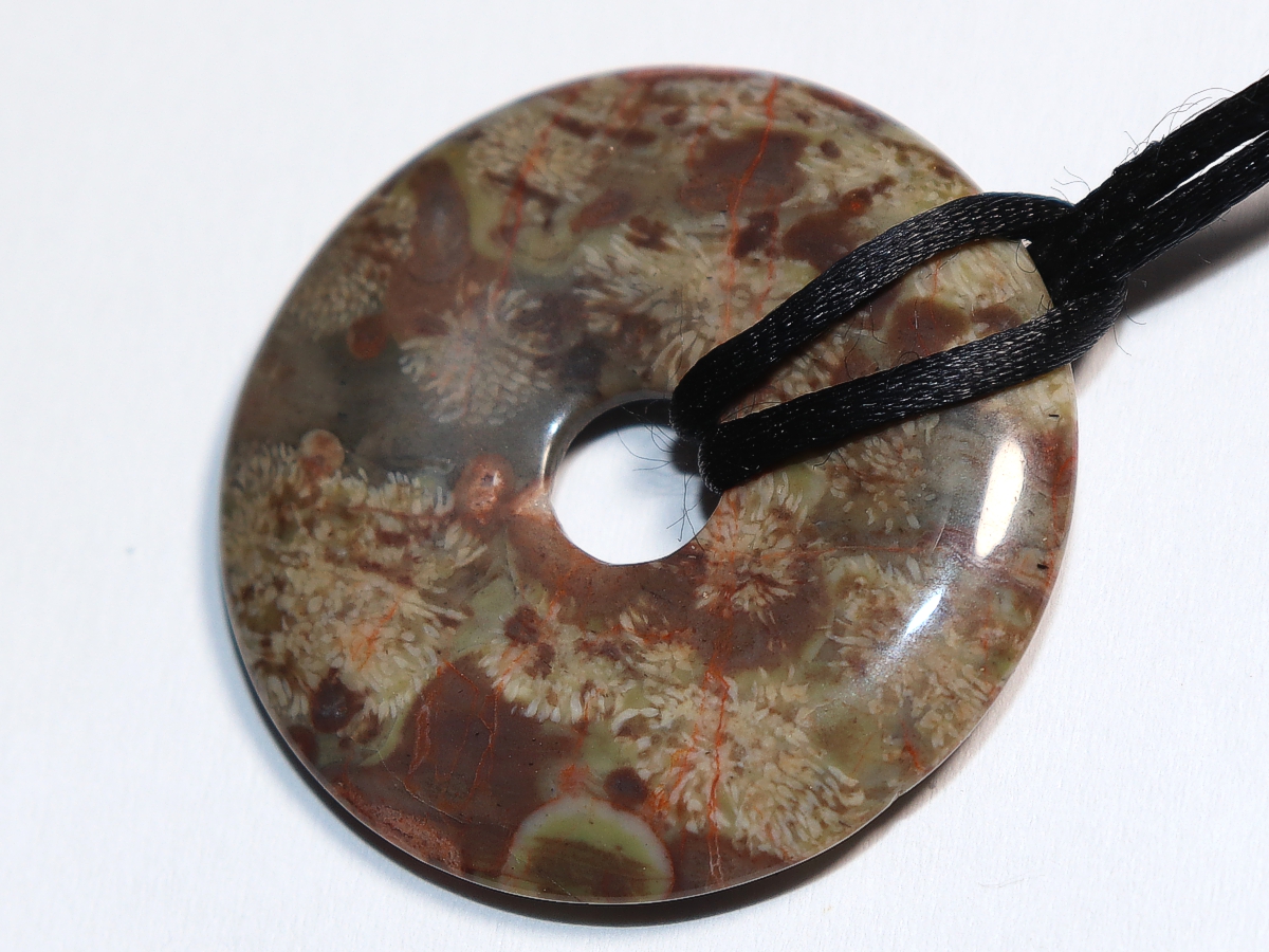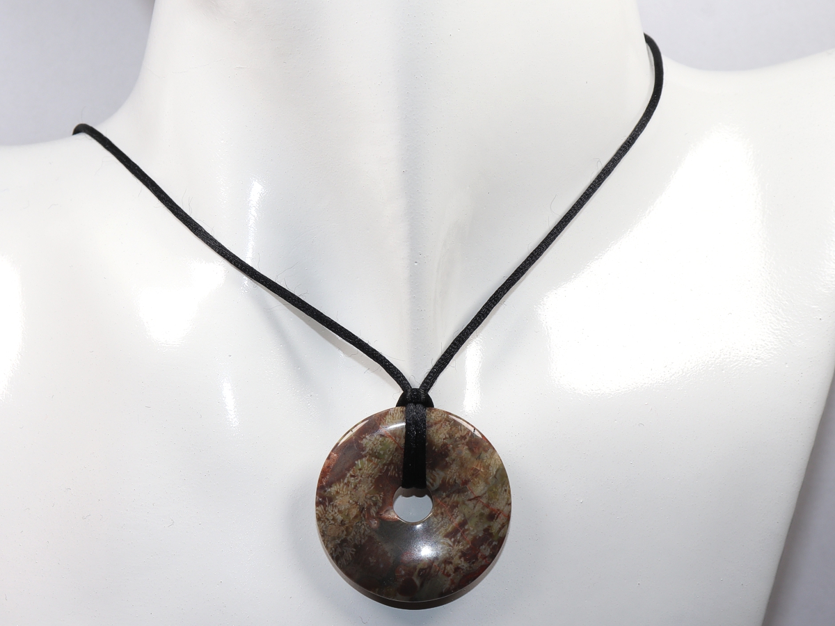 Die Halskette mit dem Donut aus Korallenjaspis und einem schwarzen Band wird nach Ihren Angaben individualisiert. Der Verschluss ist aus Edelstahl.
