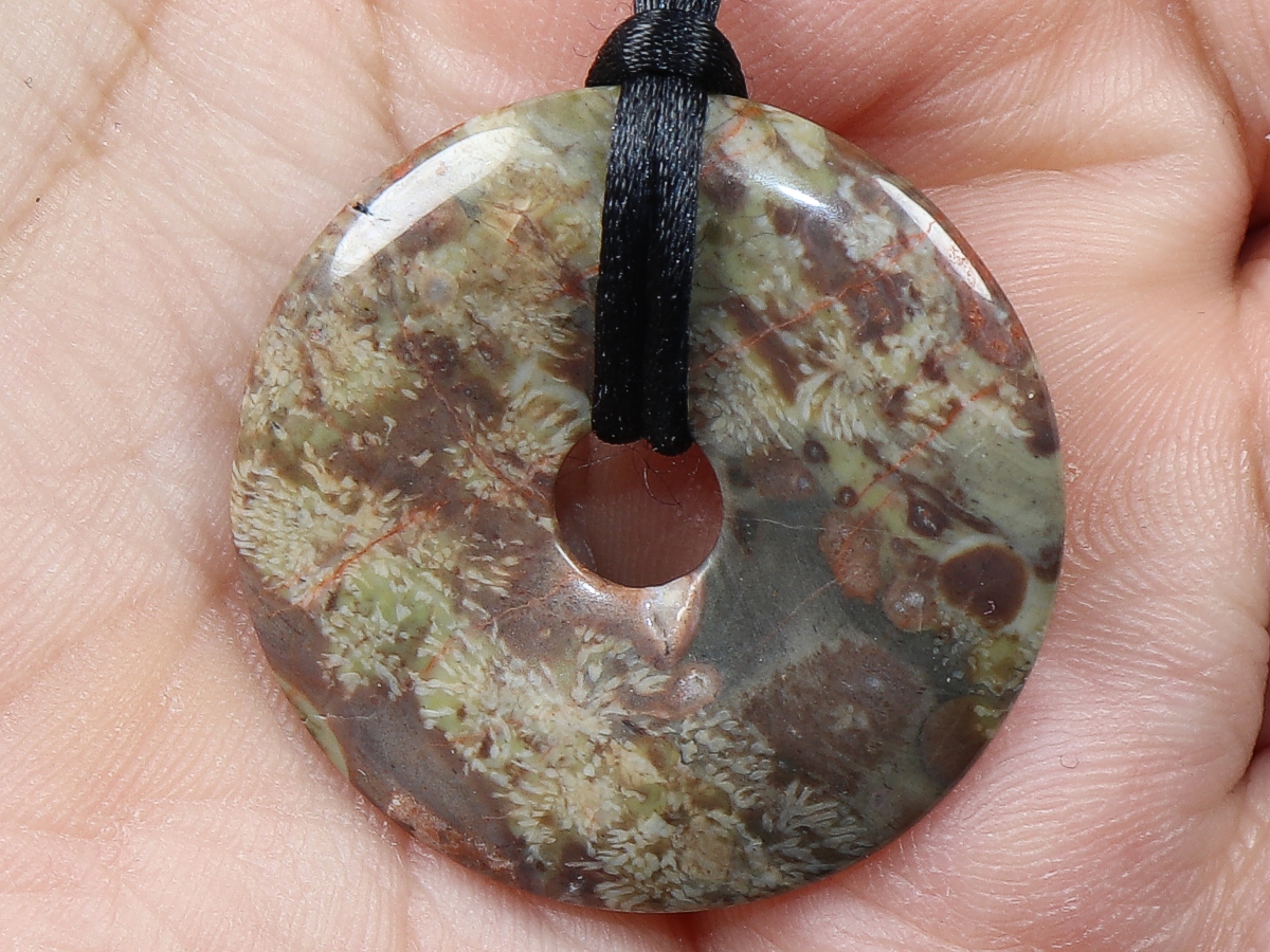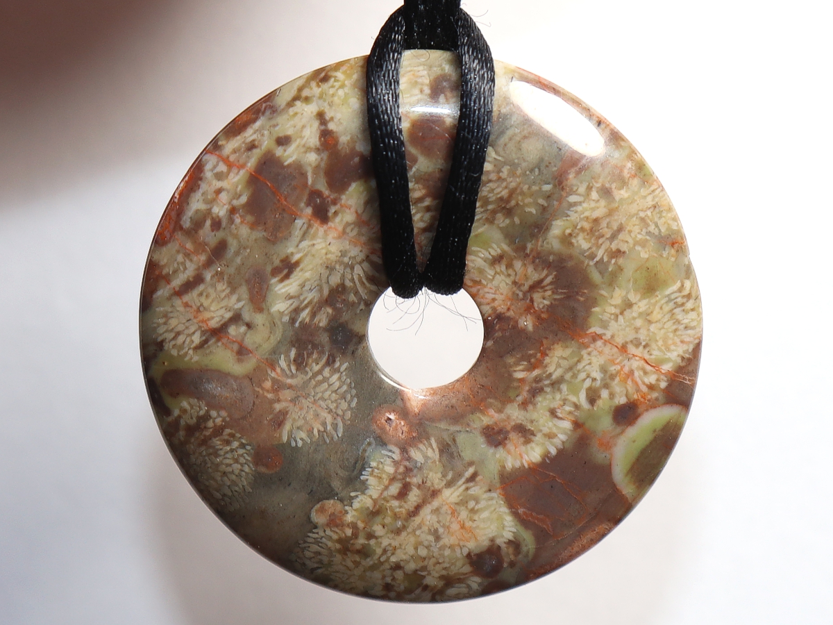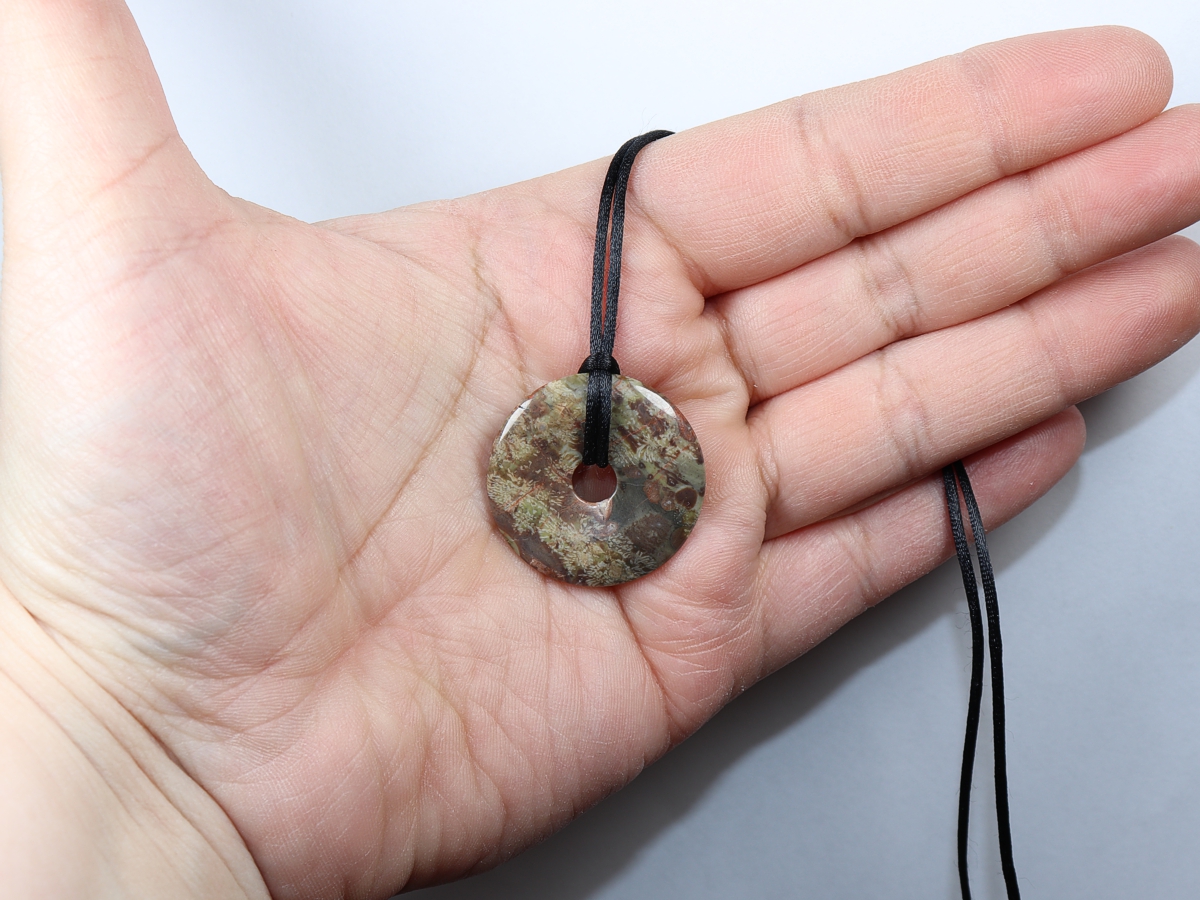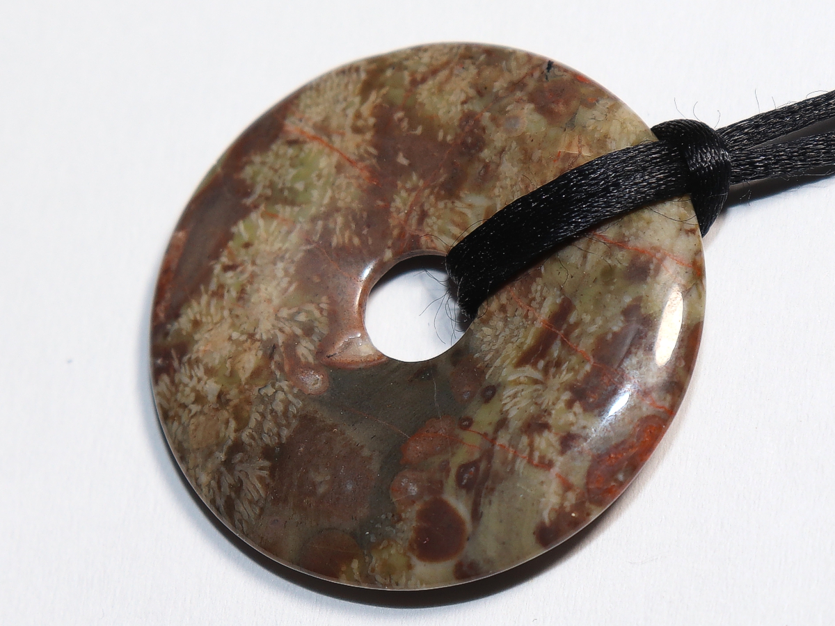Die Halskette mit dem Donut aus Korallenjaspis und einem schwarzen Band wird nach Ihren Angaben individualisiert. Der Verschluss ist aus Edelstahl.