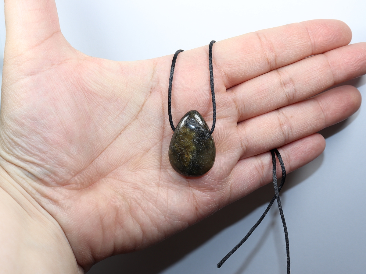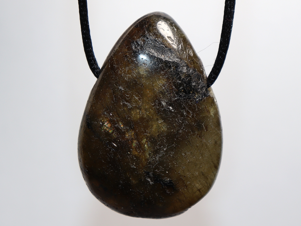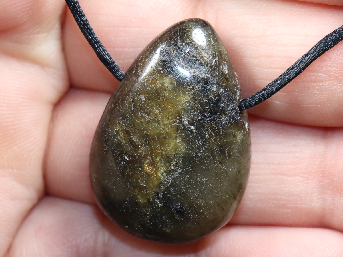 Die Halskette mit Labradorit wird nach Ihren Angaben individualisiert. Sie haben die Wahl zwischen einem schwarzen Band mit einem Verschluss aus Edelstahl oder einer Kette aus Silber 925.