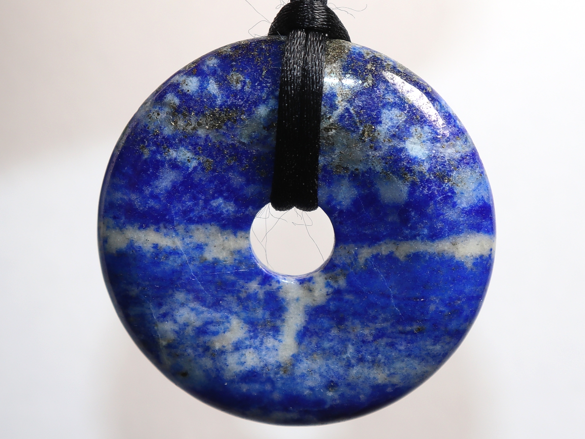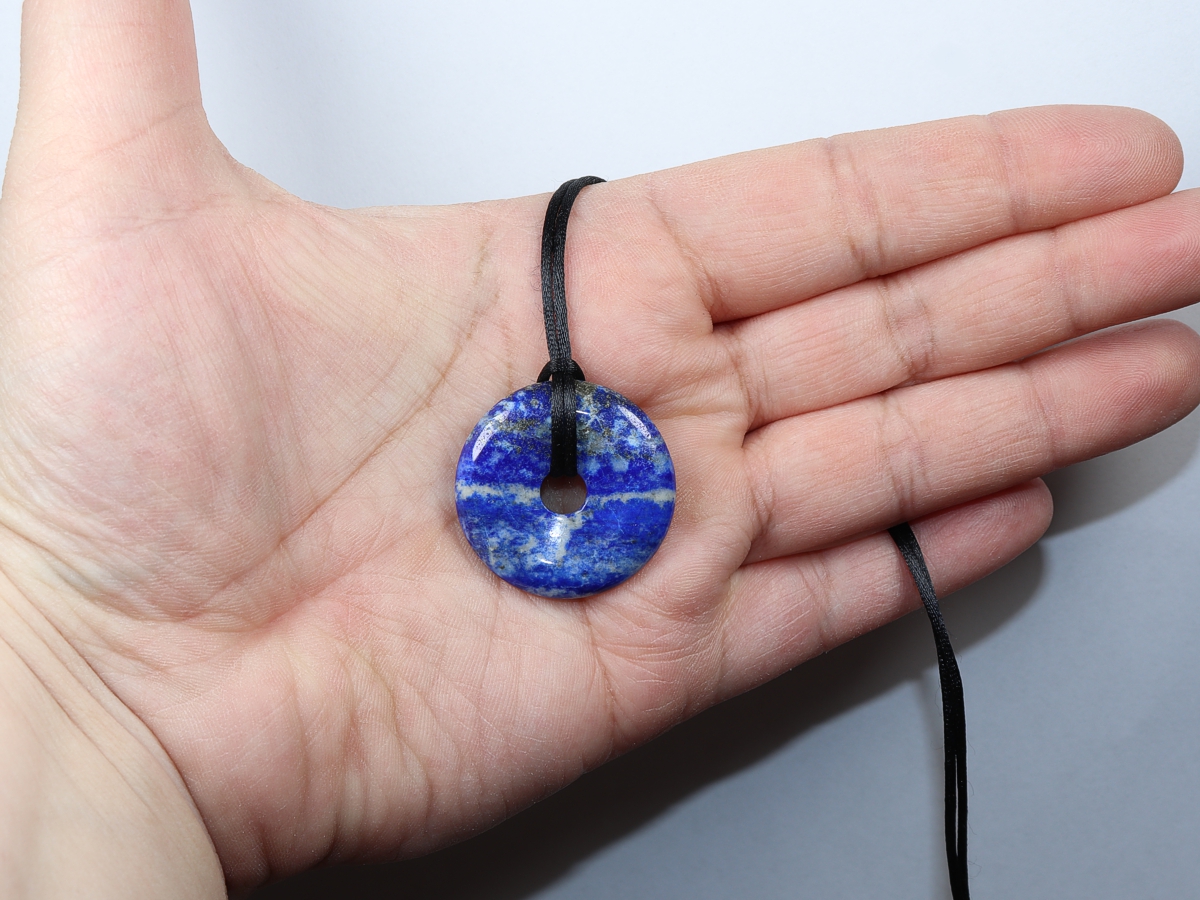 Die Halskette mit dem Donut aus Lapislazuli und einem schwarzen Band wird nach Ihren Angaben individualisiert. Der Verschluss ist aus Edelstahl.