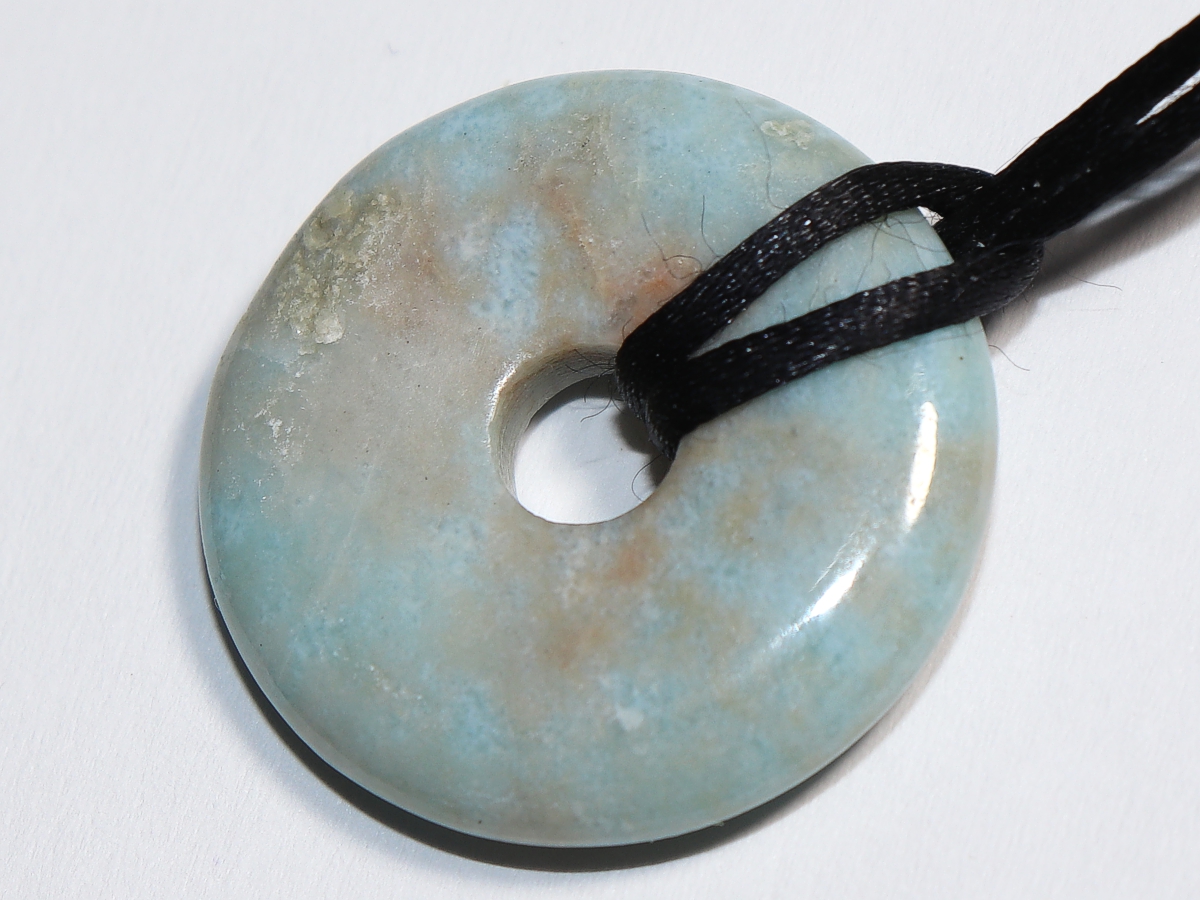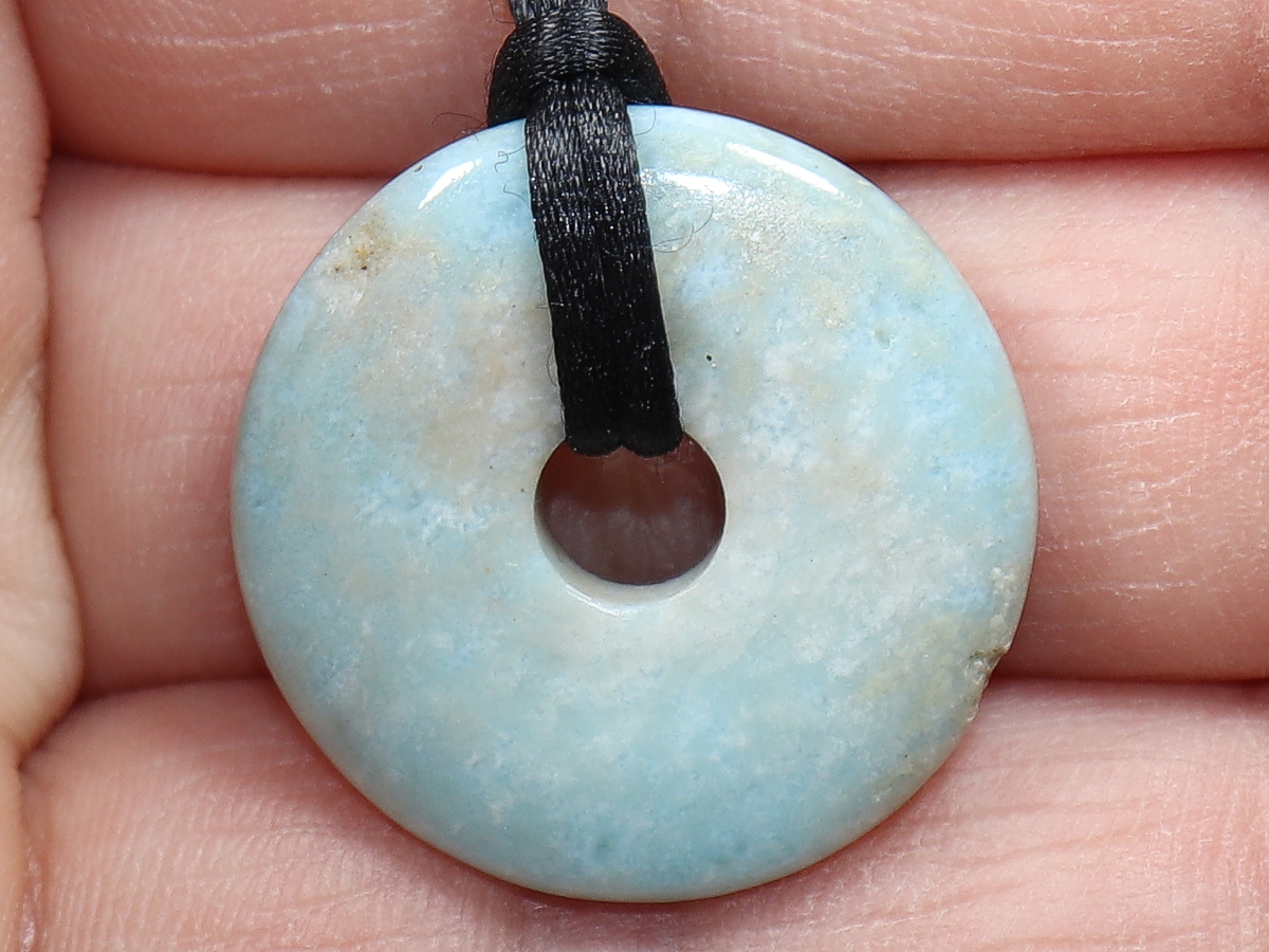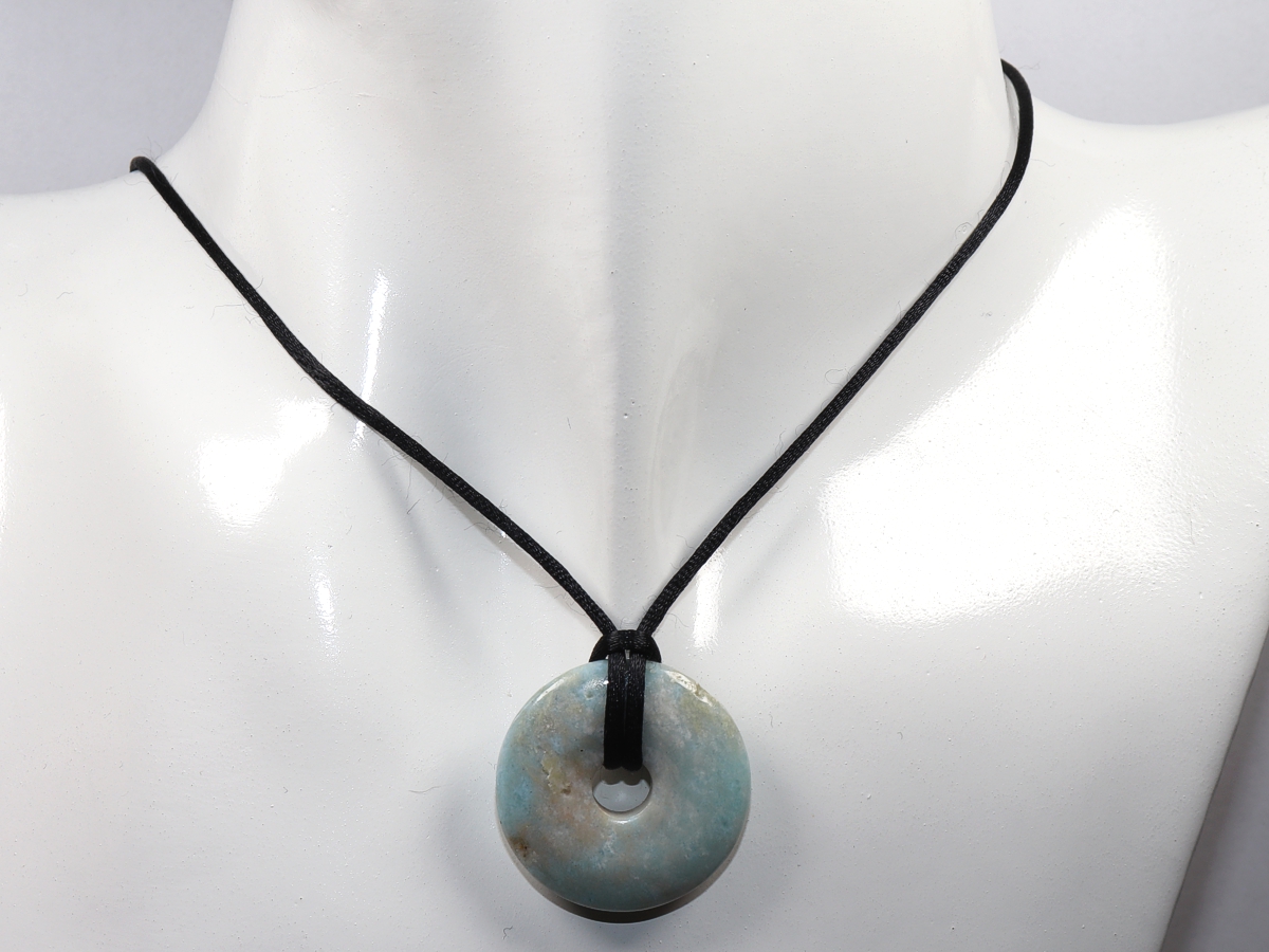 Die Halskette mit dem Donut aus Larimar und einem schwarzen Band wird nach Ihren Angaben individualisiert. Der Verschluss ist aus Edelstahl.