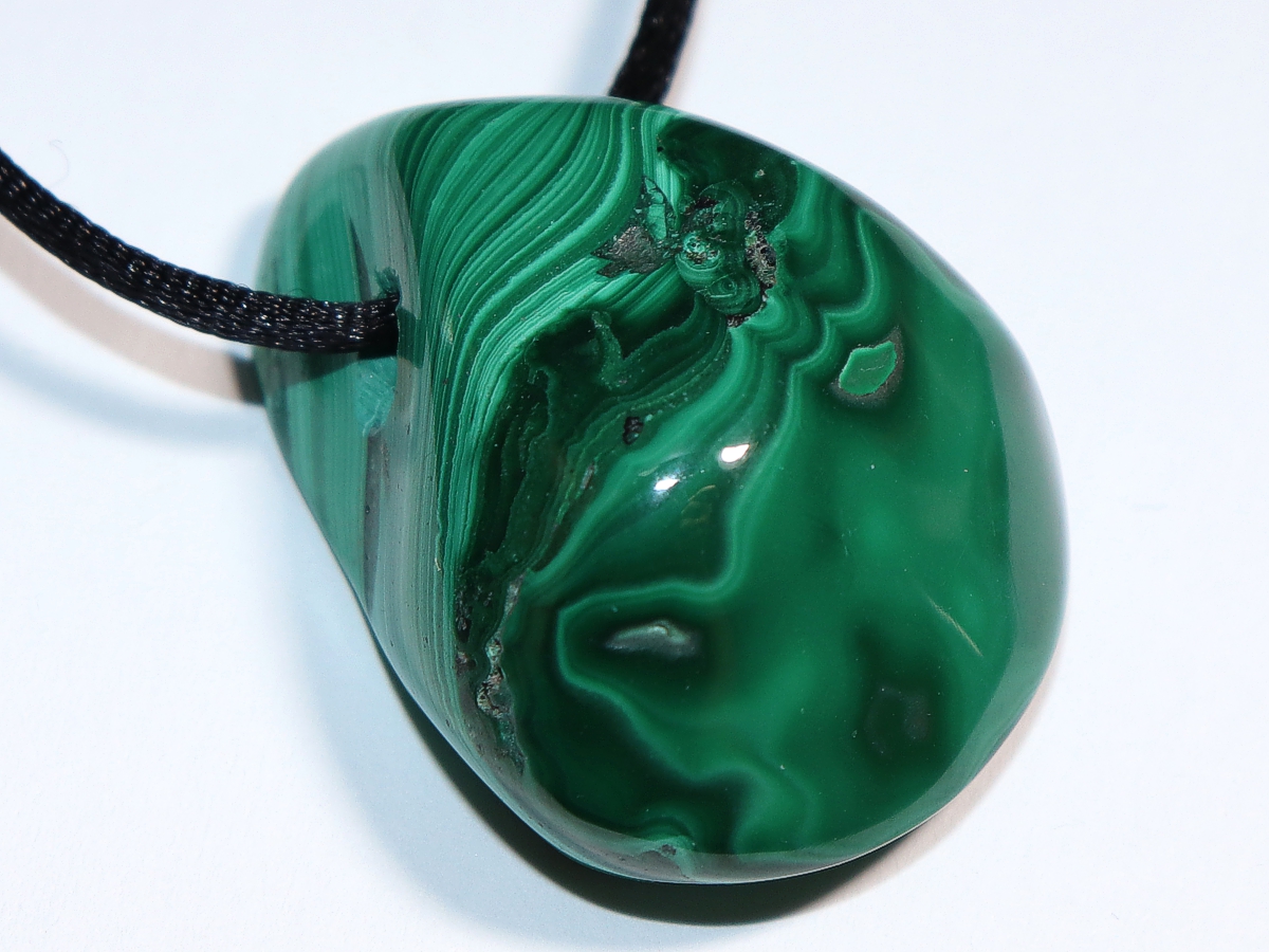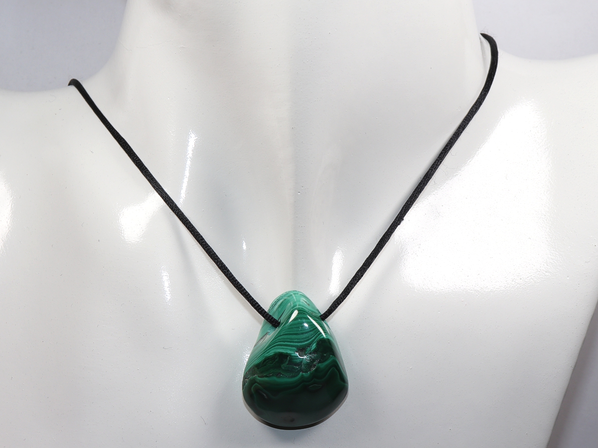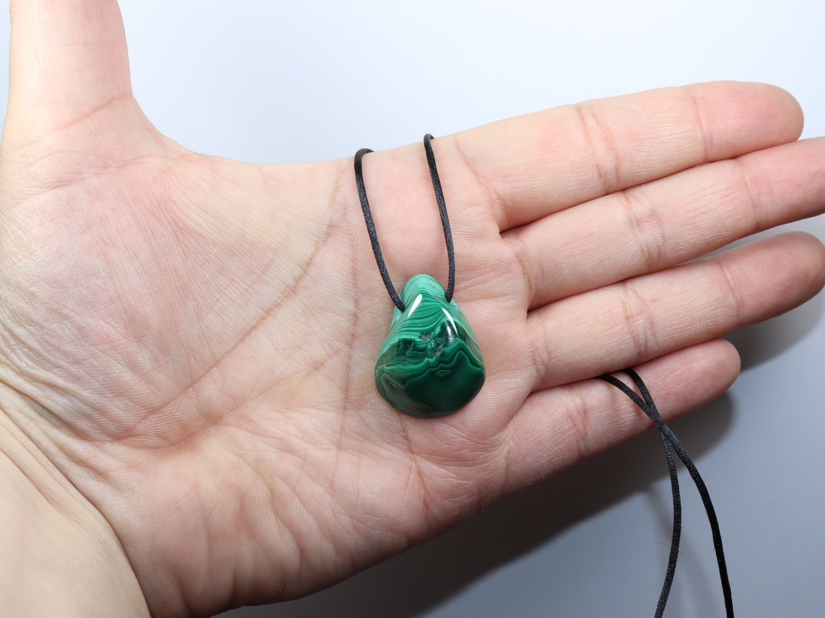 Die Halskette mit Malachit wird nach Ihren Angaben individualisiert. Sie haben die Wahl zwischen einem schwarzen Band mit einem Verschluss aus Edelstahl oder einer Kette aus Silber 925.