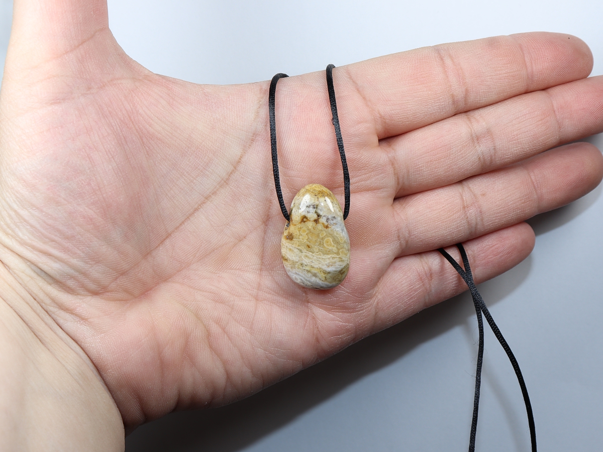 Die Halskette mit Mexiko-Achat wird nach Ihren Angaben individualisiert. Sie haben die Wahl zwischen einem schwarzen Band mit einem Verschluss aus Edelstahl oder einer Kette aus Silber 925.
