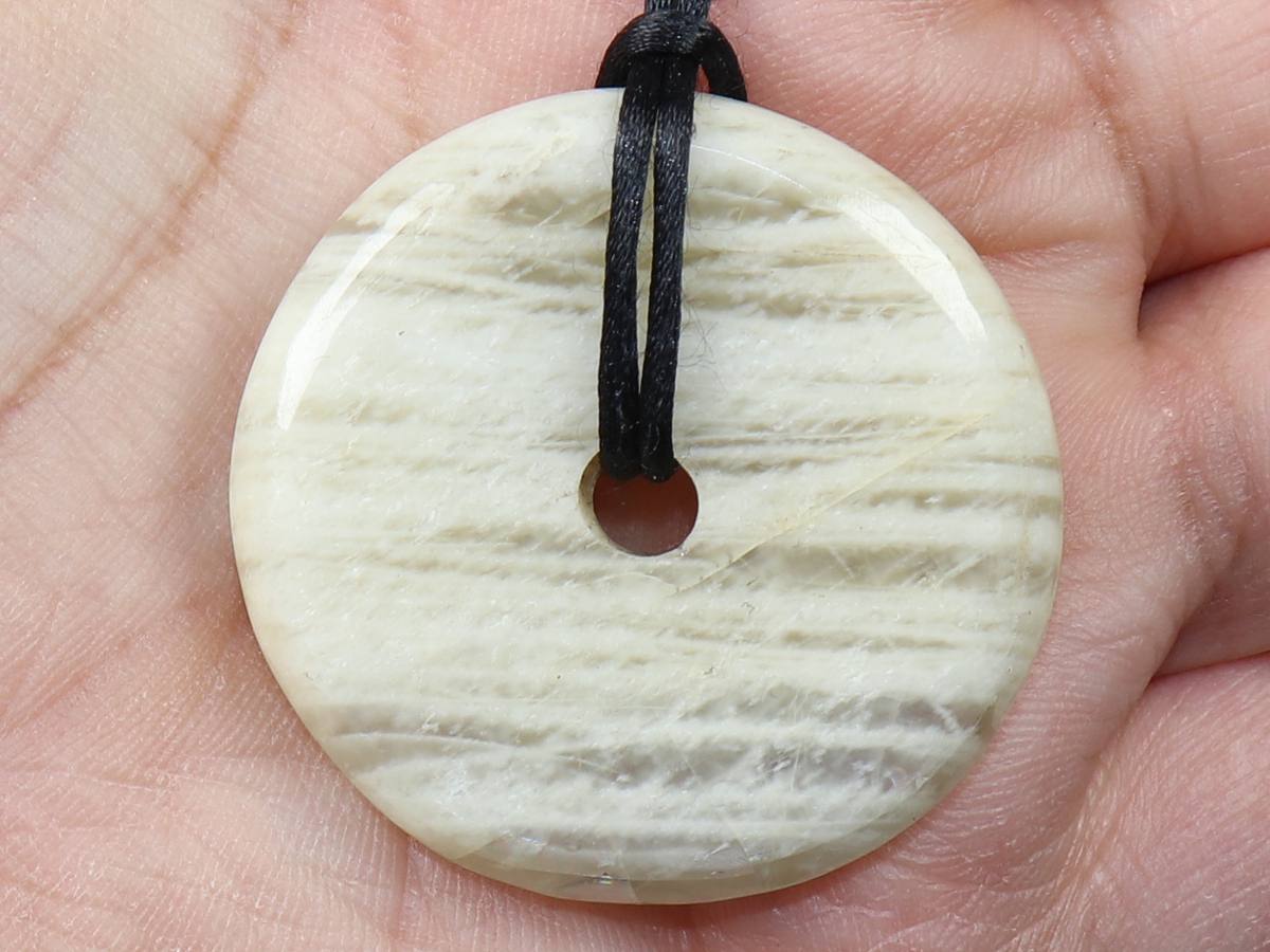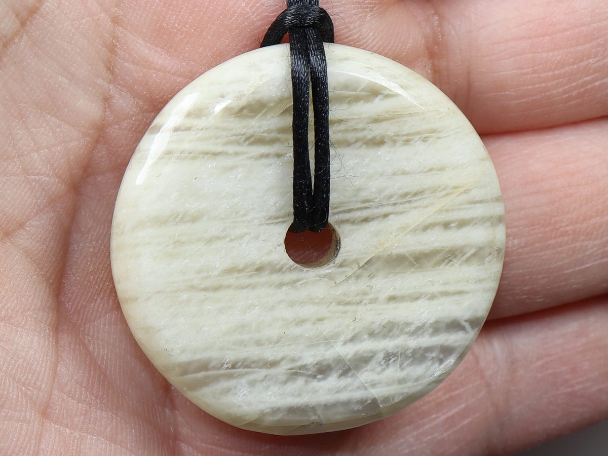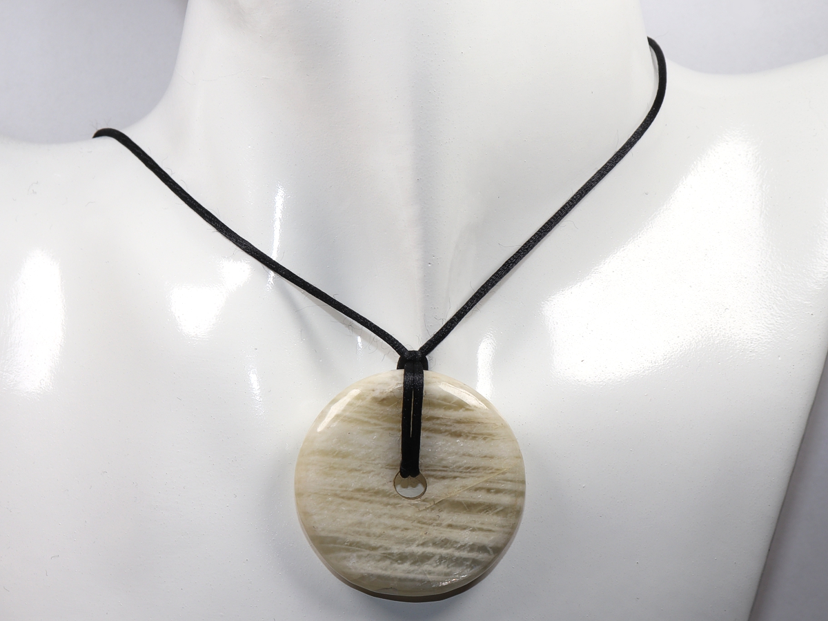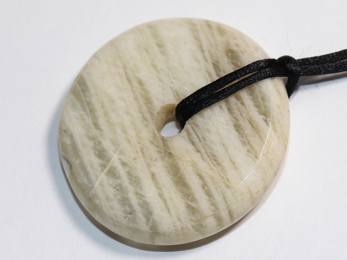 Die Halskette mit dem Donut aus Mondstein und einem schwarzen Band wird nach Ihren Angaben individualisiert. Der Verschluss ist aus Edelstahl.