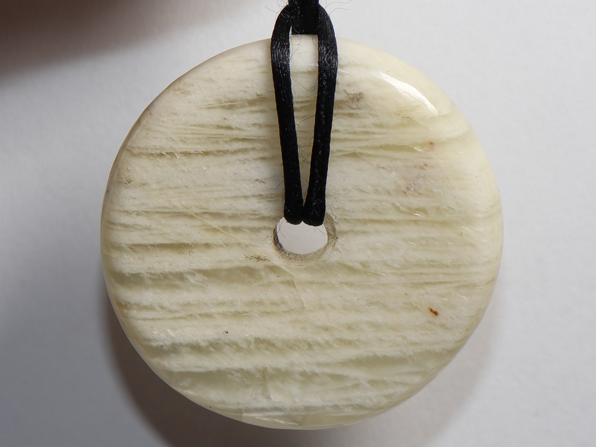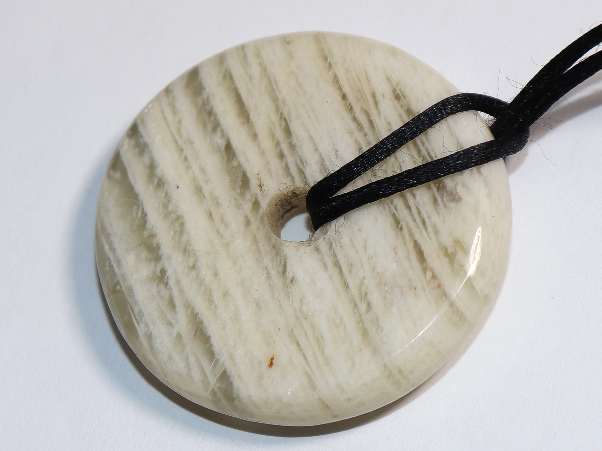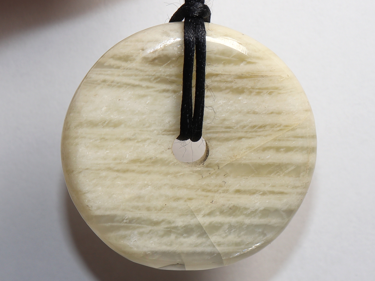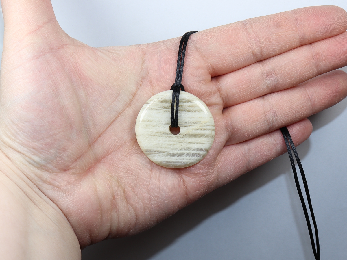 Die Halskette mit dem Donut aus Mondstein und einem schwarzen Band wird nach Ihren Angaben individualisiert. Der Verschluss ist aus Edelstahl.