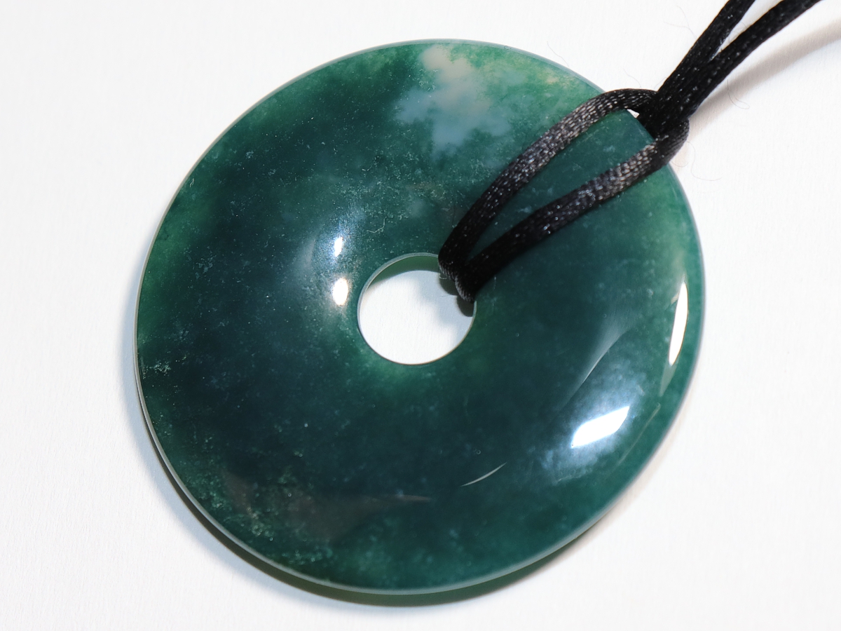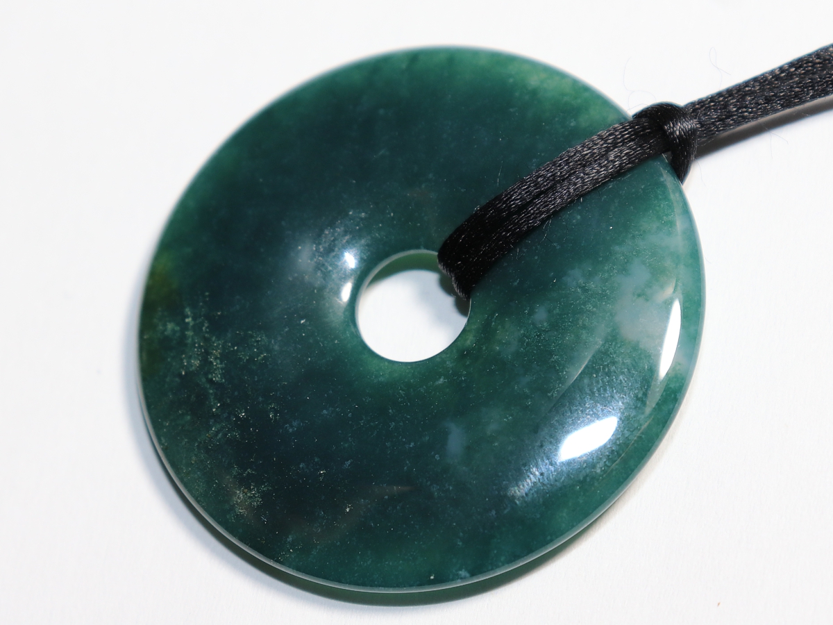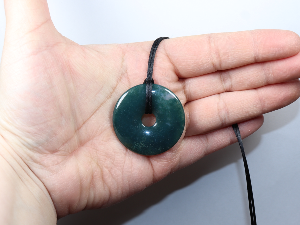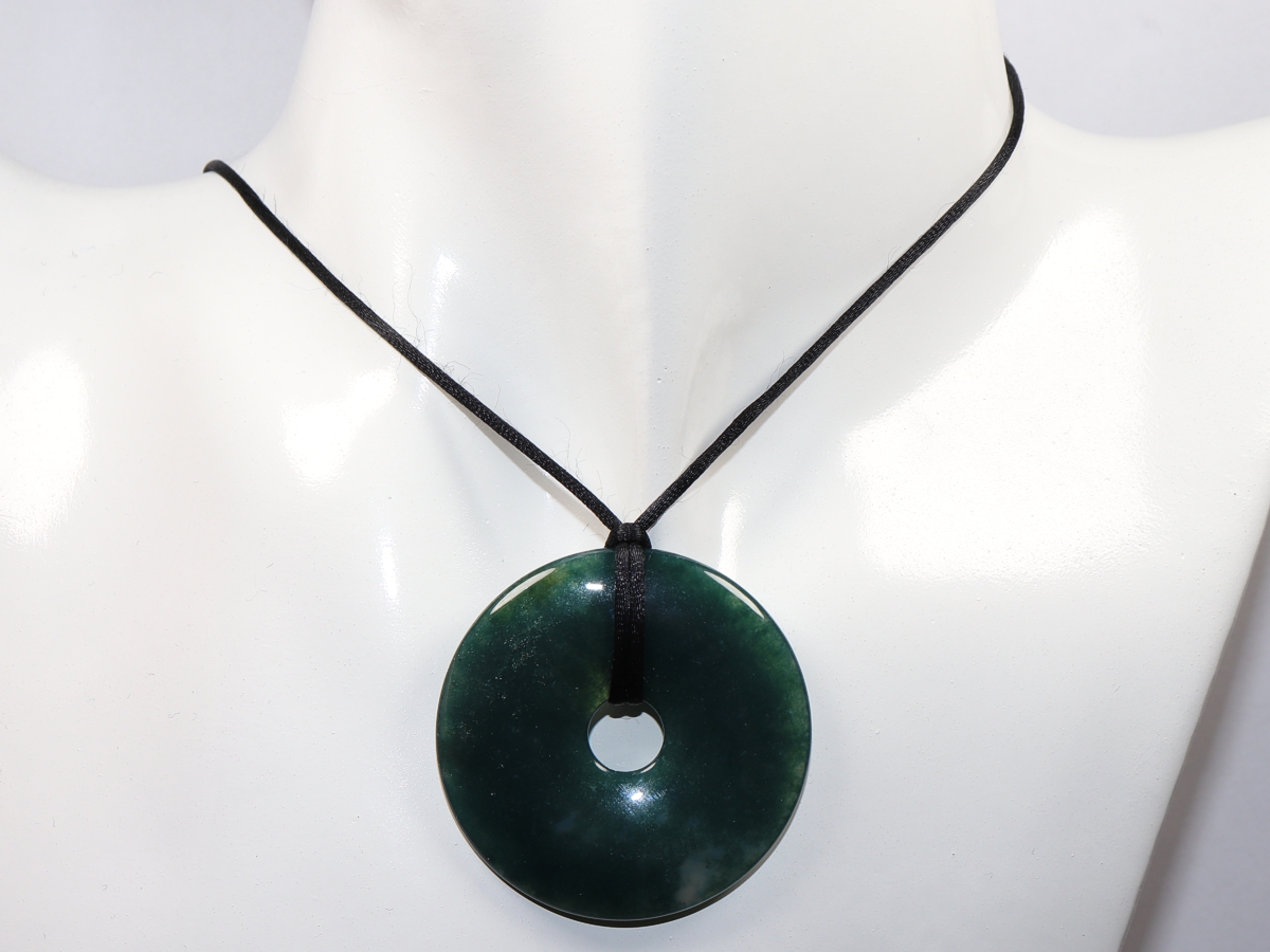 Die Halskette mit dem Donut aus Moosachat und einem schwarzen Band wird nach Ihren Angaben individualisiert. Der Verschluss ist aus Edelstahl.