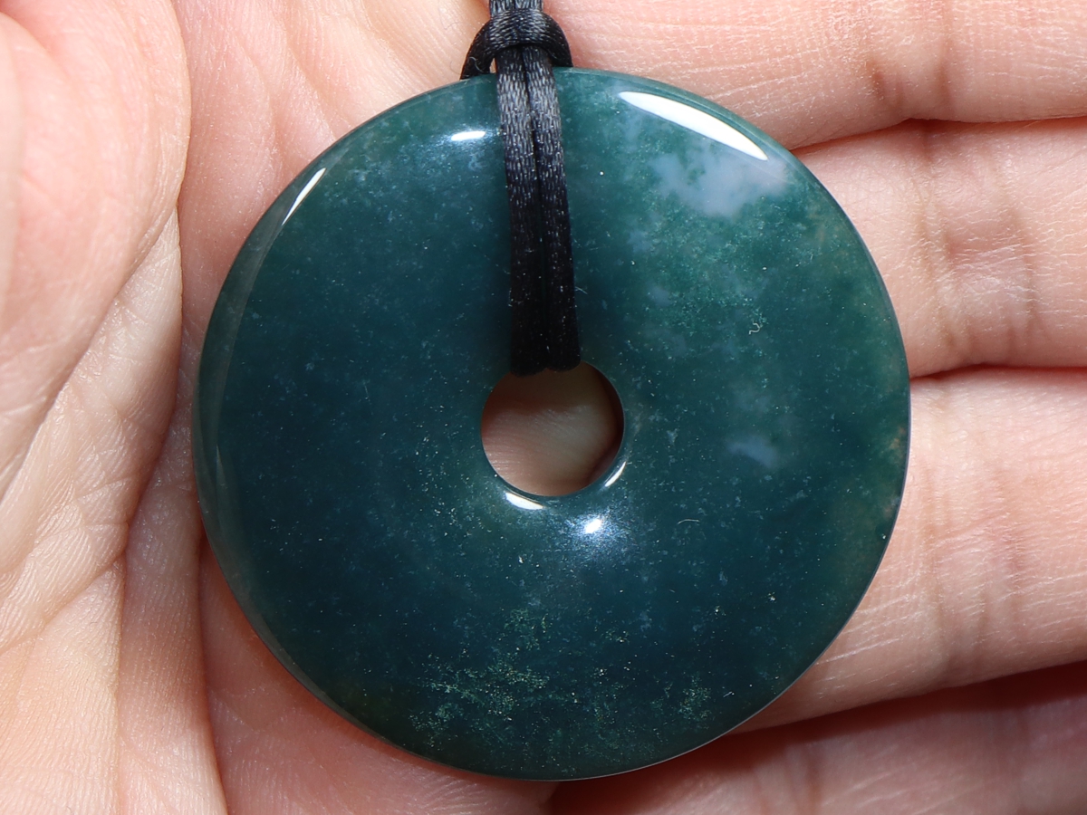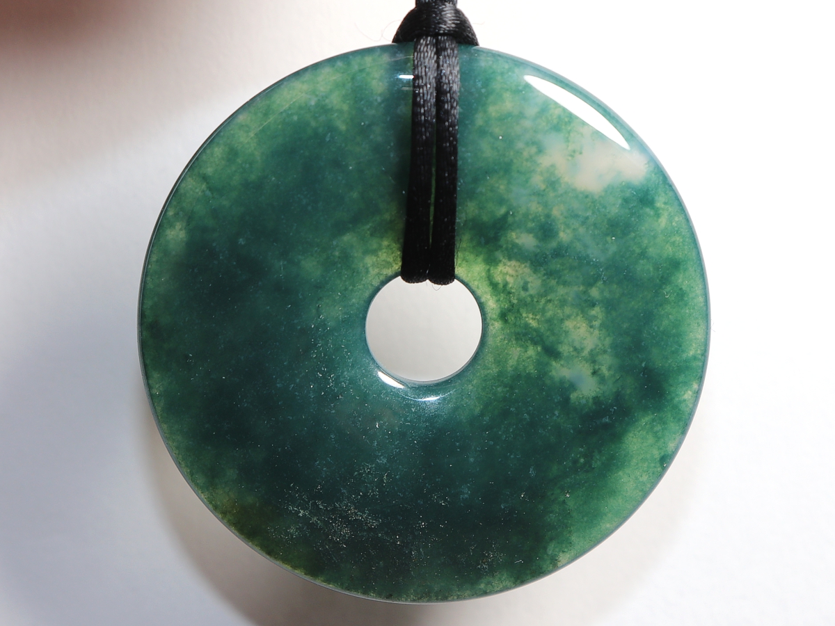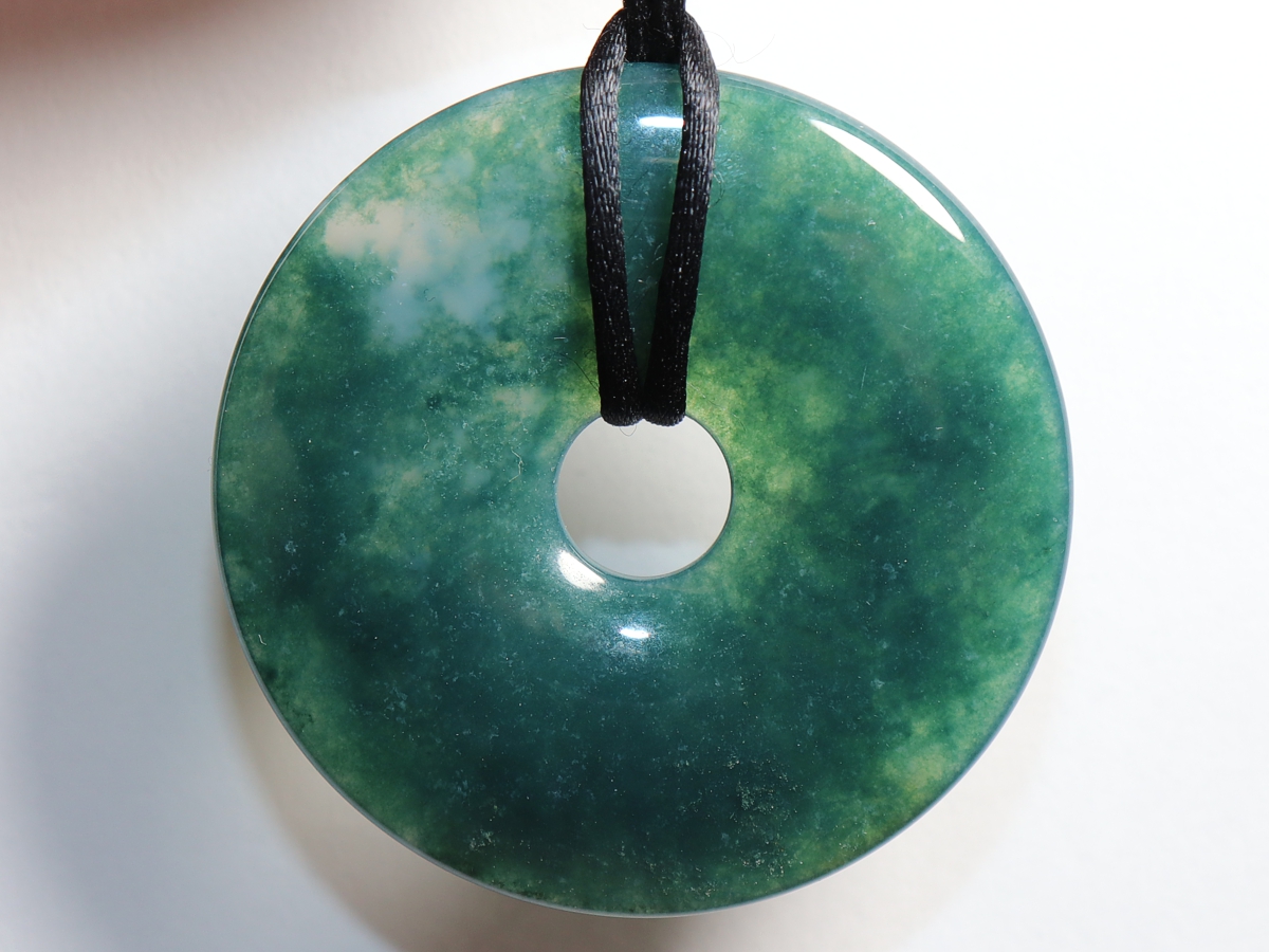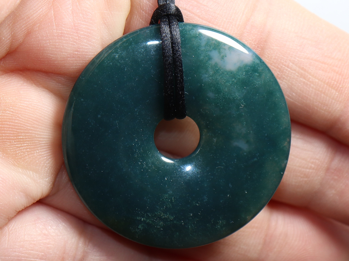 Die Halskette mit dem Donut aus Moosachat und einem schwarzen Band wird nach Ihren Angaben individualisiert. Der Verschluss ist aus Edelstahl.