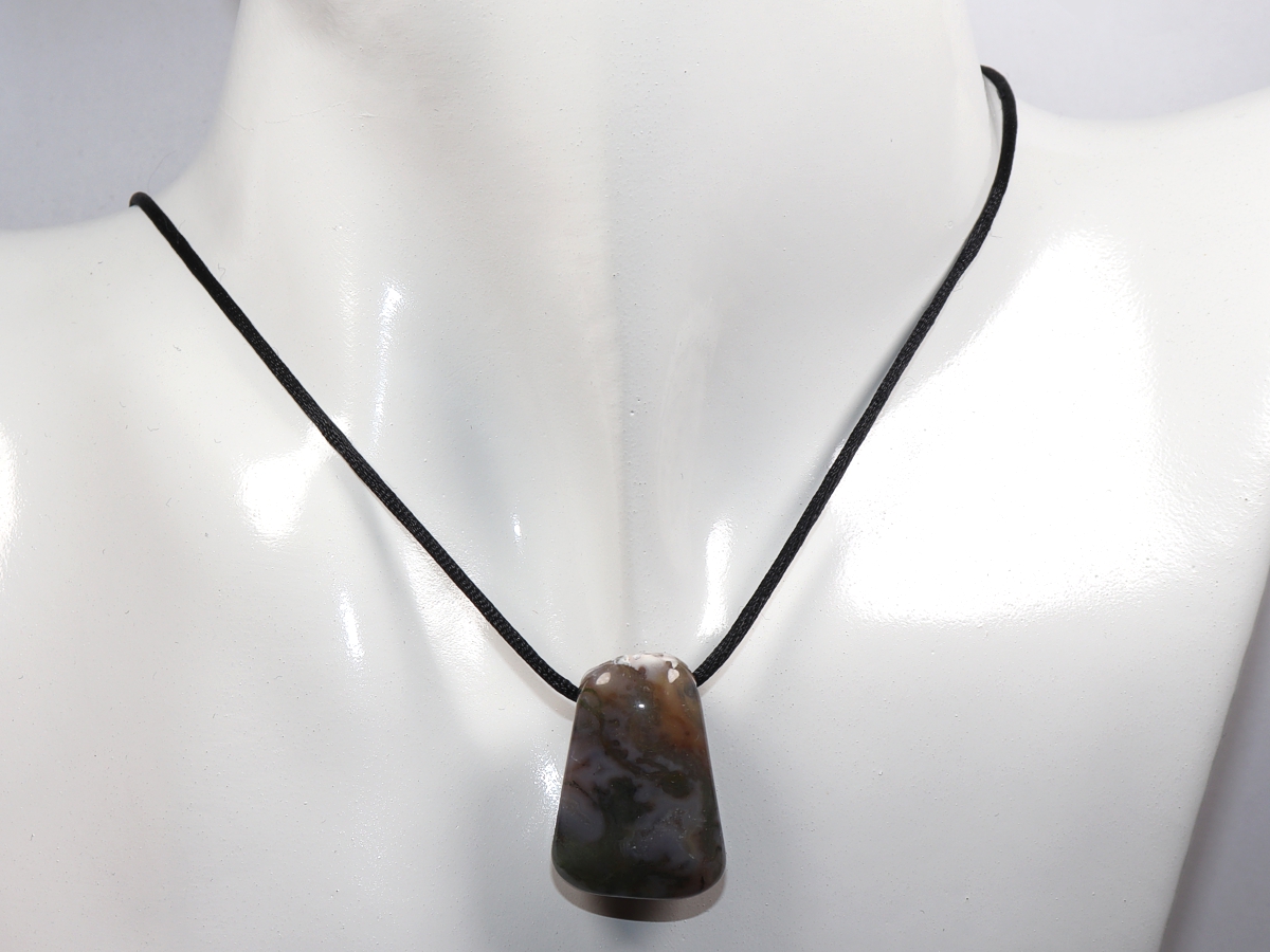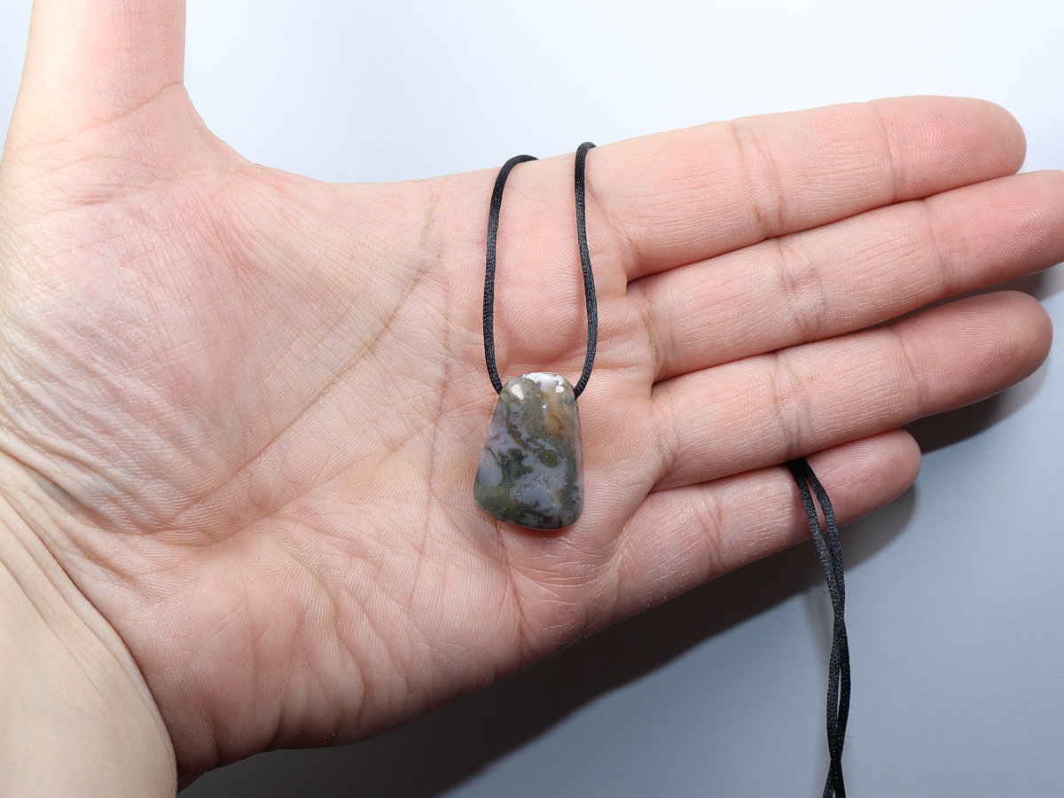 Die Halskette mit Moosachat wird nach Ihren Angaben individualisiert. Sie haben die Wahl zwischen einem schwarzen Band mit einem Verschluss aus Edelstahl oder einer Kette aus Silber 925.