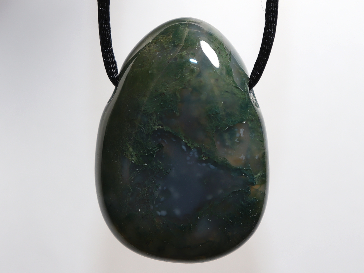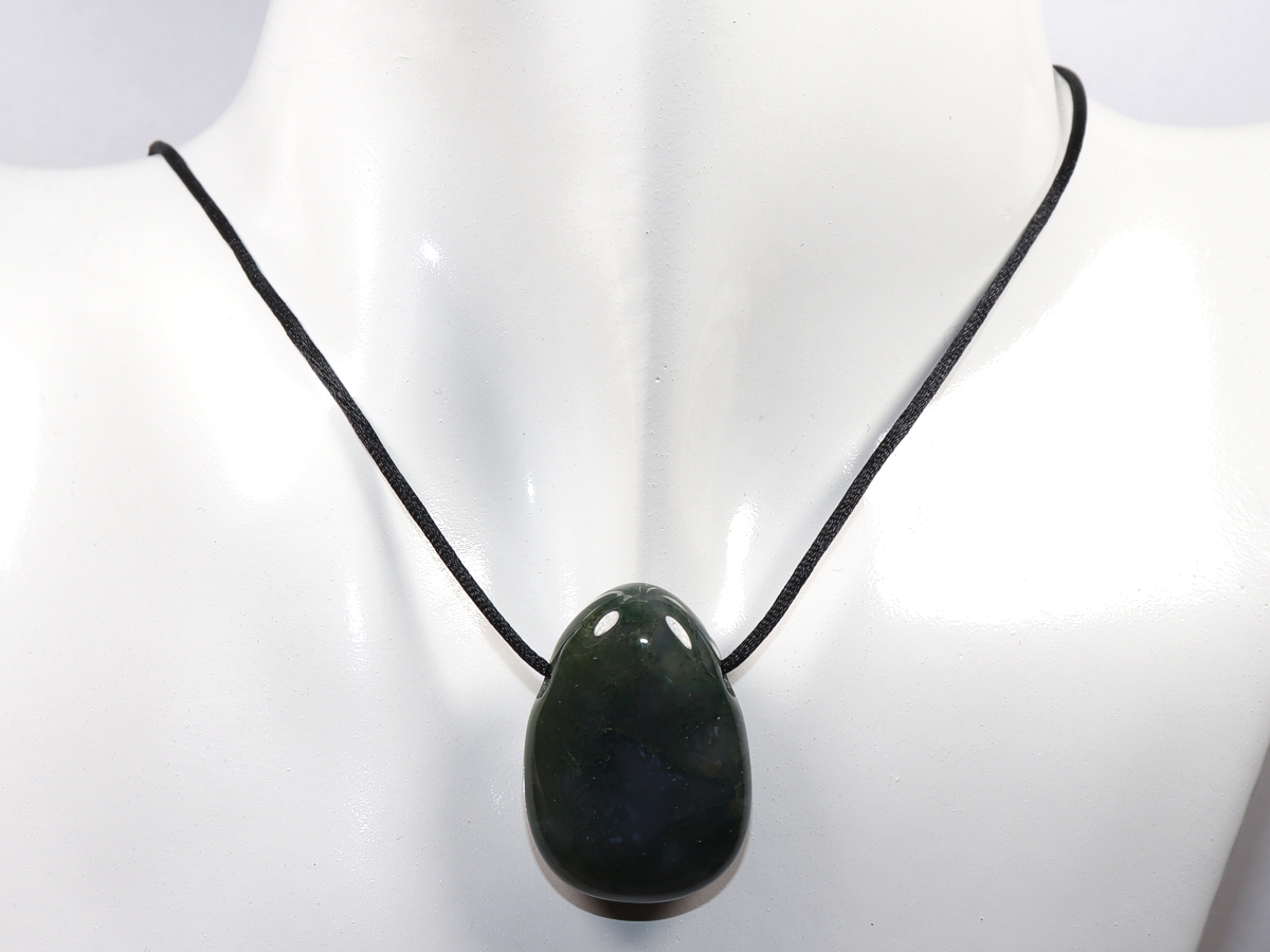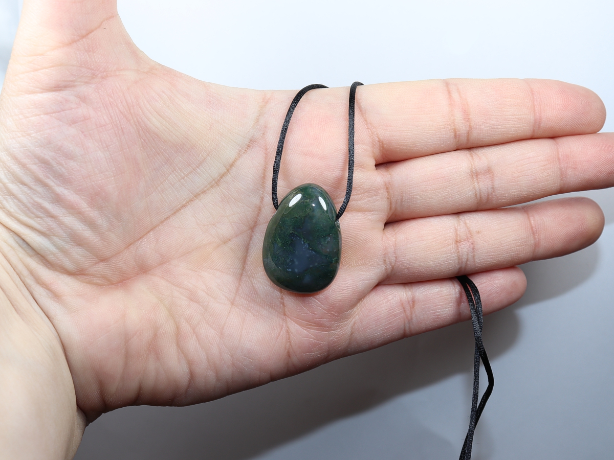 Die Halskette mit Moosachat wird nach Ihren Angaben individualisiert. Sie haben die Wahl zwischen einem schwarzen Band mit einem Verschluss aus Edelstahl oder einer Kette aus Silber 925.