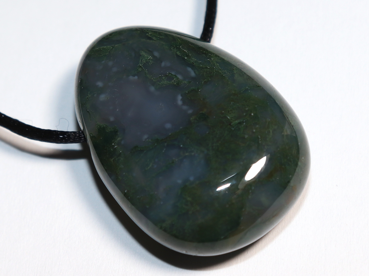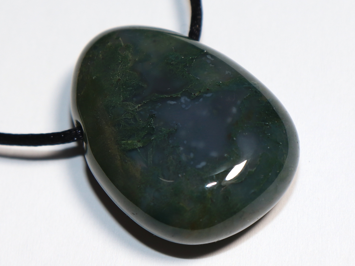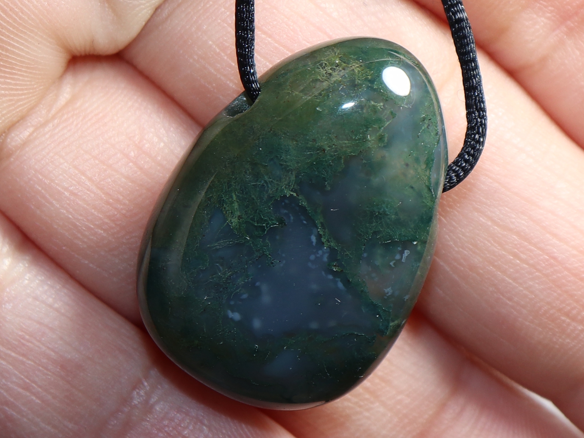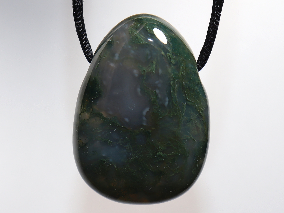 Die Halskette mit Moosachat wird nach Ihren Angaben individualisiert. Sie haben die Wahl zwischen einem schwarzen Band mit einem Verschluss aus Edelstahl oder einer Kette aus Silber 925.