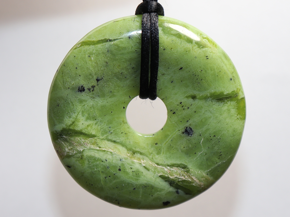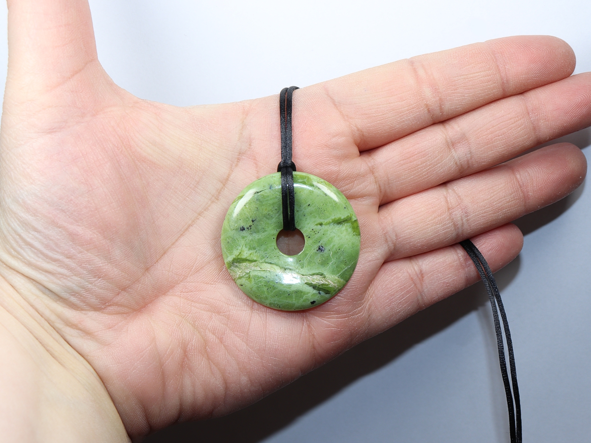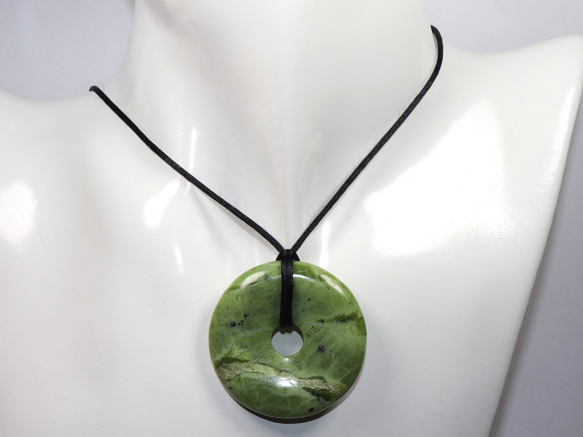 Die Halskette mit dem Donut aus Nephrit und einem schwarzen Band wird nach Ihren Angaben individualisiert. Der Verschluss ist aus Edelstahl.