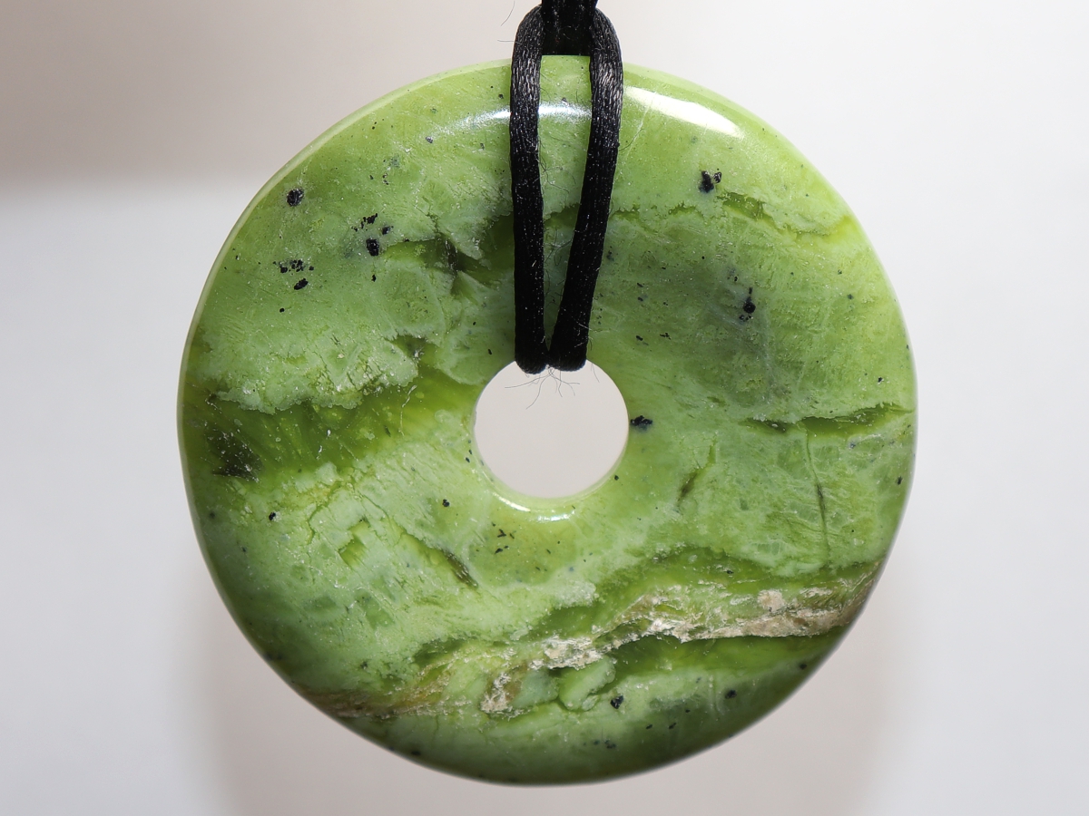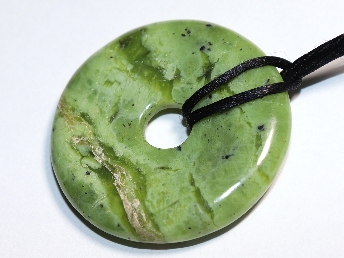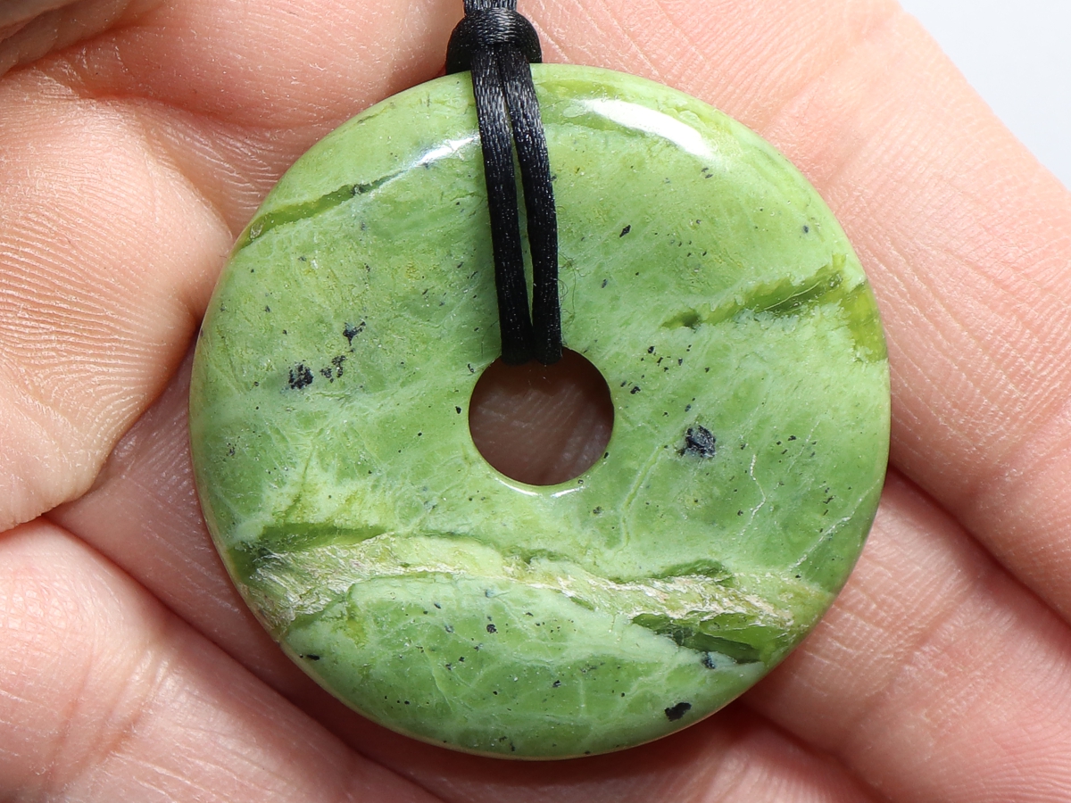 Die Halskette mit dem Donut aus Nephrit und einem schwarzen Band wird nach Ihren Angaben individualisiert. Der Verschluss ist aus Edelstahl.