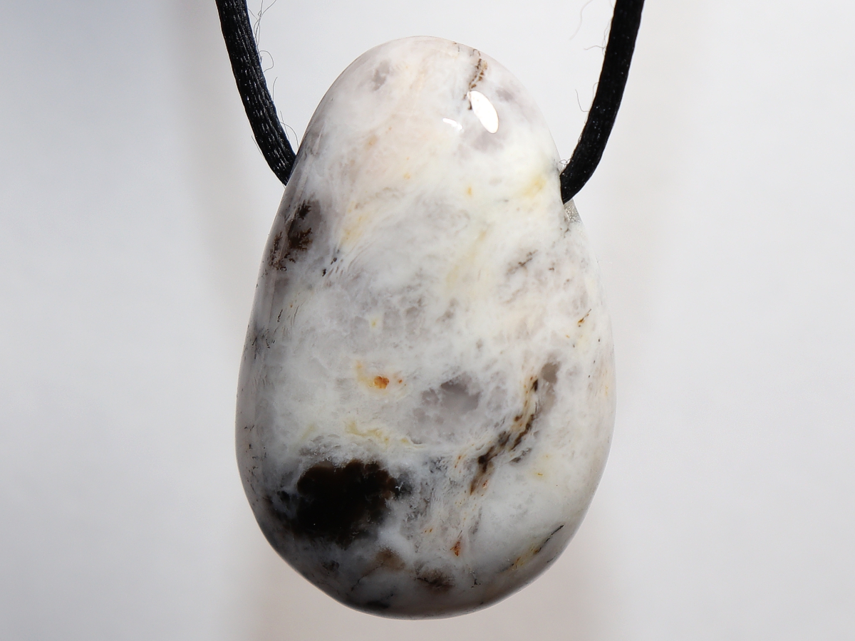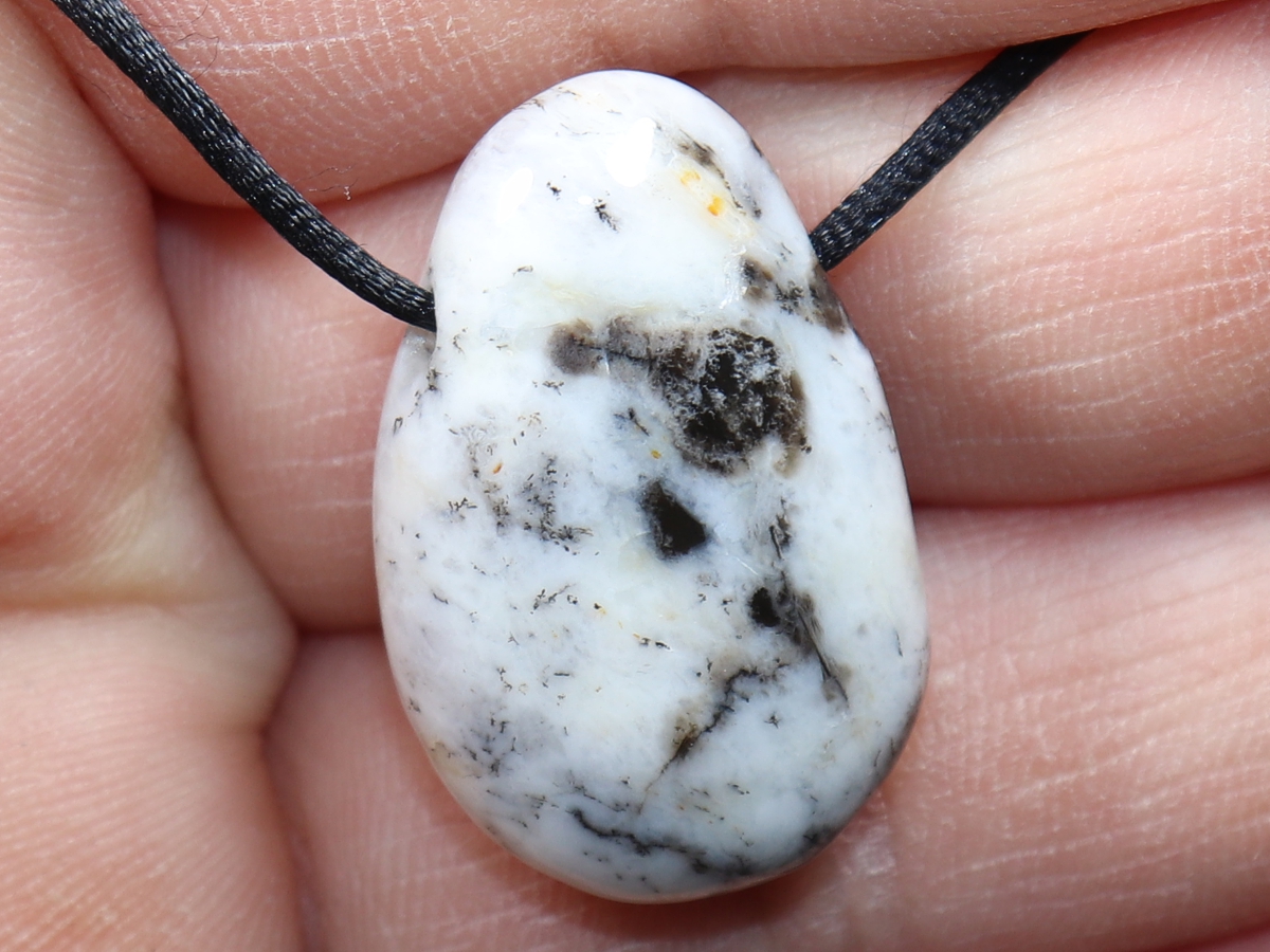Die Halskette mit Opalith wird nach Ihren Angaben individualisiert. Sie haben die Wahl zwischen einem schwarzen Band mit einem Verschluss aus Edelstahl oder einer Kette aus Silber 925.