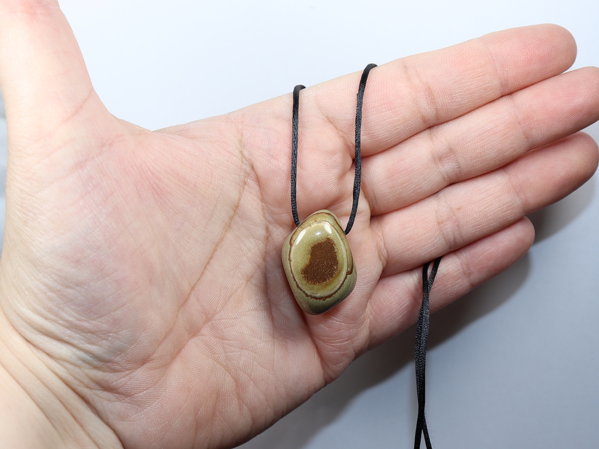 Die Halskette mit Oregon-Picture-Stone wird nach Ihren Angaben individualisiert. Sie haben die Wahl zwischen einem schwarzen Band mit einem Verschluss aus Edelstahl oder einer Kette aus Silber 925.