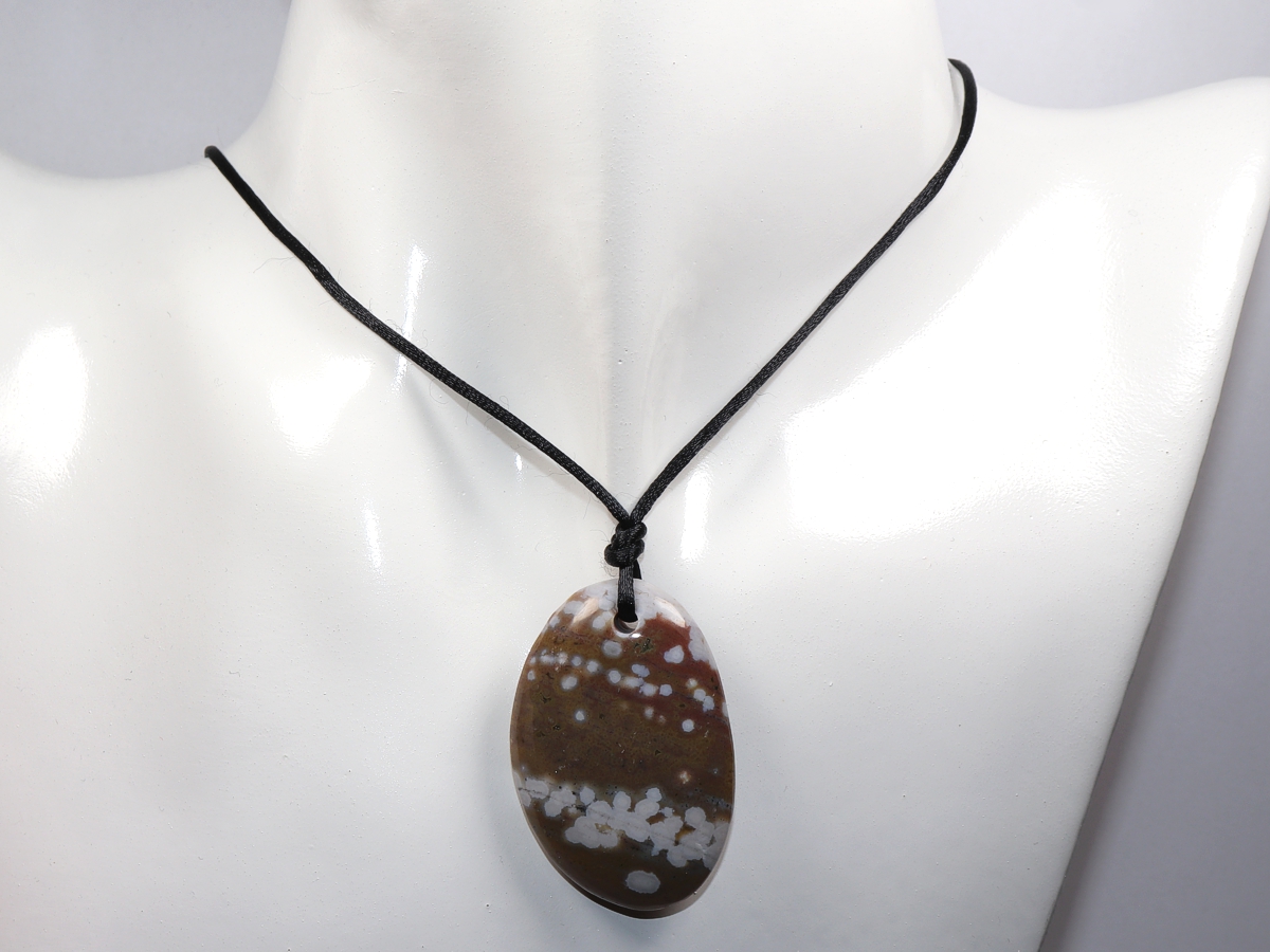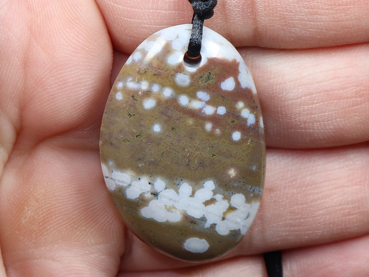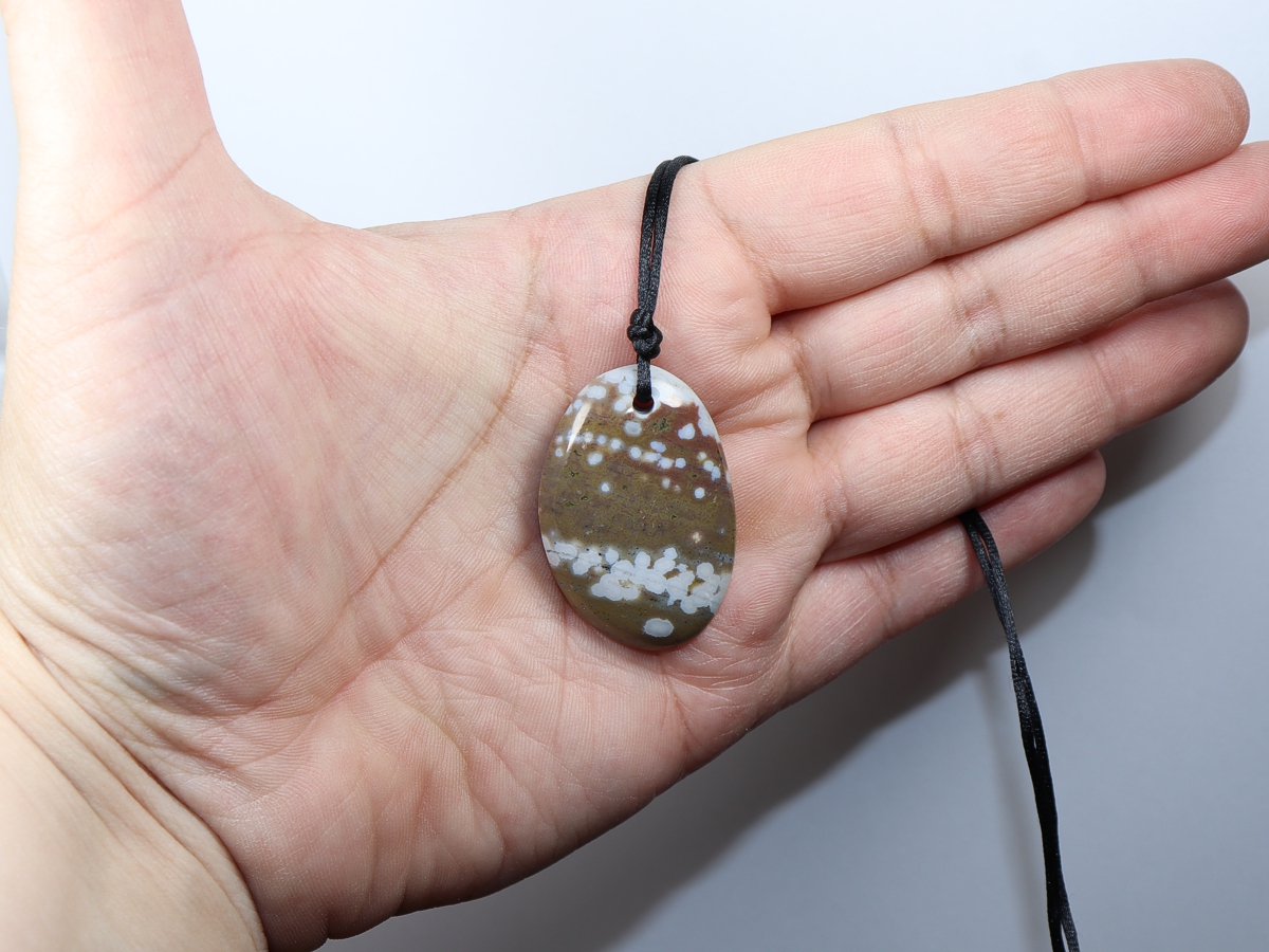 Die Halskette mit Ozeanjaspis und einem schwarzen Band wird nach Ihren Angaben individualisiert. Der Verschluss ist aus Edelstahl.