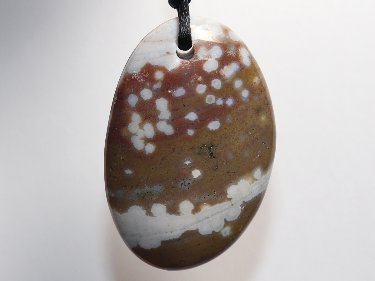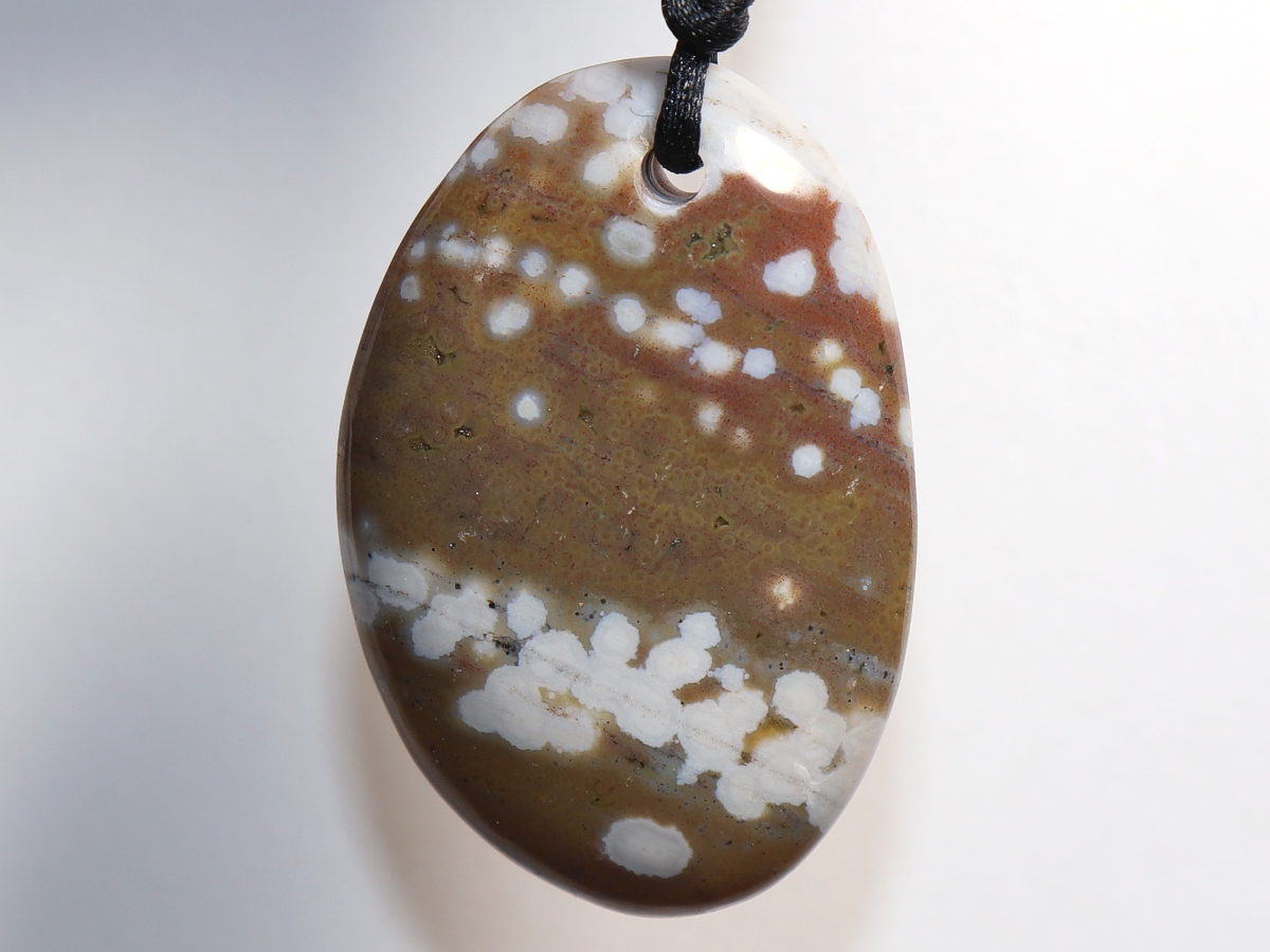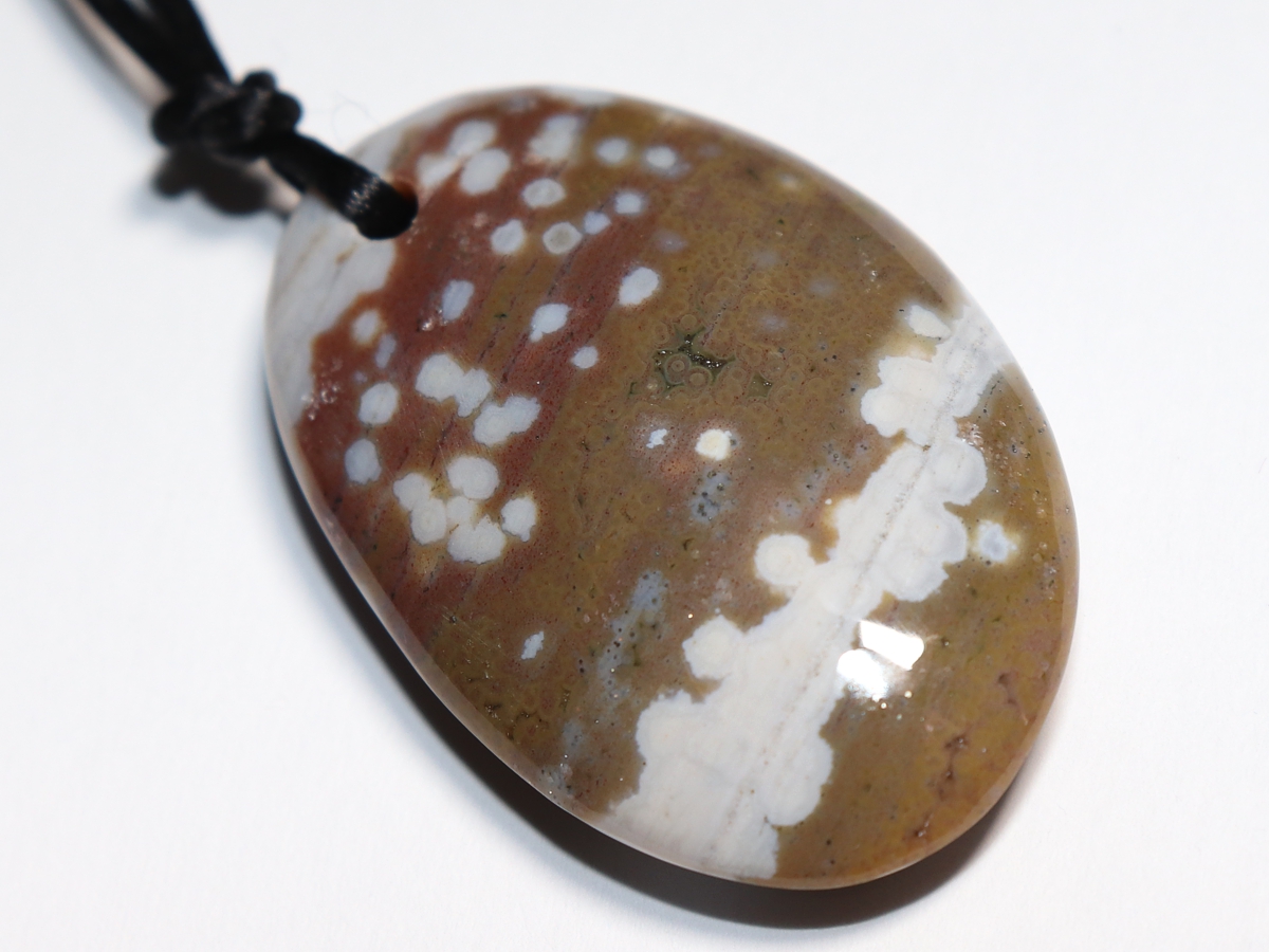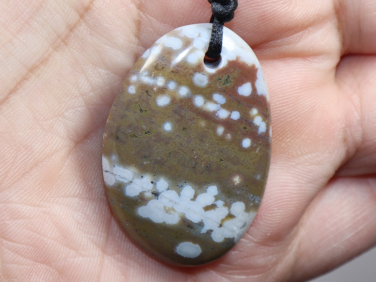 Die Halskette mit Ozeanjaspis und einem schwarzen Band wird nach Ihren Angaben individualisiert. Der Verschluss ist aus Edelstahl.