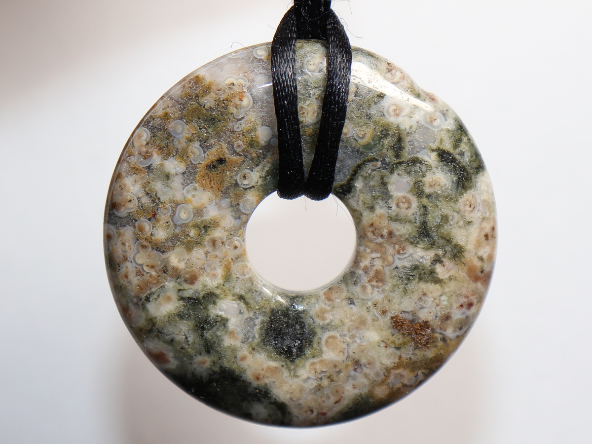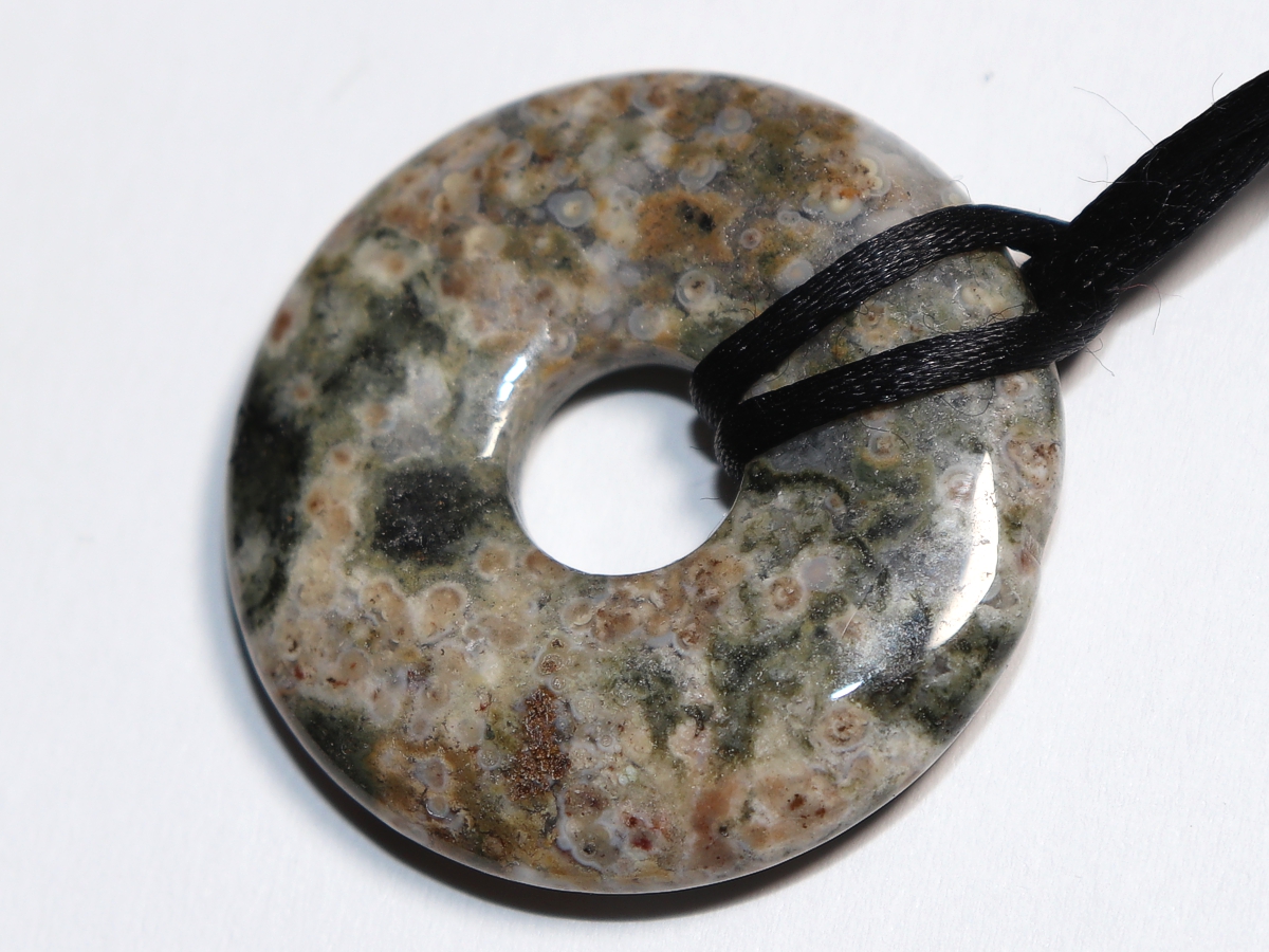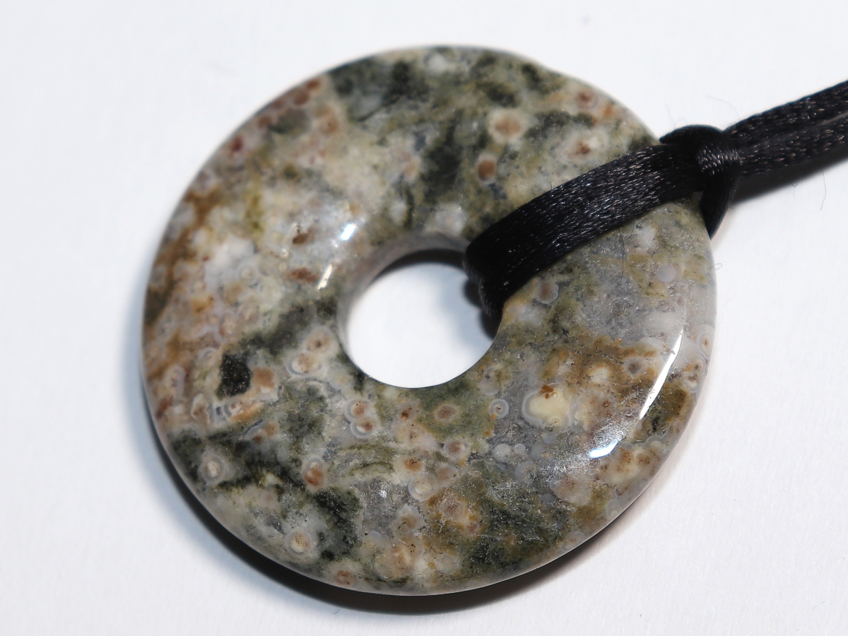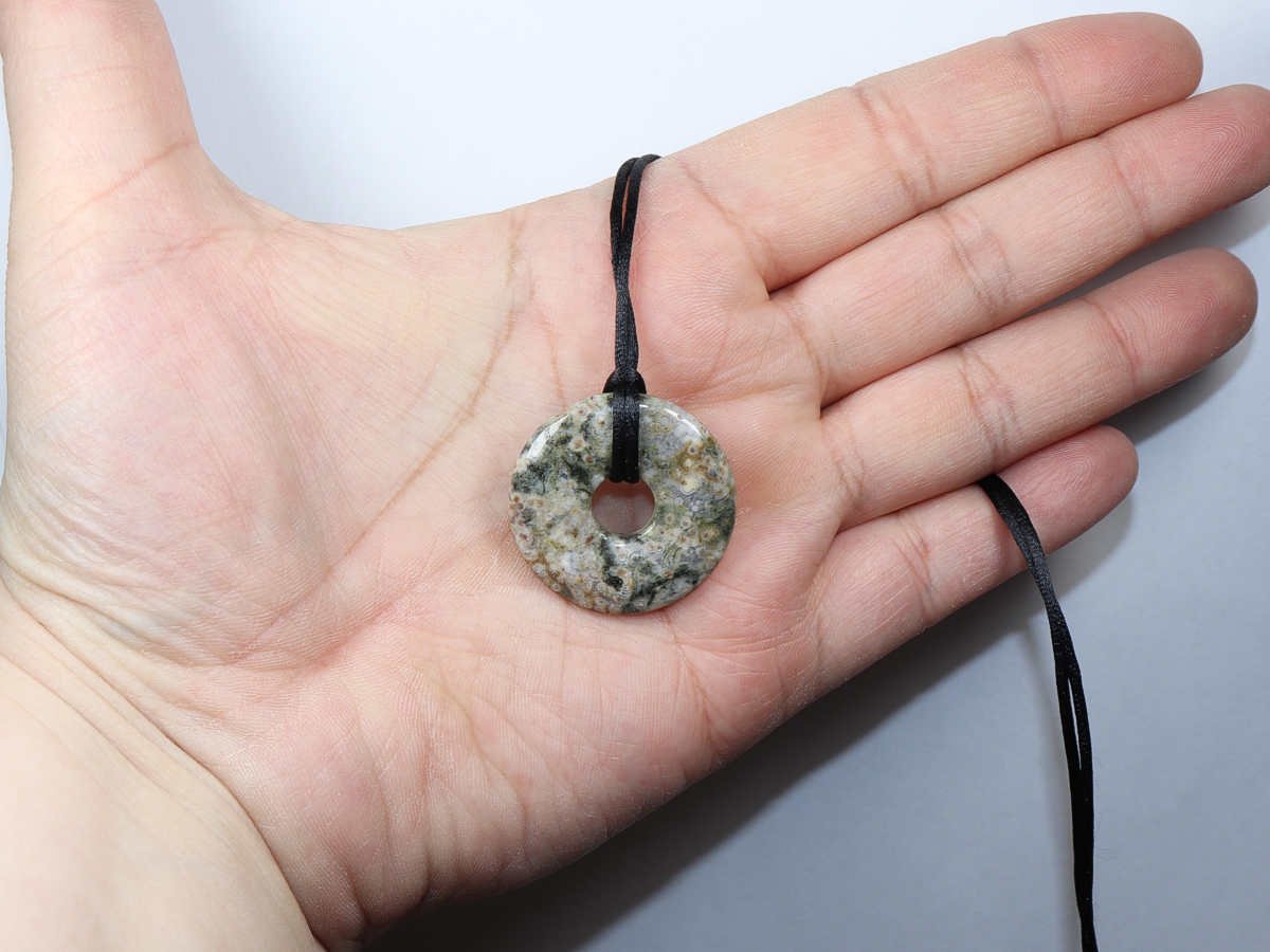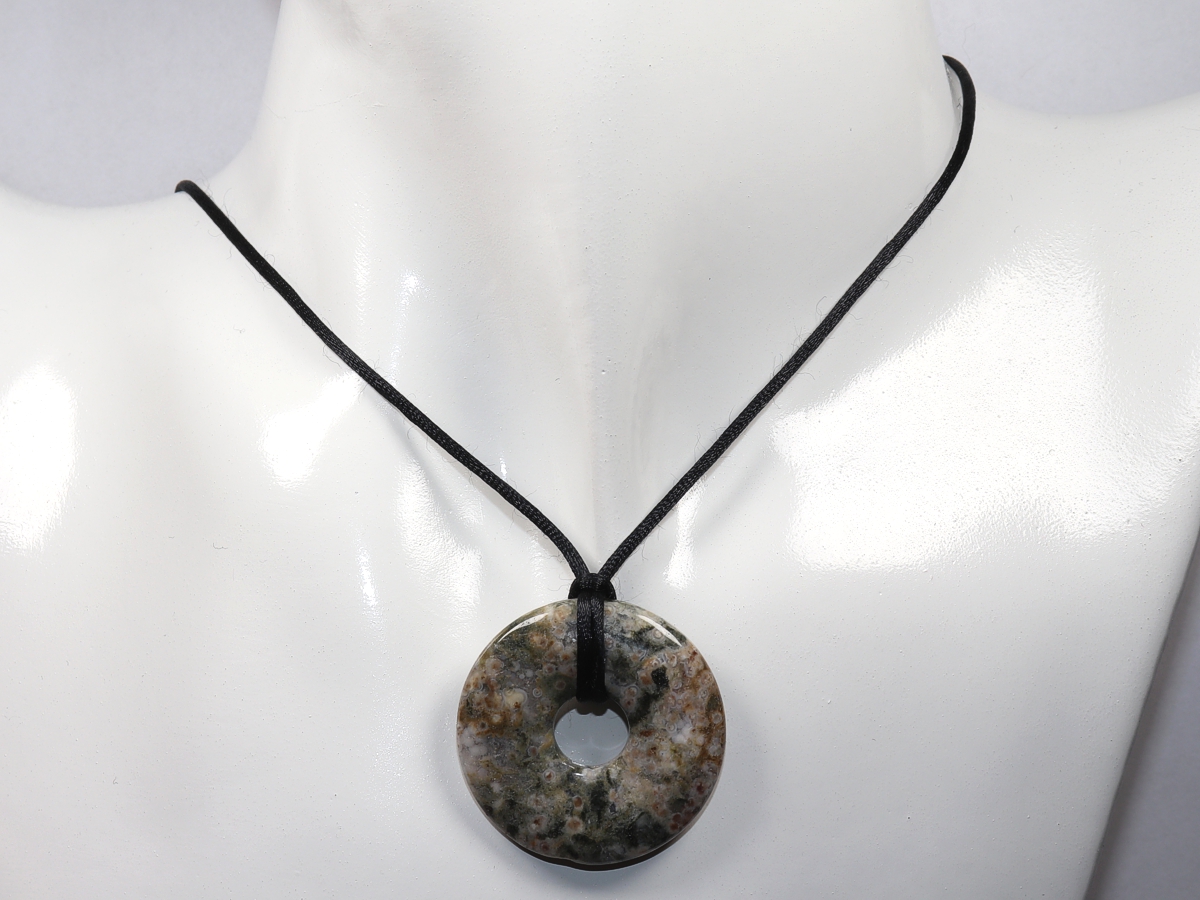Die Halskette mit dem Donut aus Ozeanjaspis und einem schwarzen Band wird nach Ihren Angaben individualisiert. Der Verschluss ist aus Edelstahl.