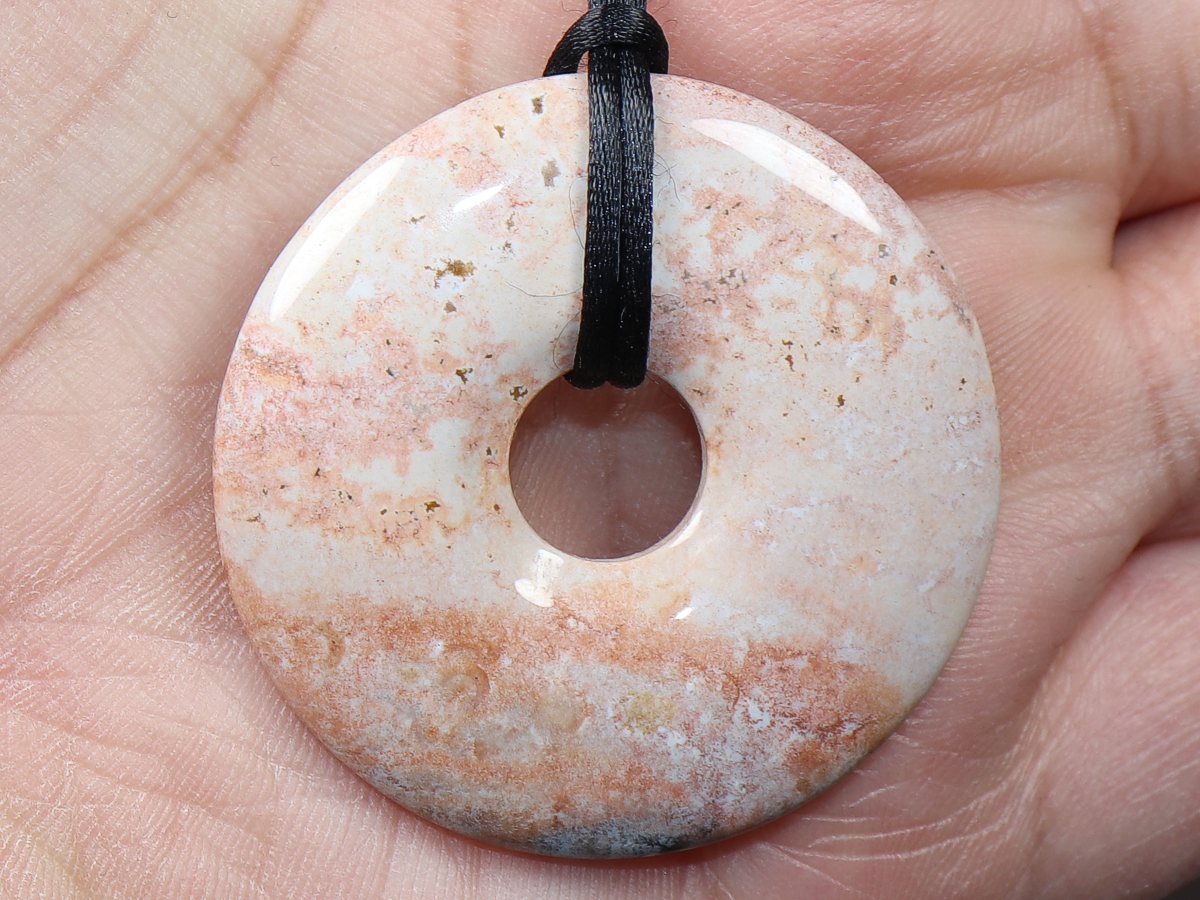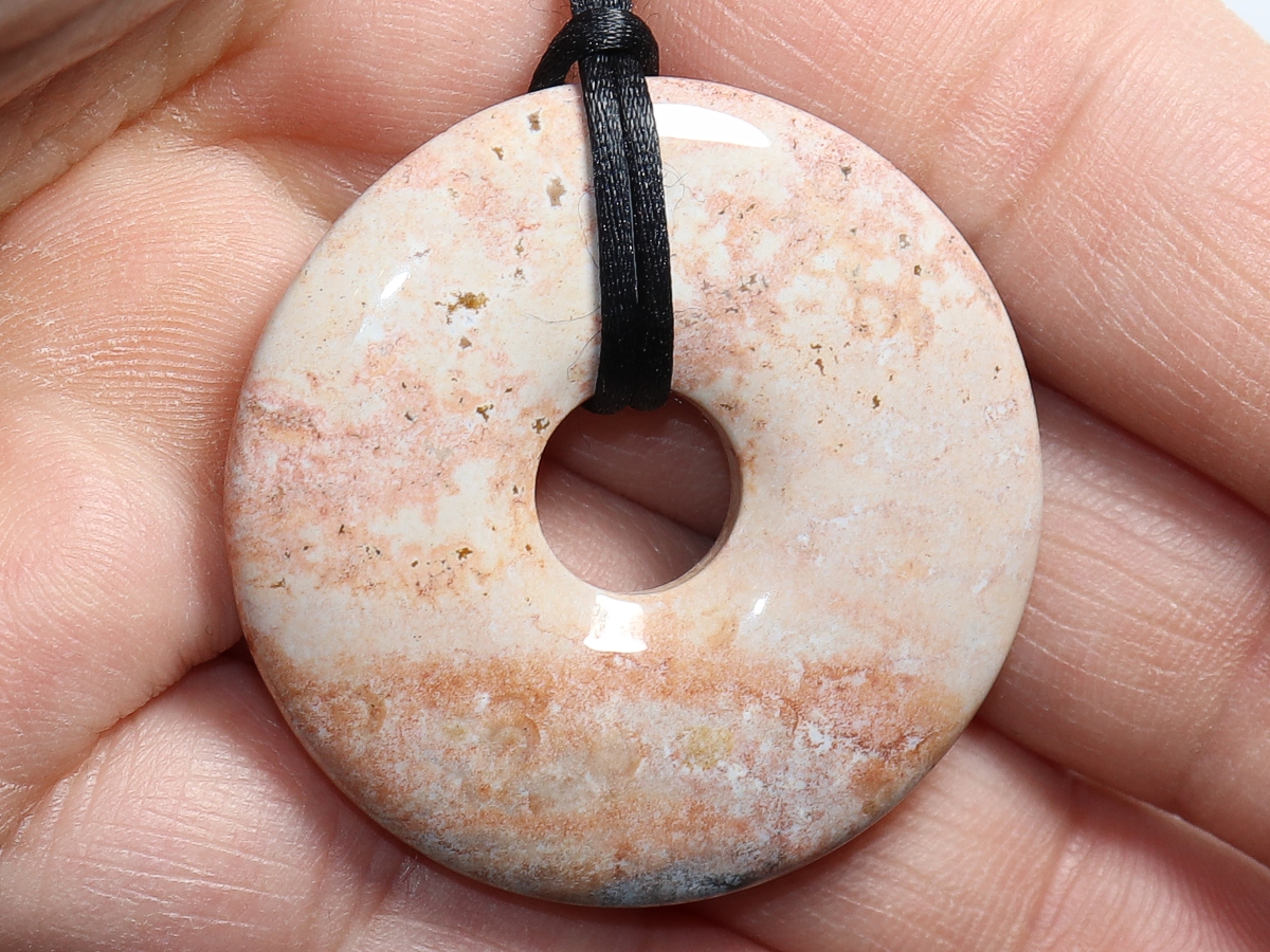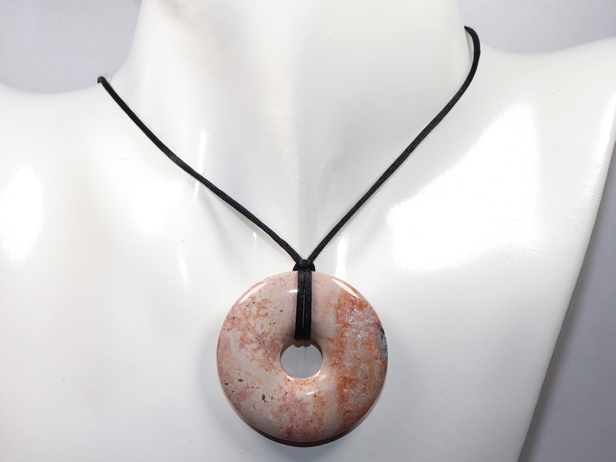 Die Halskette mit dem Donut aus Ozeanjaspis und einem schwarzen Band wird nach Ihren Angaben individualisiert. Der Verschluss ist aus Edelstahl.