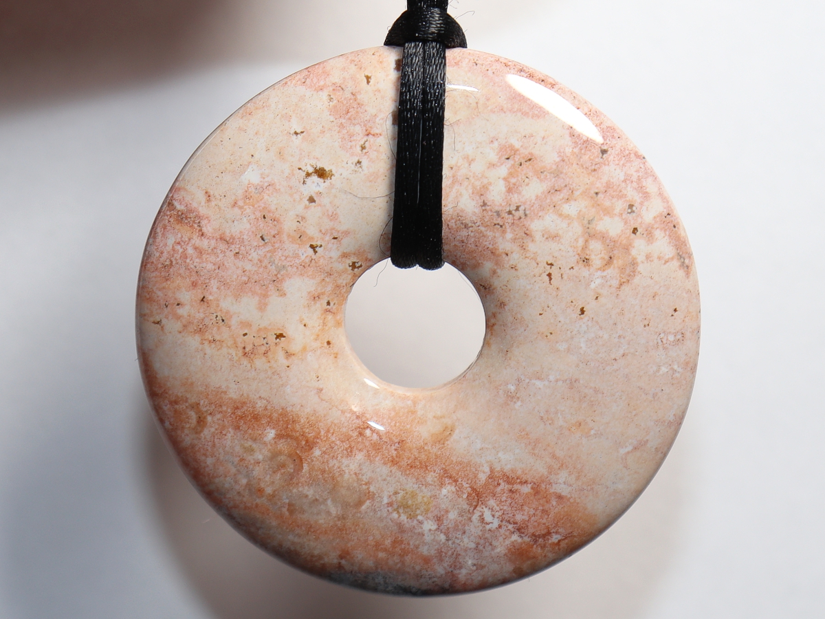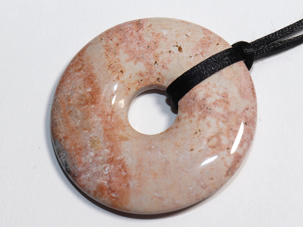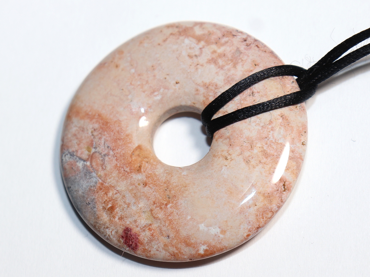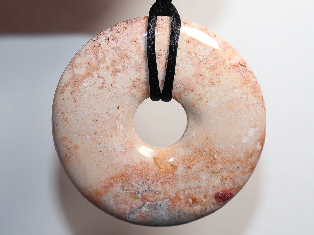 Die Halskette mit dem Donut aus Ozeanjaspis und einem schwarzen Band wird nach Ihren Angaben individualisiert. Der Verschluss ist aus Edelstahl.