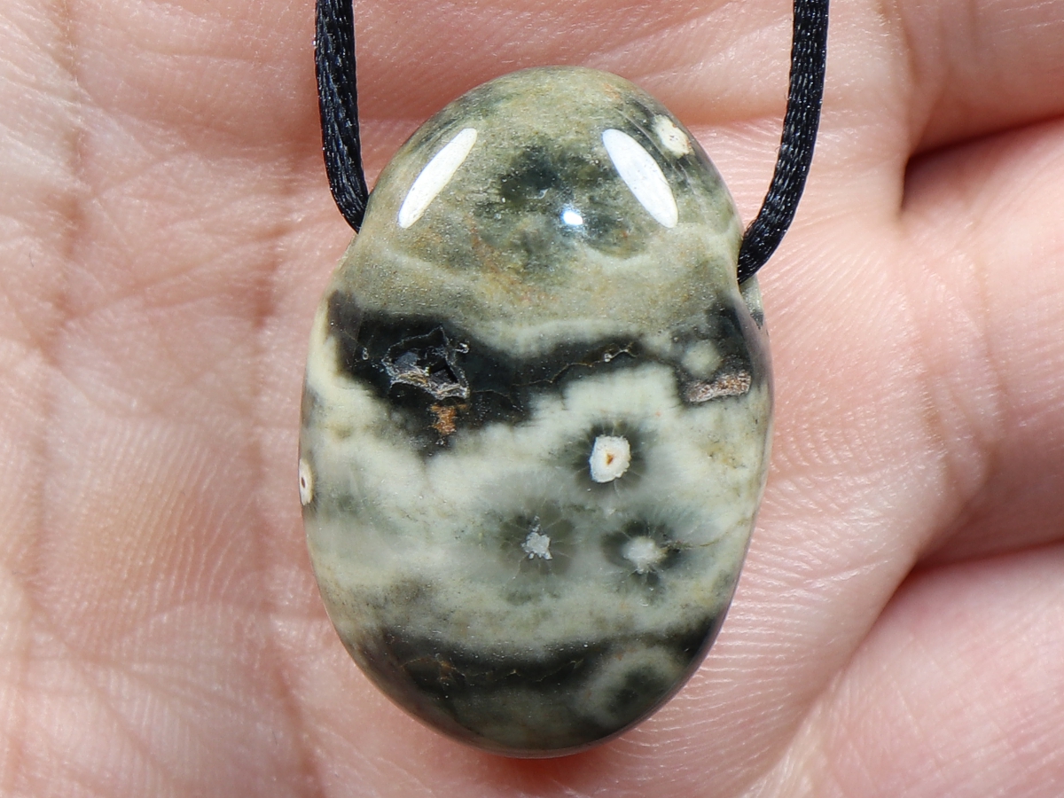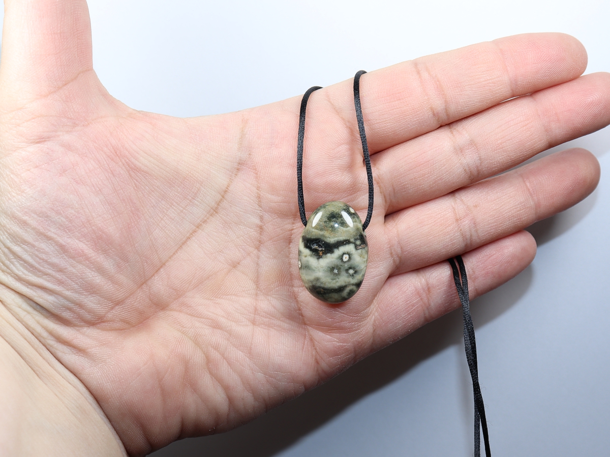 Die Halskette mit Ozeanjaspis wird nach Ihren Angaben individualisiert. Sie haben die Wahl zwischen einem schwarzen Band mit einem Verschluss aus Edelstahl oder einer Kette aus Silber 925.