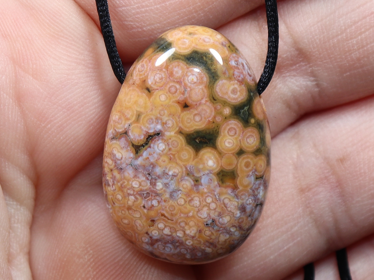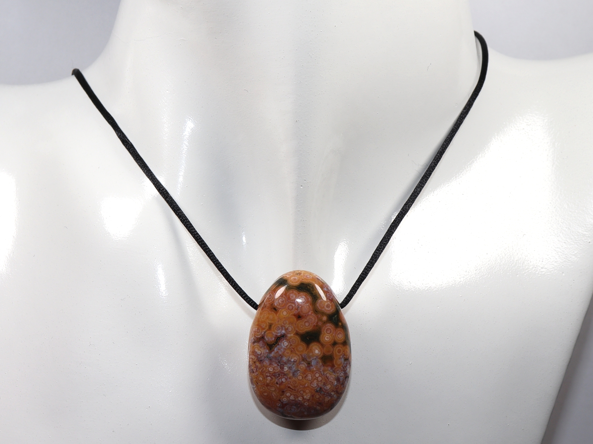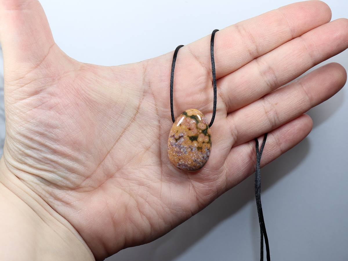 Die Halskette mit Ozeanjaspis wird nach Ihren Angaben individualisiert. Sie haben die Wahl zwischen einem schwarzen Band mit einem Verschluss aus Edelstahl oder einer Kette aus Silber 925.