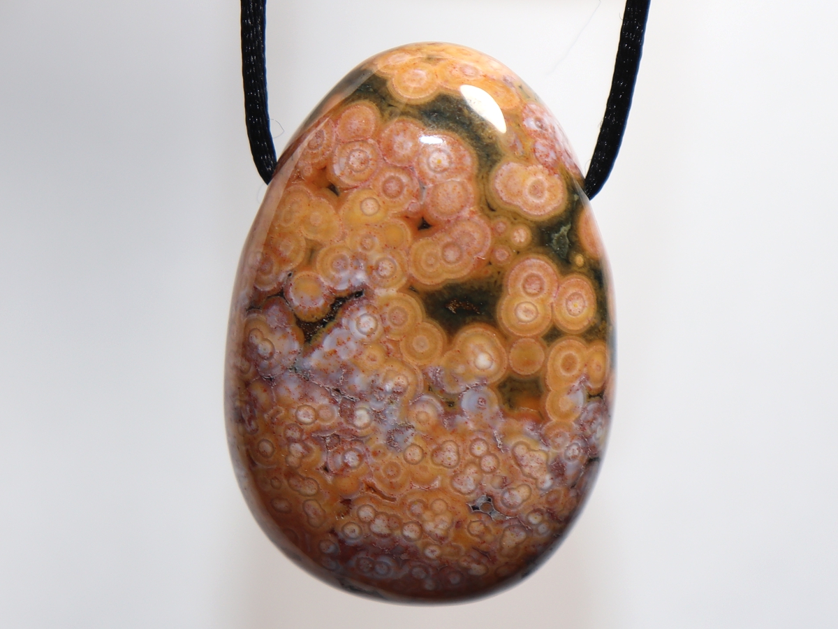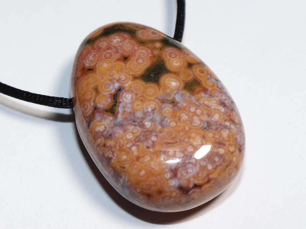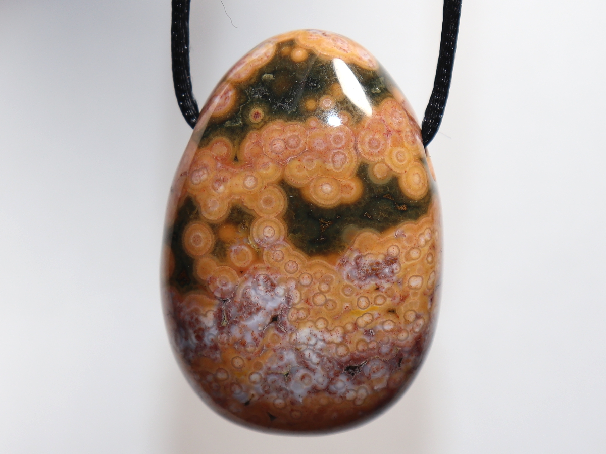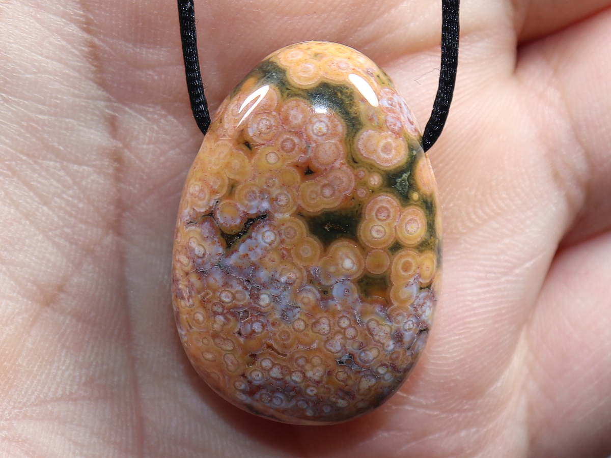 Die Halskette mit Ozeanjaspis wird nach Ihren Angaben individualisiert. Sie haben die Wahl zwischen einem schwarzen Band mit einem Verschluss aus Edelstahl oder einer Kette aus Silber 925.
