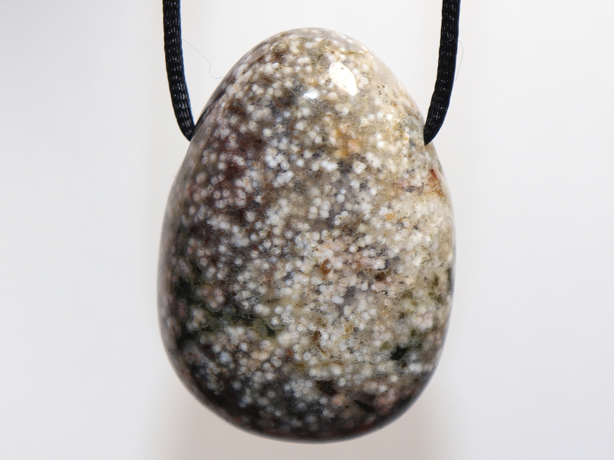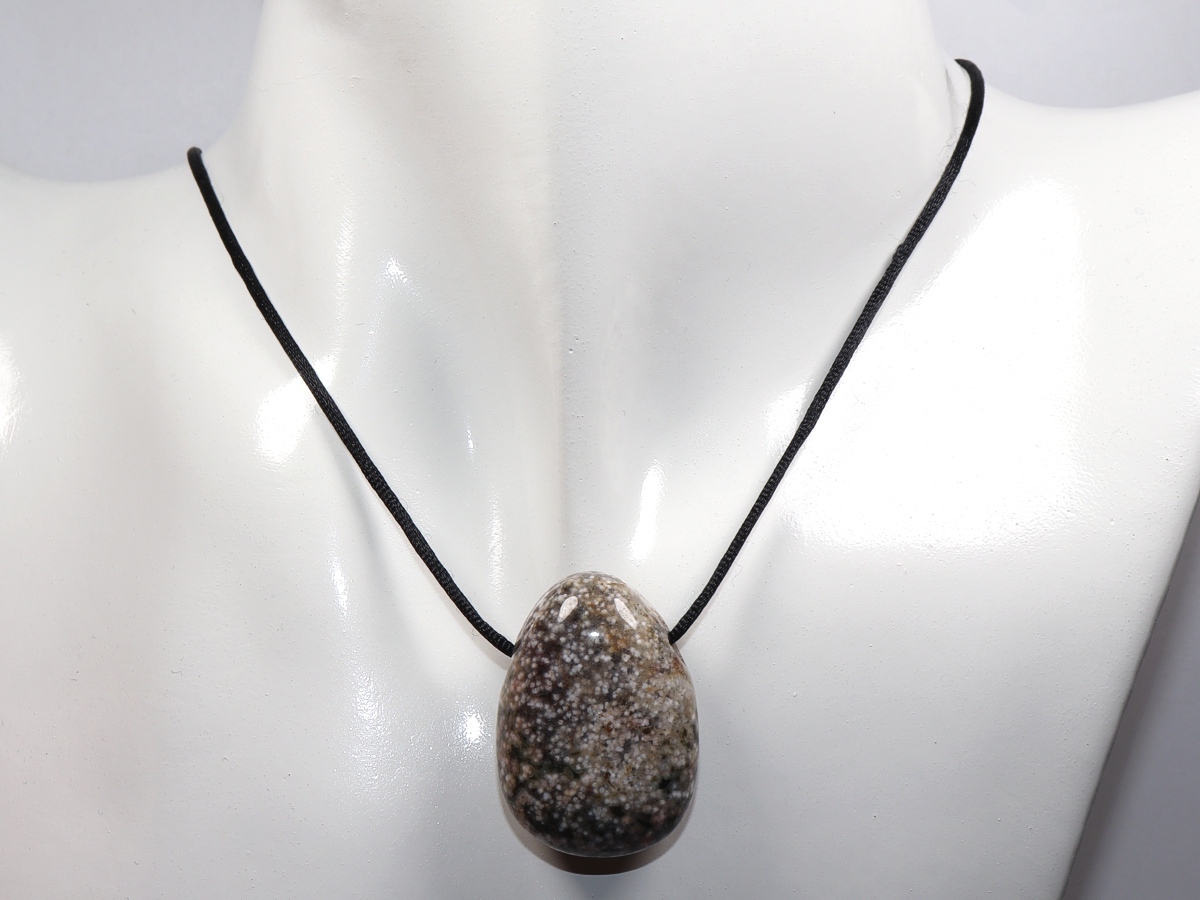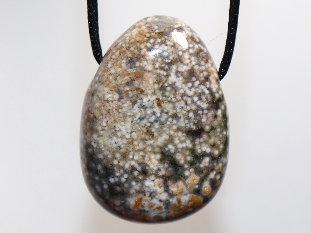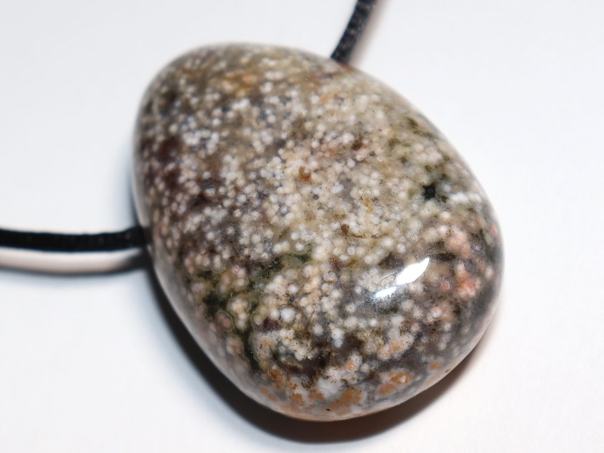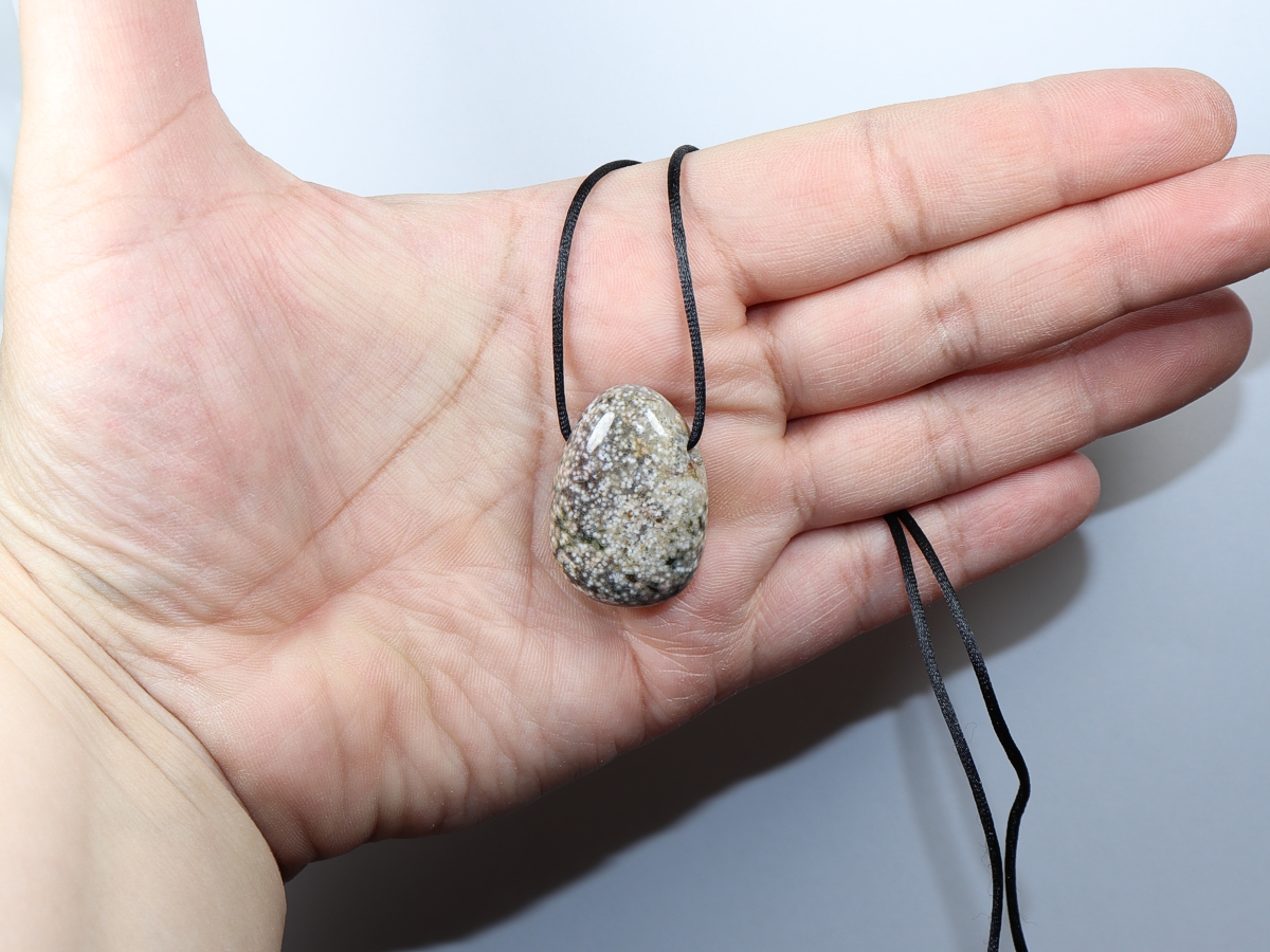 Die Halskette mit Ozeanjaspis wird nach Ihren Angaben individualisiert. Sie haben die Wahl zwischen einem schwarzen Band mit einem Verschluss aus Edelstahl oder einer Kette aus Silber 925.