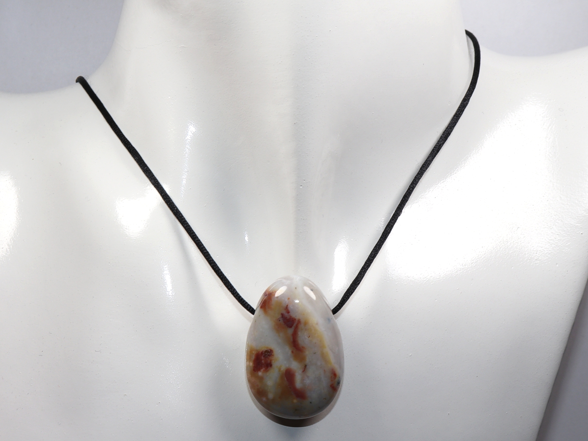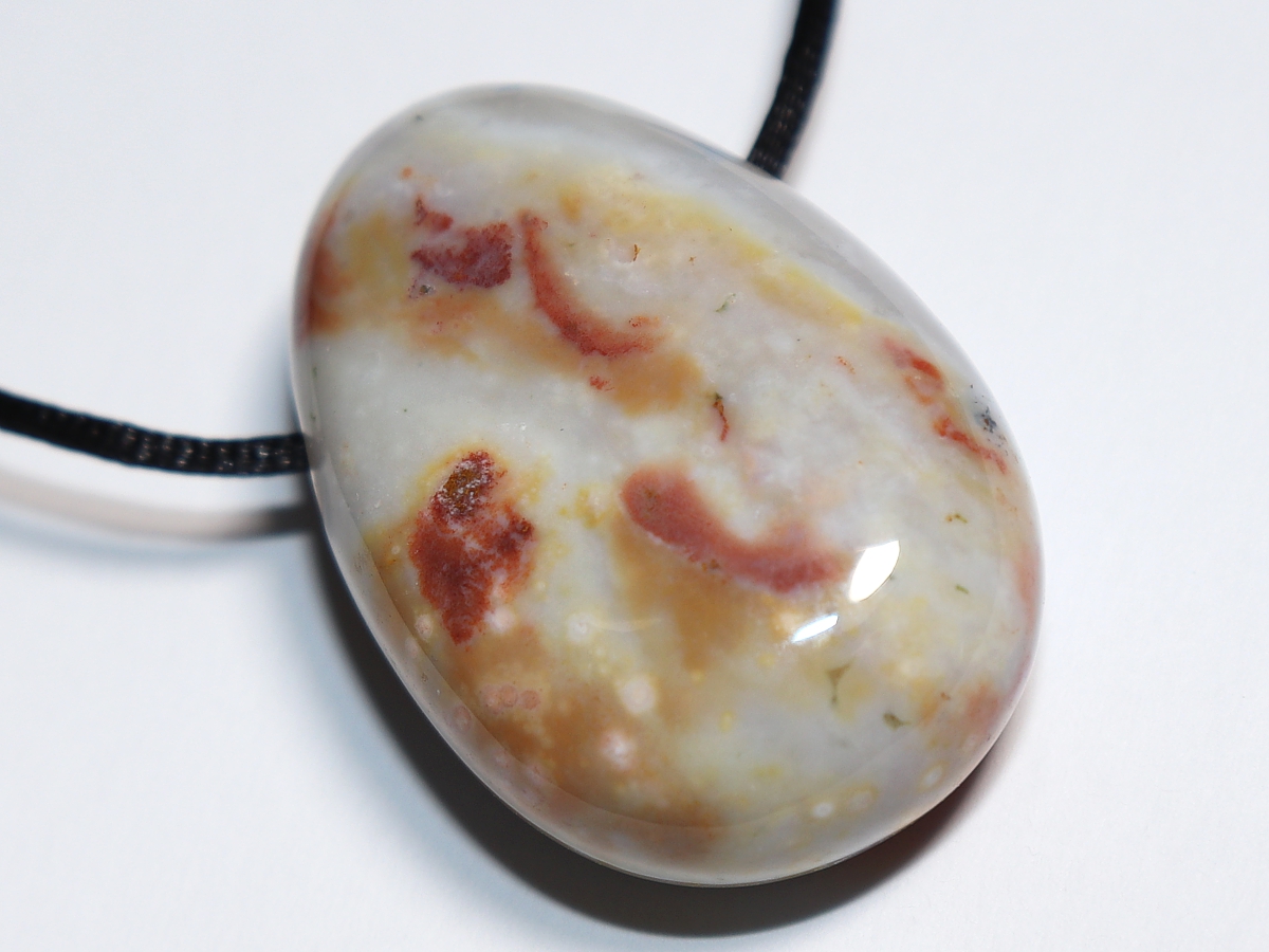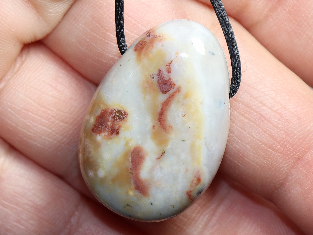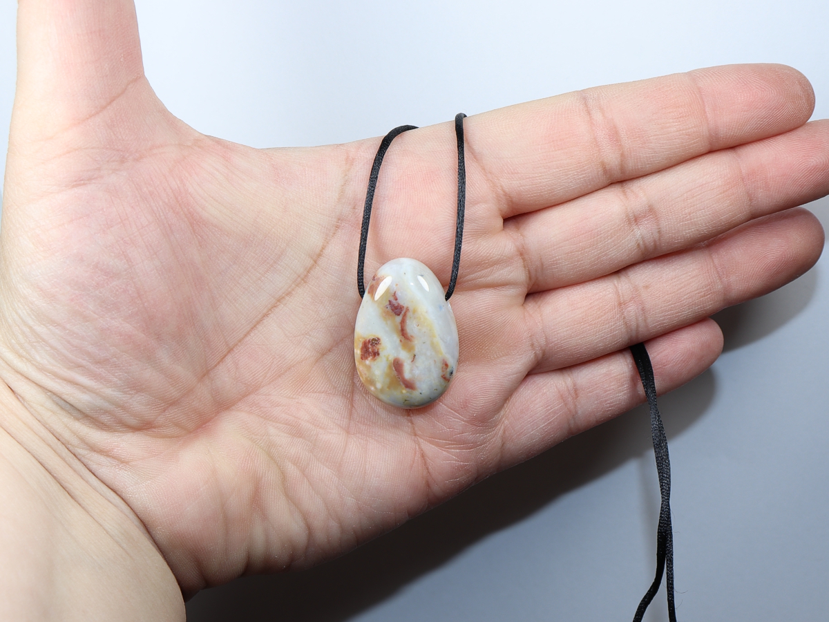 Die Halskette mit Ozeanjaspis wird nach Ihren Angaben individualisiert. Sie haben die Wahl zwischen einem schwarzen Band mit einem Verschluss aus Edelstahl oder einer Kette aus Silber 925.