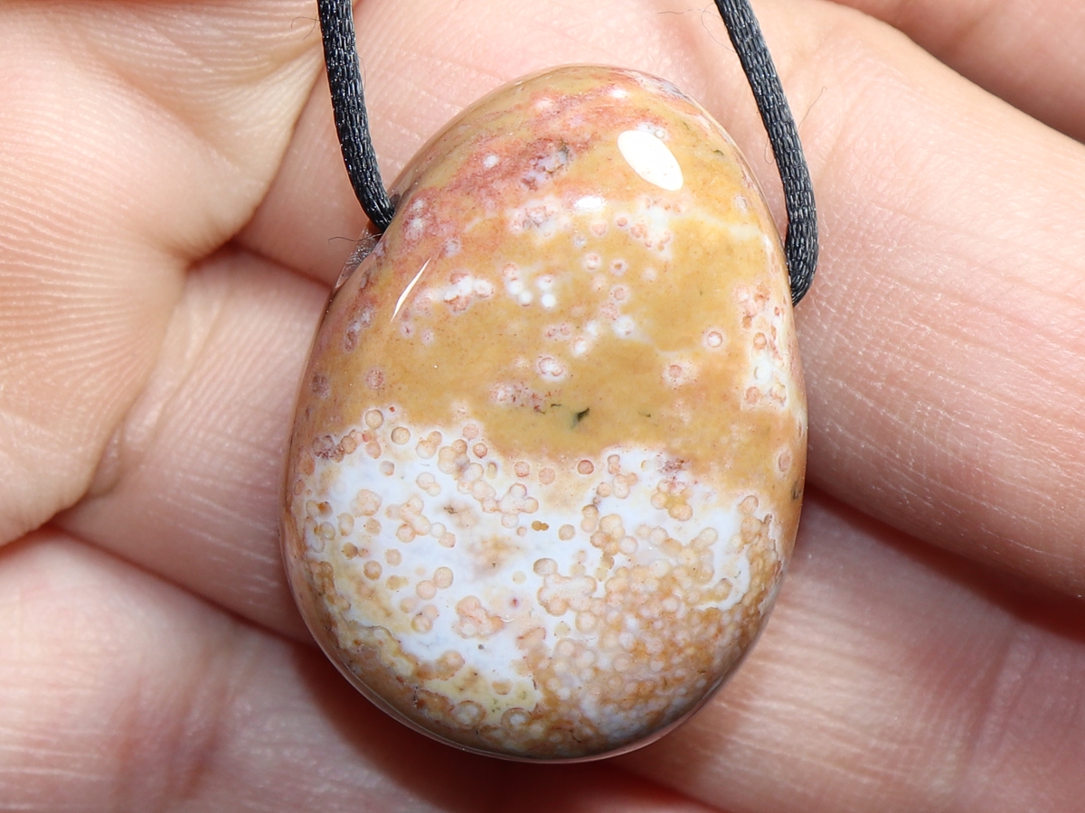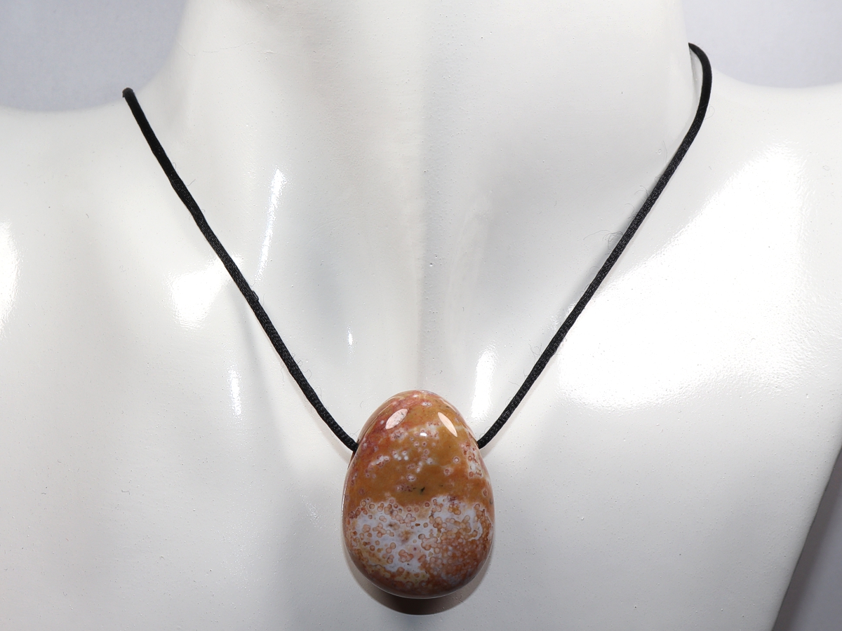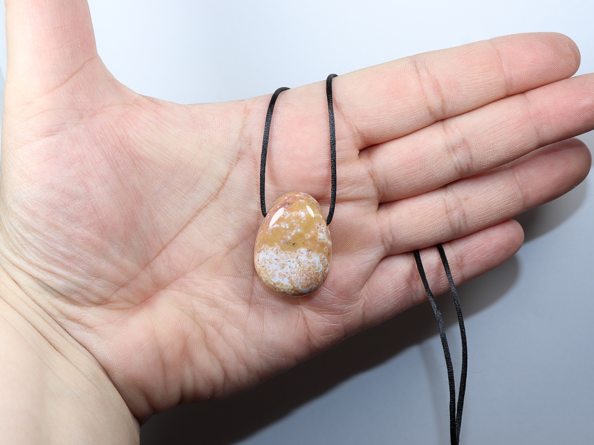 Die Halskette mit Ozeanjaspis wird nach Ihren Angaben individualisiert. Sie haben die Wahl zwischen einem schwarzen Band mit einem Verschluss aus Edelstahl oder einer Kette aus Silber 925.