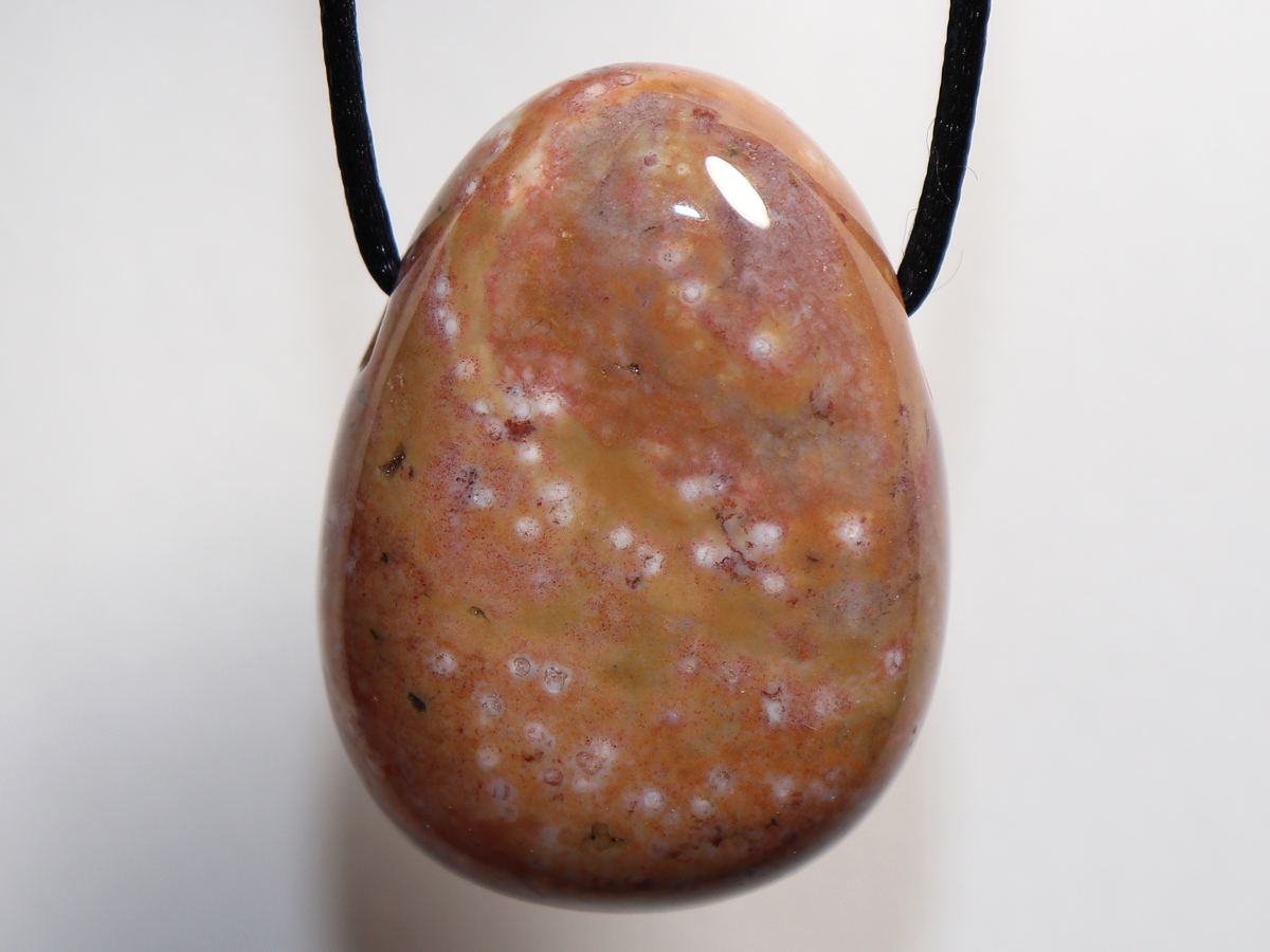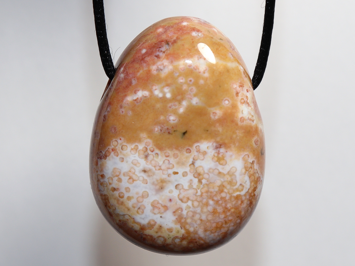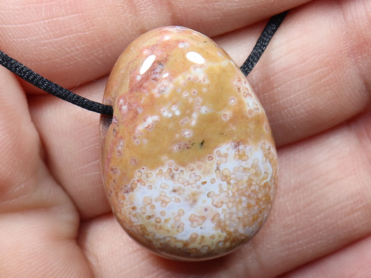 Die Halskette mit Ozeanjaspis wird nach Ihren Angaben individualisiert. Sie haben die Wahl zwischen einem schwarzen Band mit einem Verschluss aus Edelstahl oder einer Kette aus Silber 925.