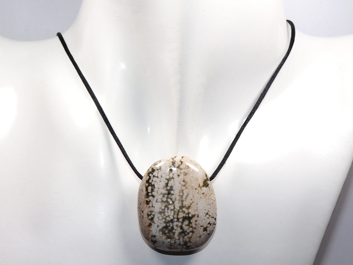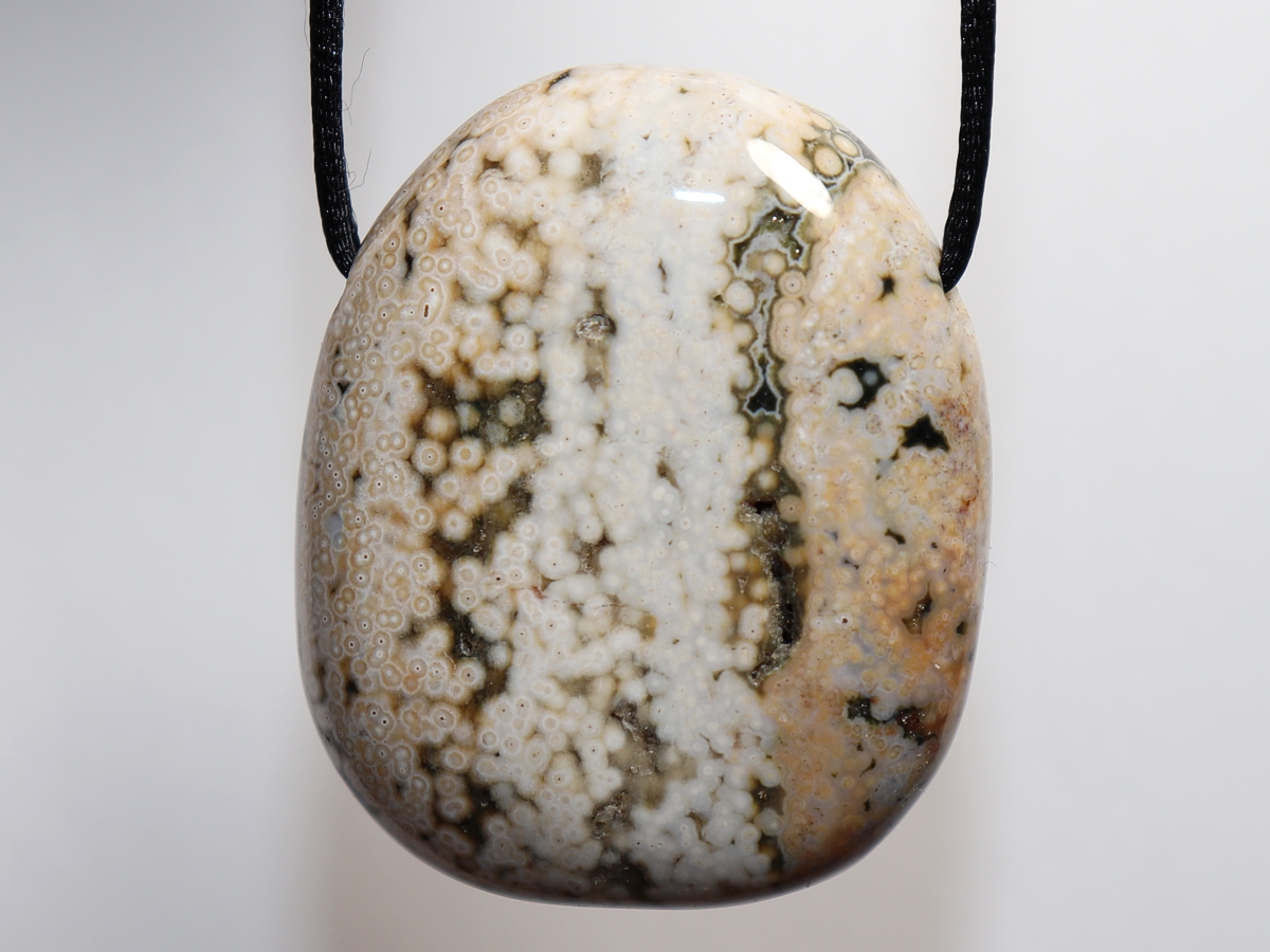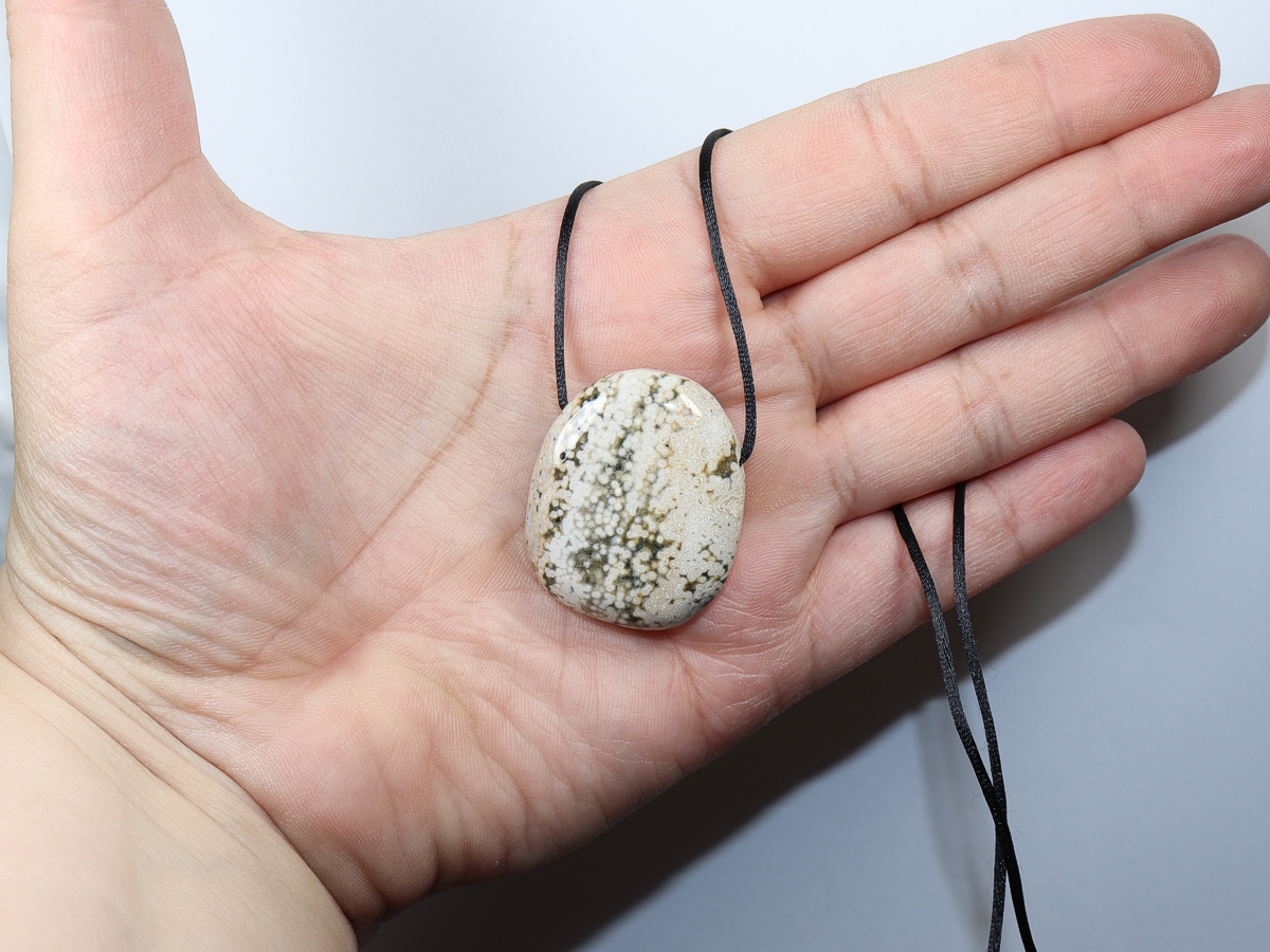 Die Halskette mit Ozeanjaspis wird nach Ihren Angaben individualisiert. Sie haben die Wahl zwischen einem schwarzen Band mit einem Verschluss aus Edelstahl oder einer Kette aus Silber 925.
