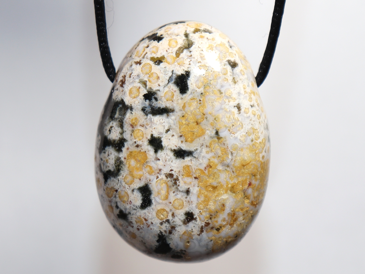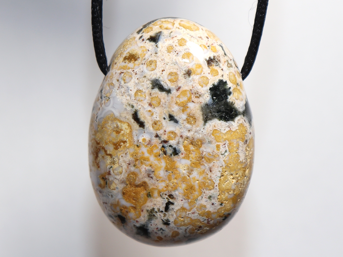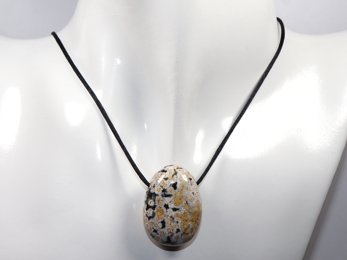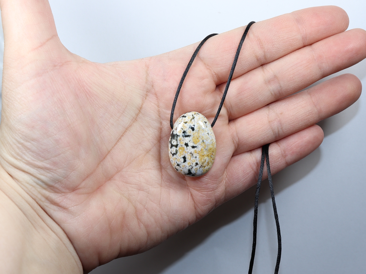 Die Halskette mit Ozeanjaspis wird nach Ihren Angaben individualisiert. Sie haben die Wahl zwischen einem schwarzen Band mit einem Verschluss aus Edelstahl oder einer Kette aus Silber 925.