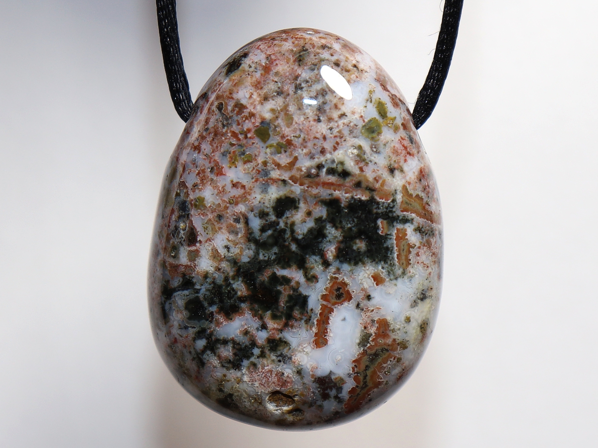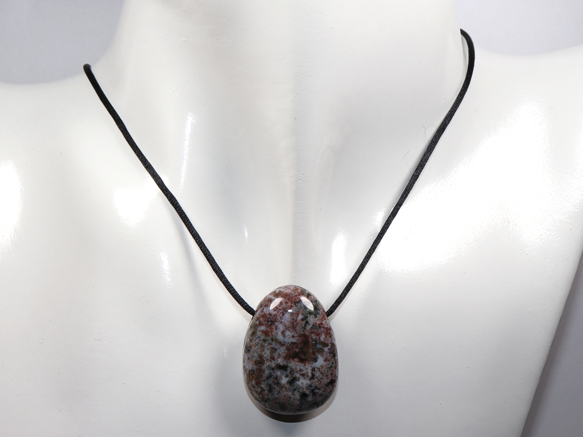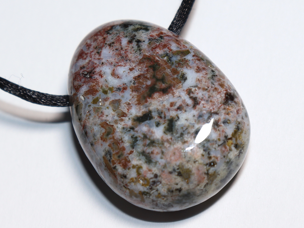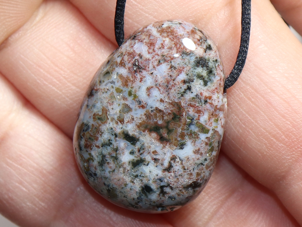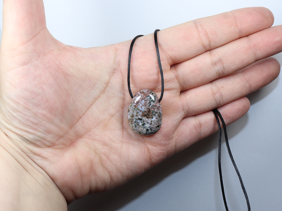 Die Halskette mit Ozeanjaspis wird nach Ihren Angaben individualisiert. Sie haben die Wahl zwischen einem schwarzen Band mit einem Verschluss aus Edelstahl oder einer Kette aus Silber 925.