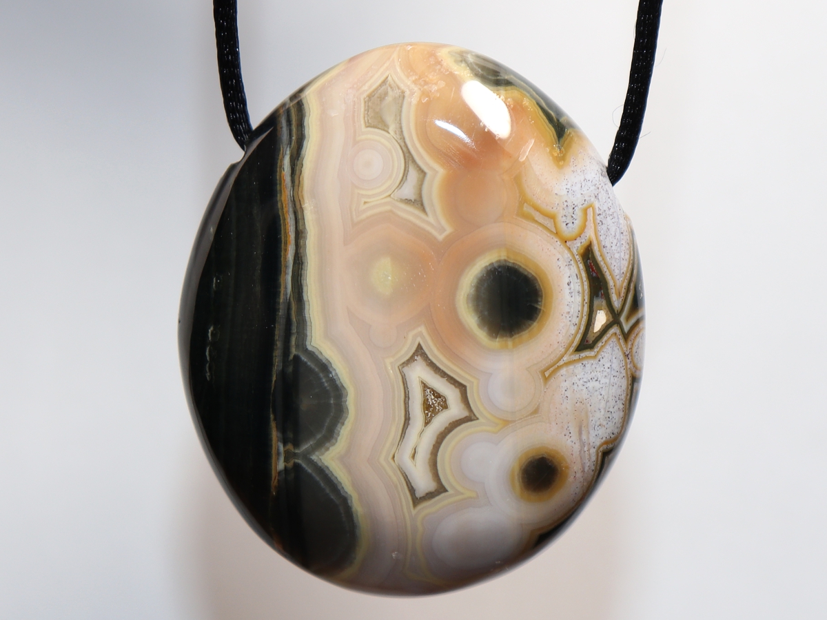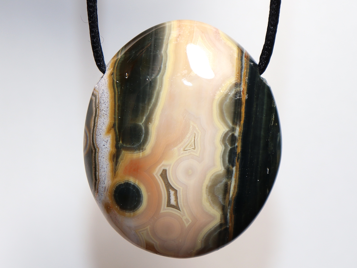 Das Band wird lose (ohne Verschluss) mit einer Länge von 1,5 m mit dem Stein geliefert. Wählen Sie hierfür bitte im Dropdown-Feld "weitere Optionen / Bandfarben" die Variante "Band ohne Verschluss | schwarz | 1,5 m" aus.