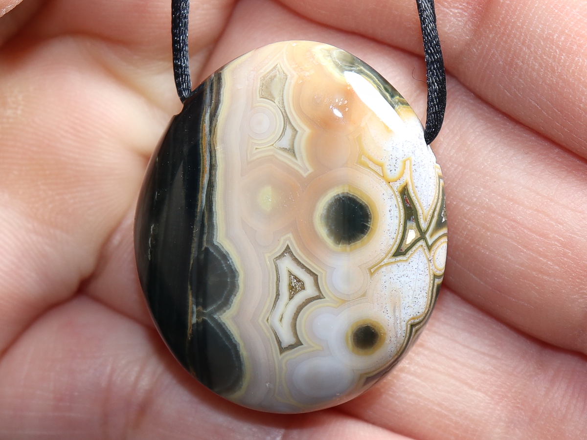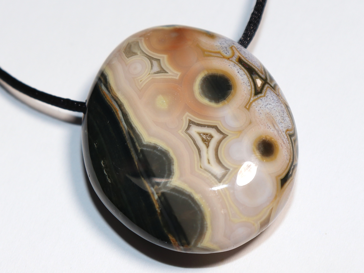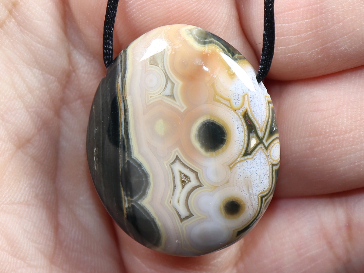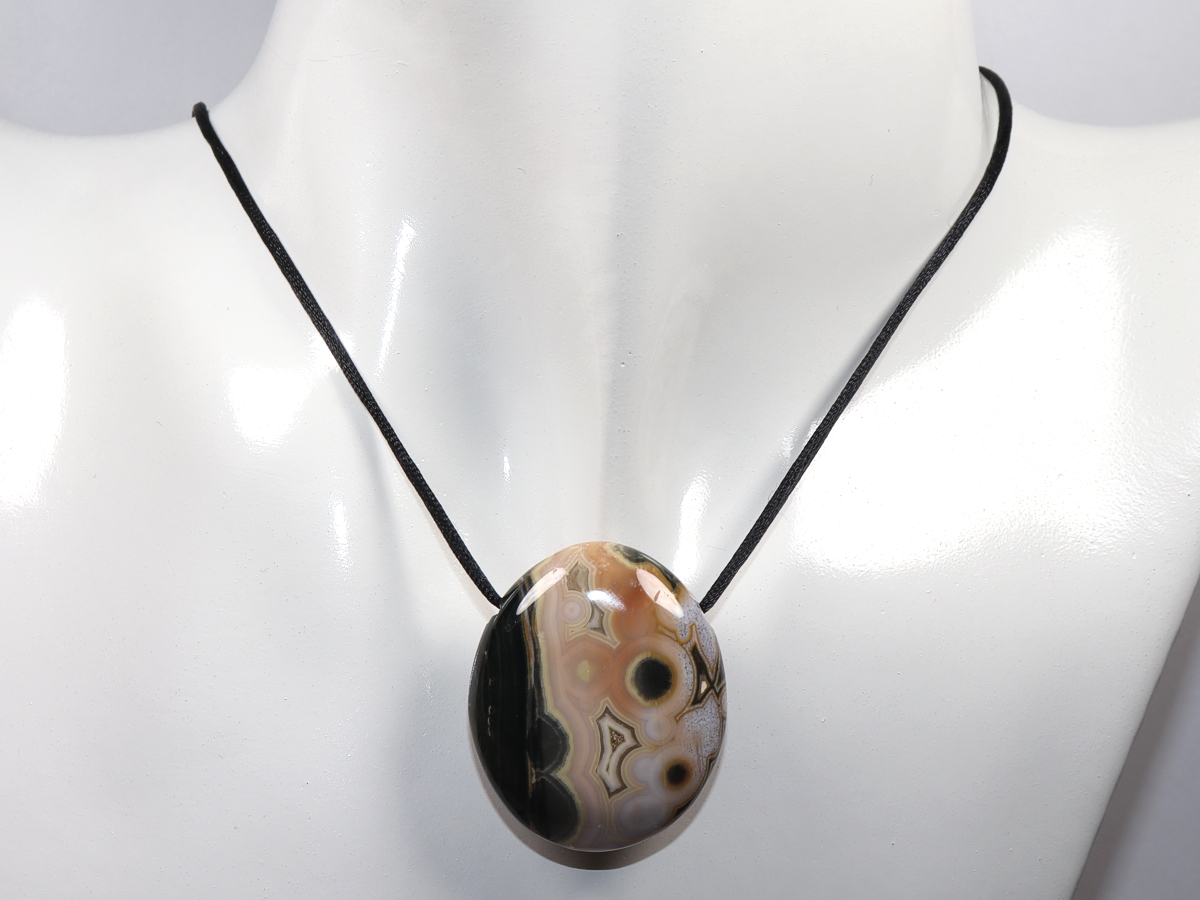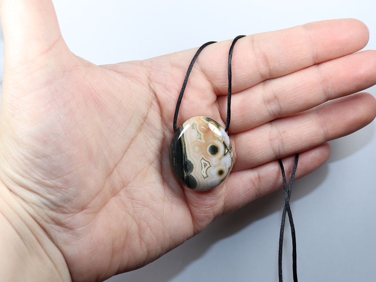 Die Halskette mit Ozeanjaspis wird nach Ihren Angaben individualisiert. Sie haben die Wahl zwischen einem schwarzen Band mit einem Verschluss aus Edelstahl oder einer Kette aus Silber 925.