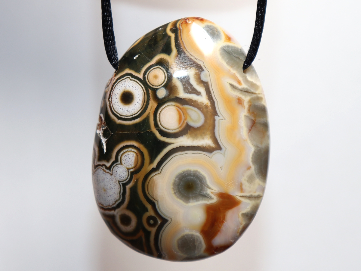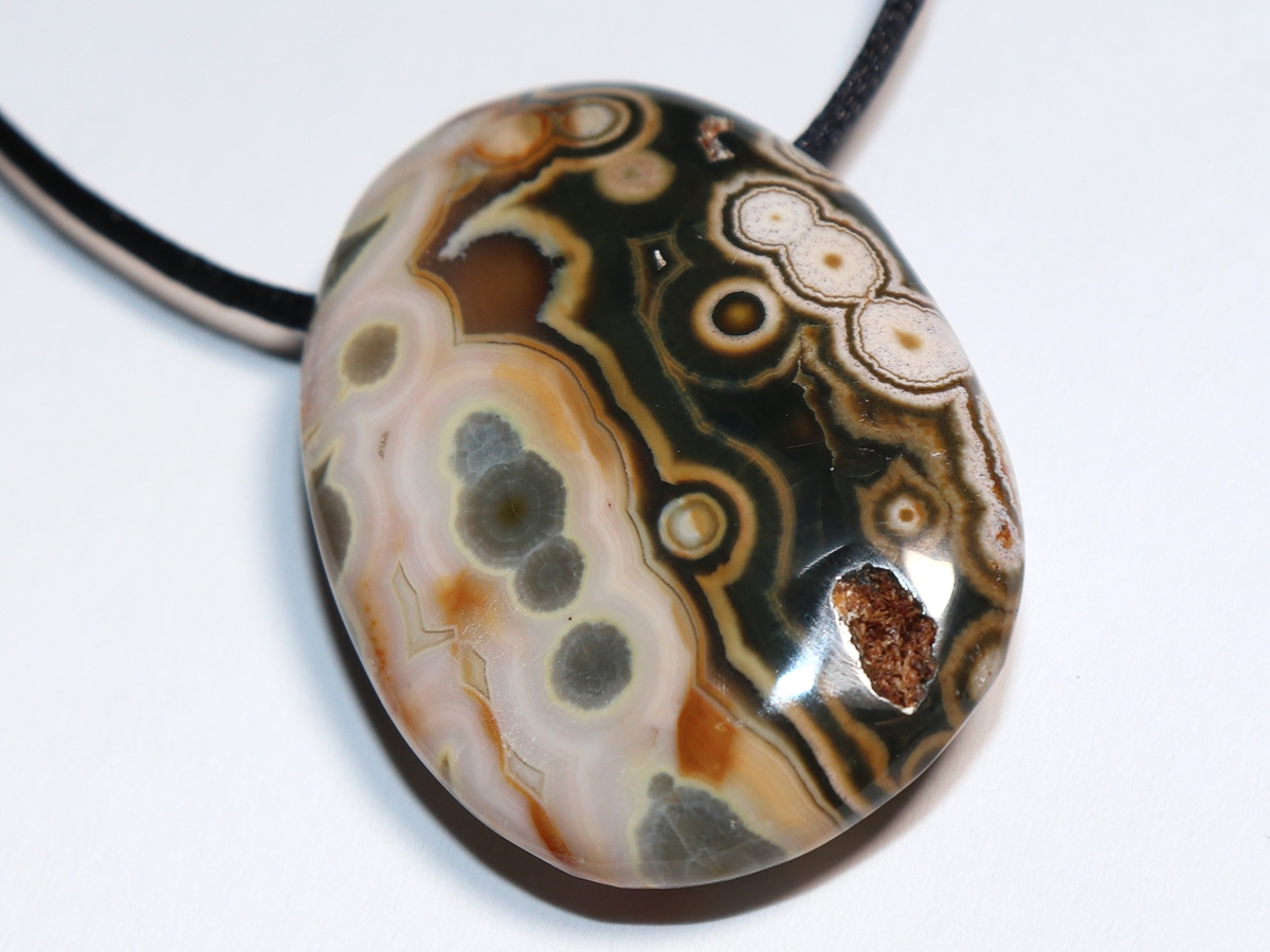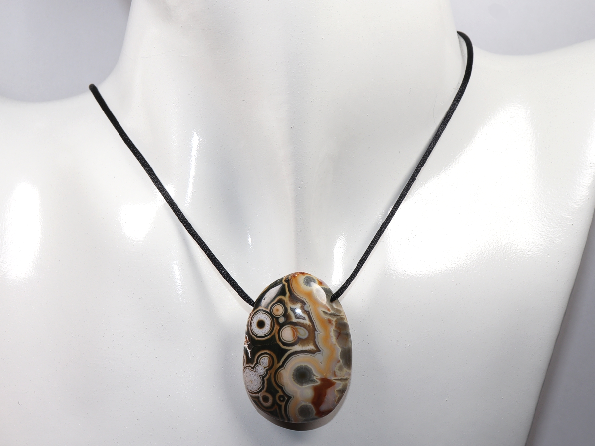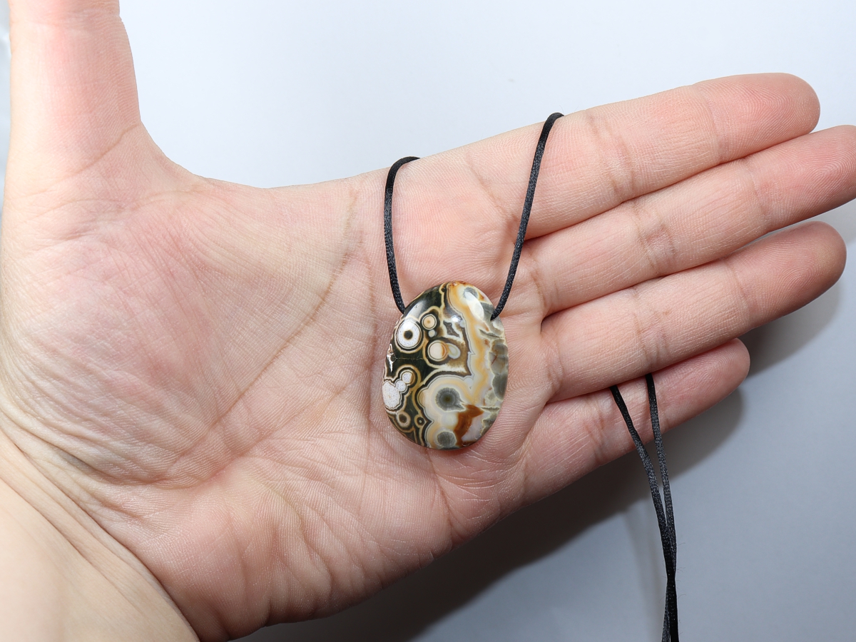 Die Halskette mit Ozeanjaspis wird nach Ihren Angaben individualisiert. Sie haben die Wahl zwischen einem schwarzen Band mit einem Verschluss aus Edelstahl oder einer Kette aus Silber 925.