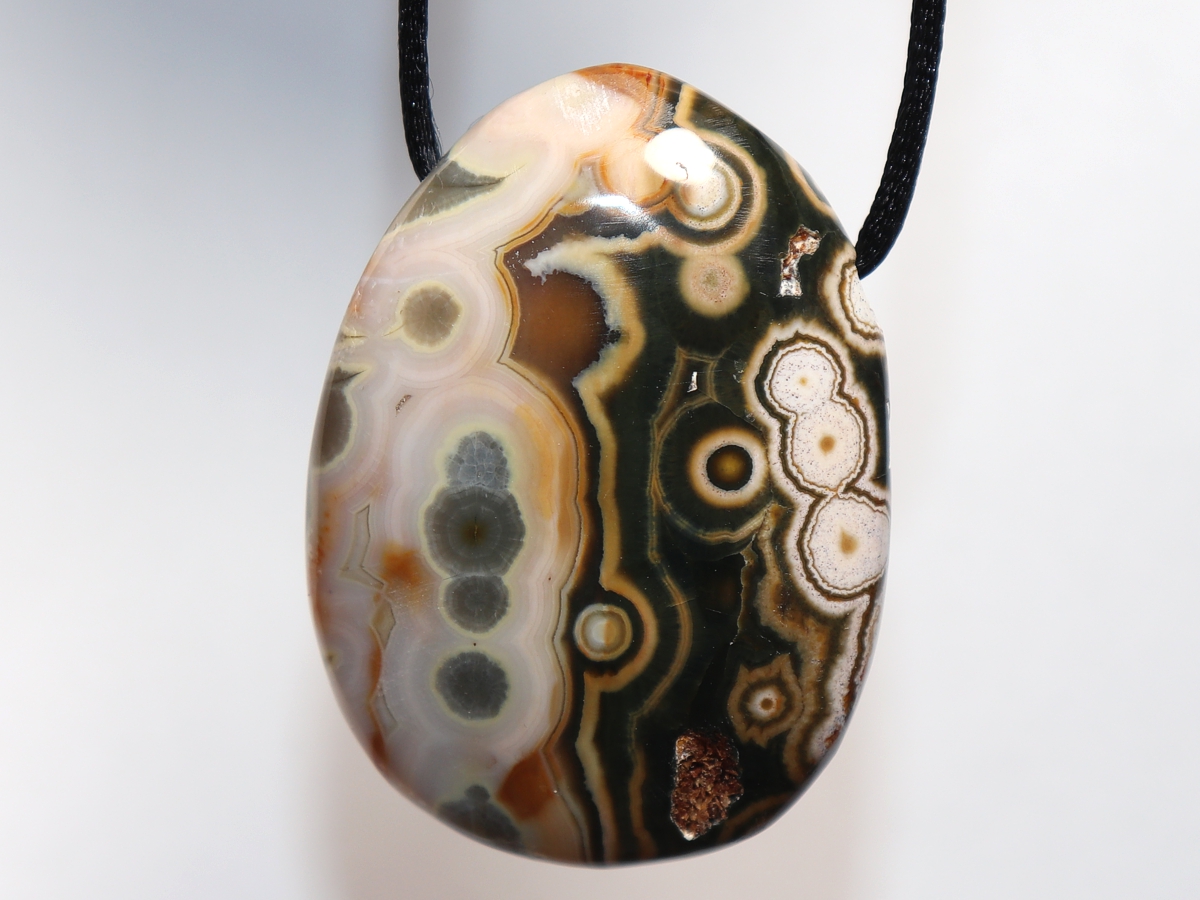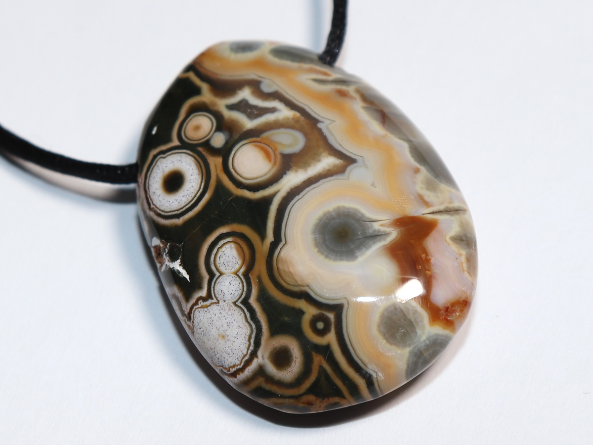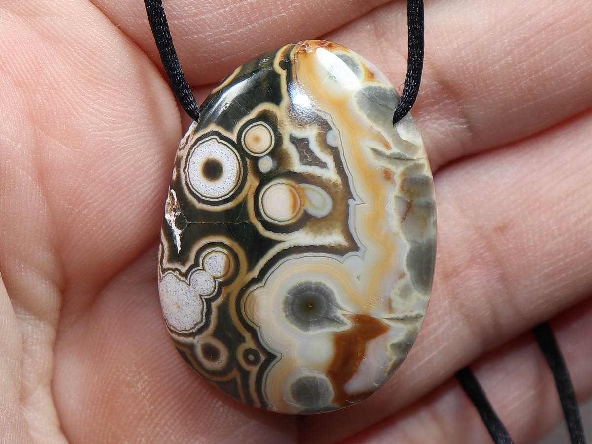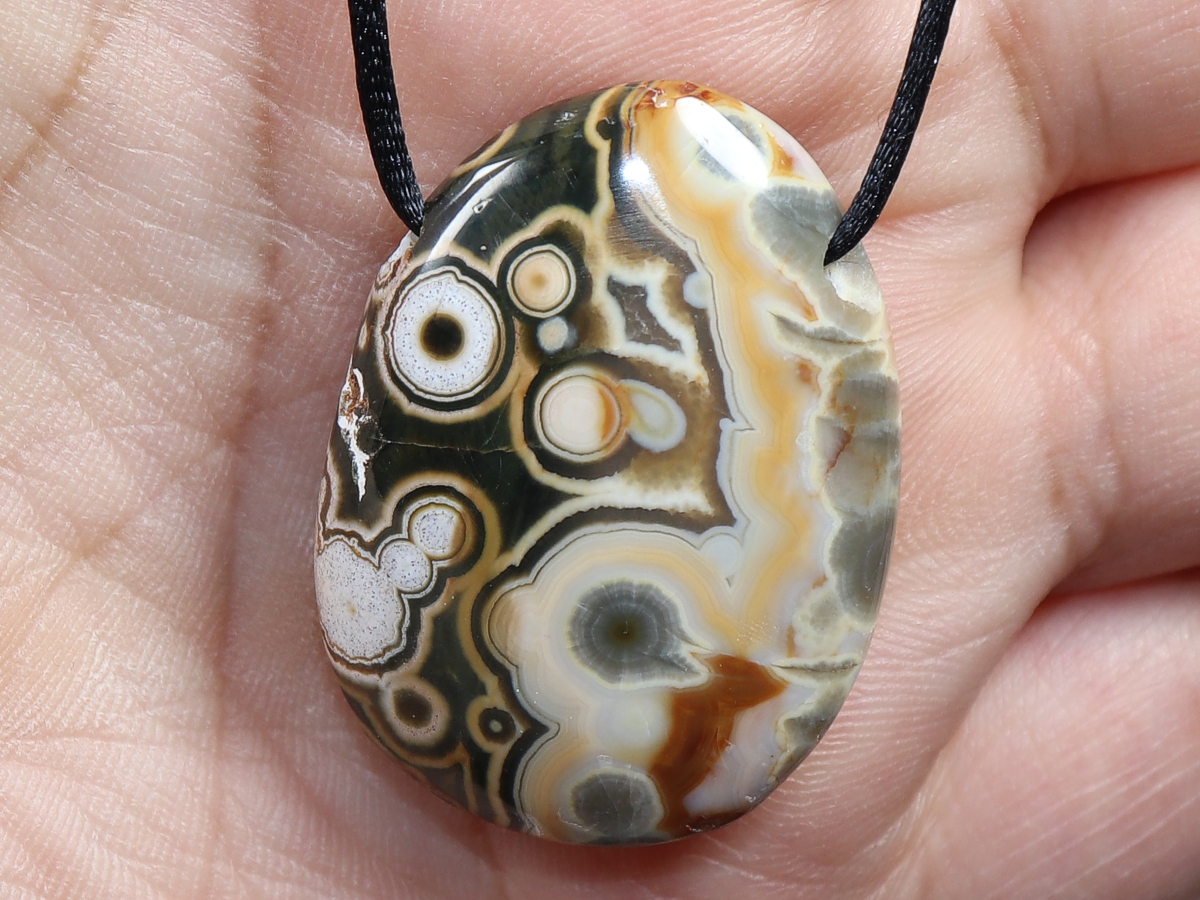 Die Halskette mit Ozeanjaspis wird nach Ihren Angaben individualisiert. Sie haben die Wahl zwischen einem schwarzen Band mit einem Verschluss aus Edelstahl oder einer Kette aus Silber 925.