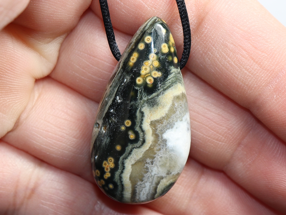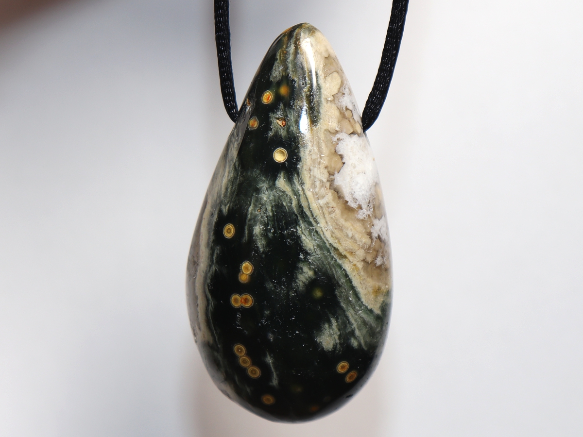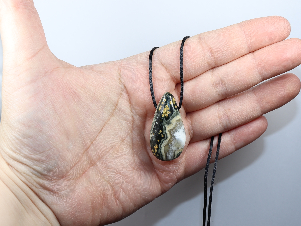 Die Halskette mit Ozeanjaspis wird nach Ihren Angaben individualisiert. Sie haben die Wahl zwischen einem schwarzen Band mit einem Verschluss aus Edelstahl oder einer Kette aus Silber 925.