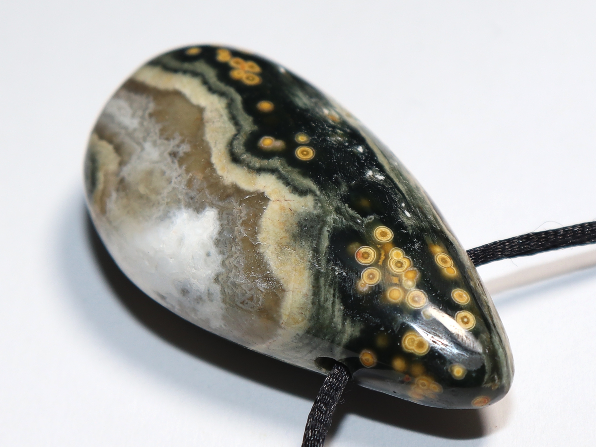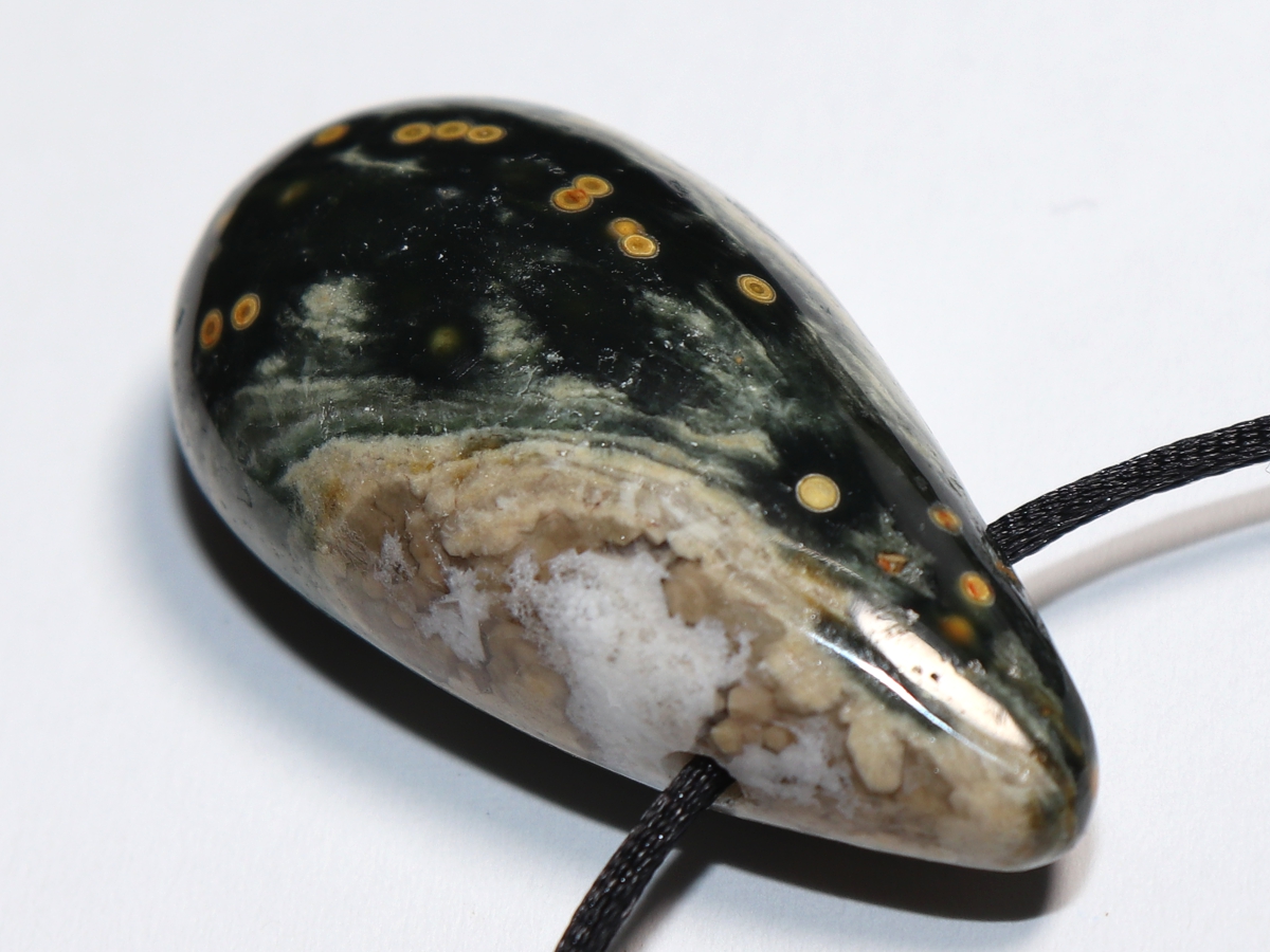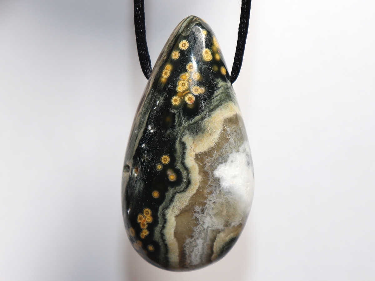 Die Halskette mit Ozeanjaspis wird nach Ihren Angaben individualisiert. Sie haben die Wahl zwischen einem schwarzen Band mit einem Verschluss aus Edelstahl oder einer Kette aus Silber 925.