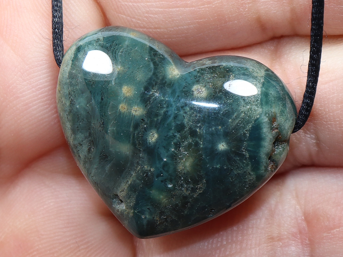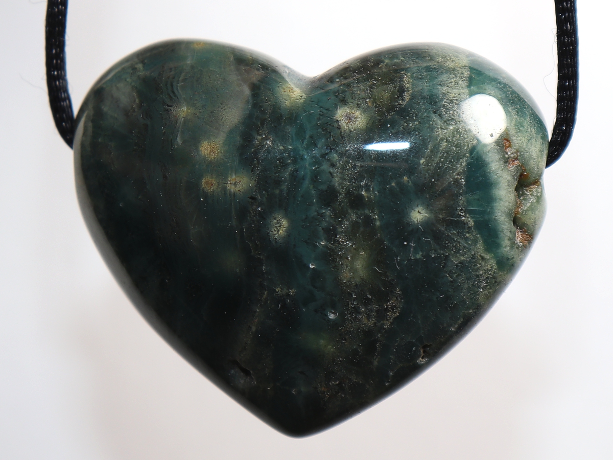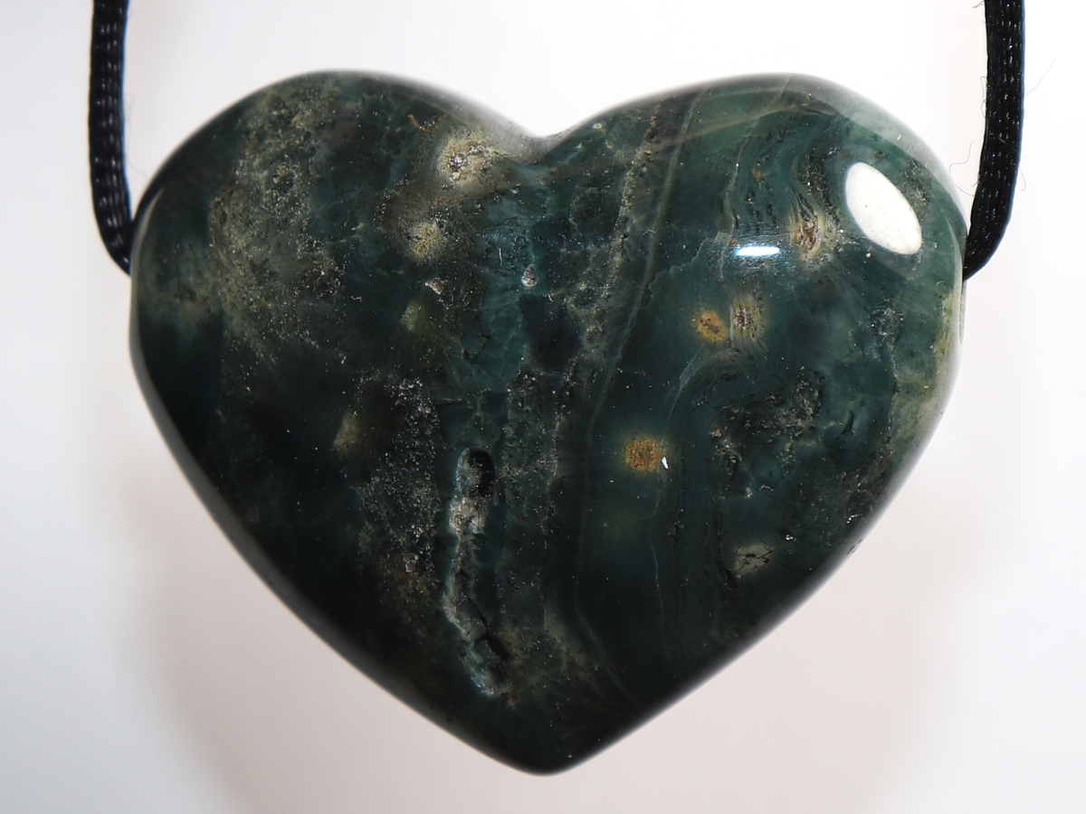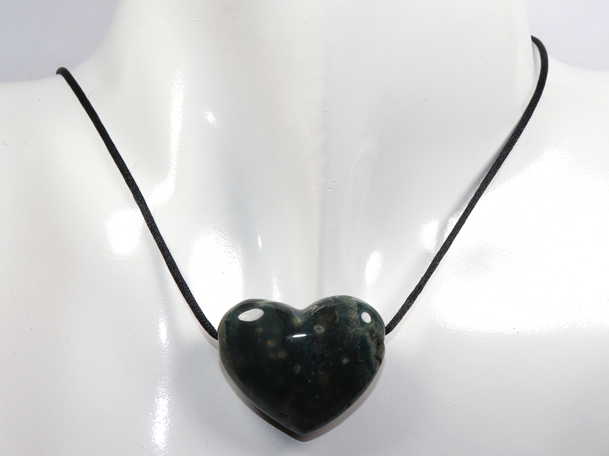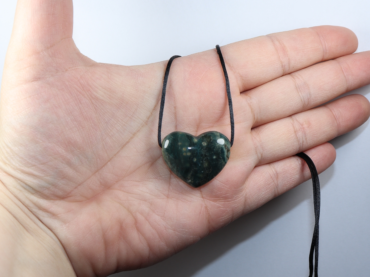 Die Halskette mit dem Herz aus Ozeanjaspis wird nach Ihren Angaben individualisiert. Sie haben die Wahl zwischen einem schwarzen Band mit einem Verschluss aus Edelstahl oder einer Kette aus Silber 925.