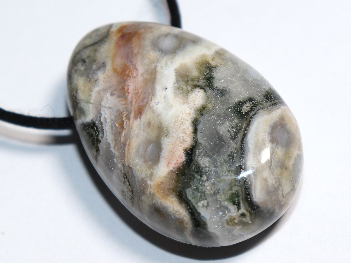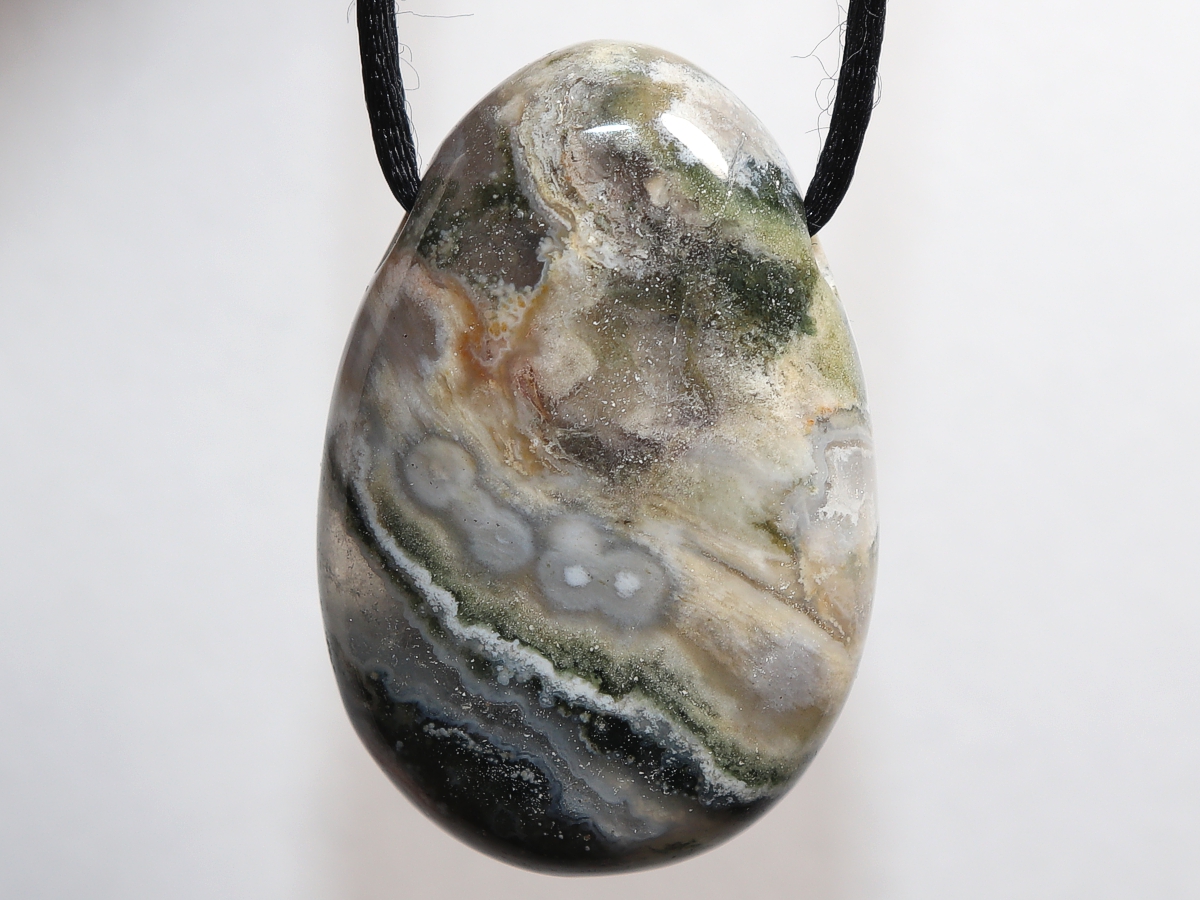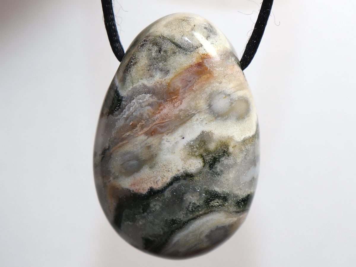 Die Halskette mit Ozeanjaspis wird nach Ihren Angaben individualisiert. Sie haben die Wahl zwischen einem schwarzen Band mit einem Verschluss aus Edelstahl oder einer Kette aus Silber 925.