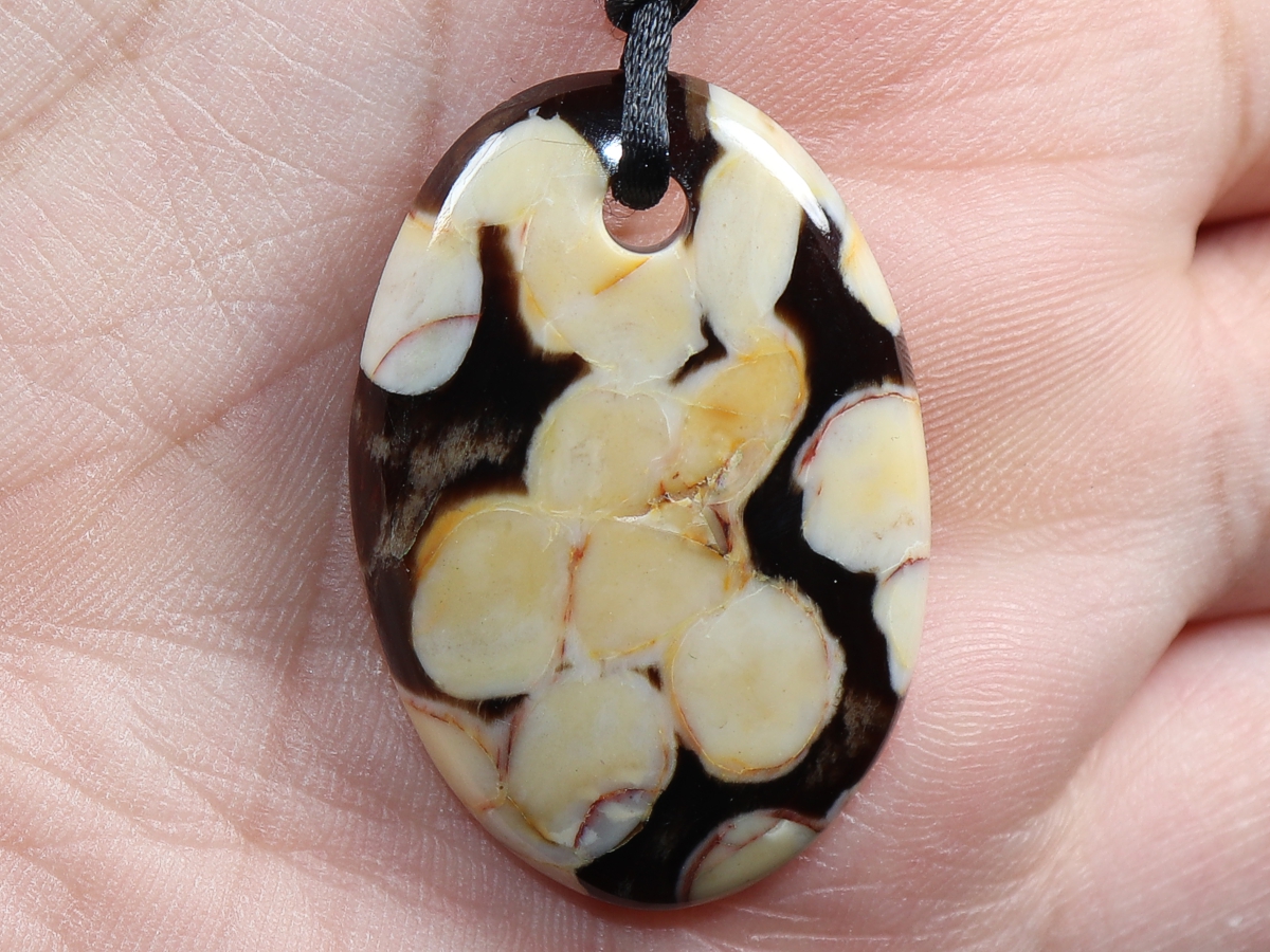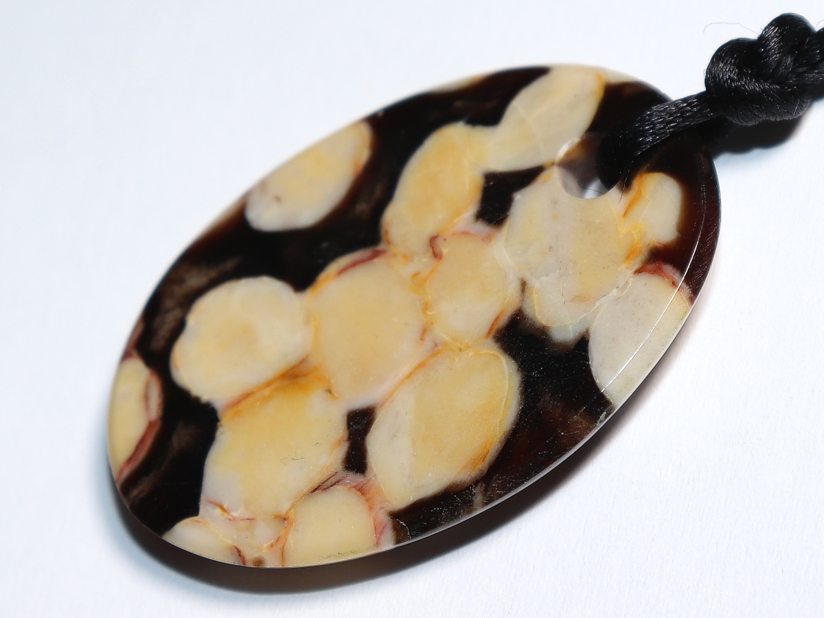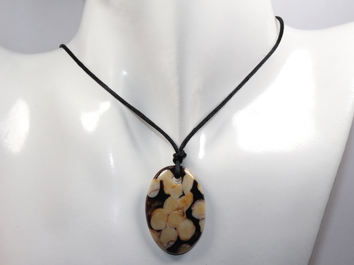 Die Halskette mit Peanut-Wood-Jaspis und einem schwarzen Band wird nach Ihren Angaben individualisiert. Der Verschluss ist aus Edelstahl.